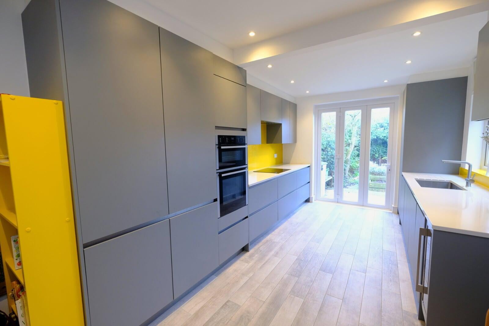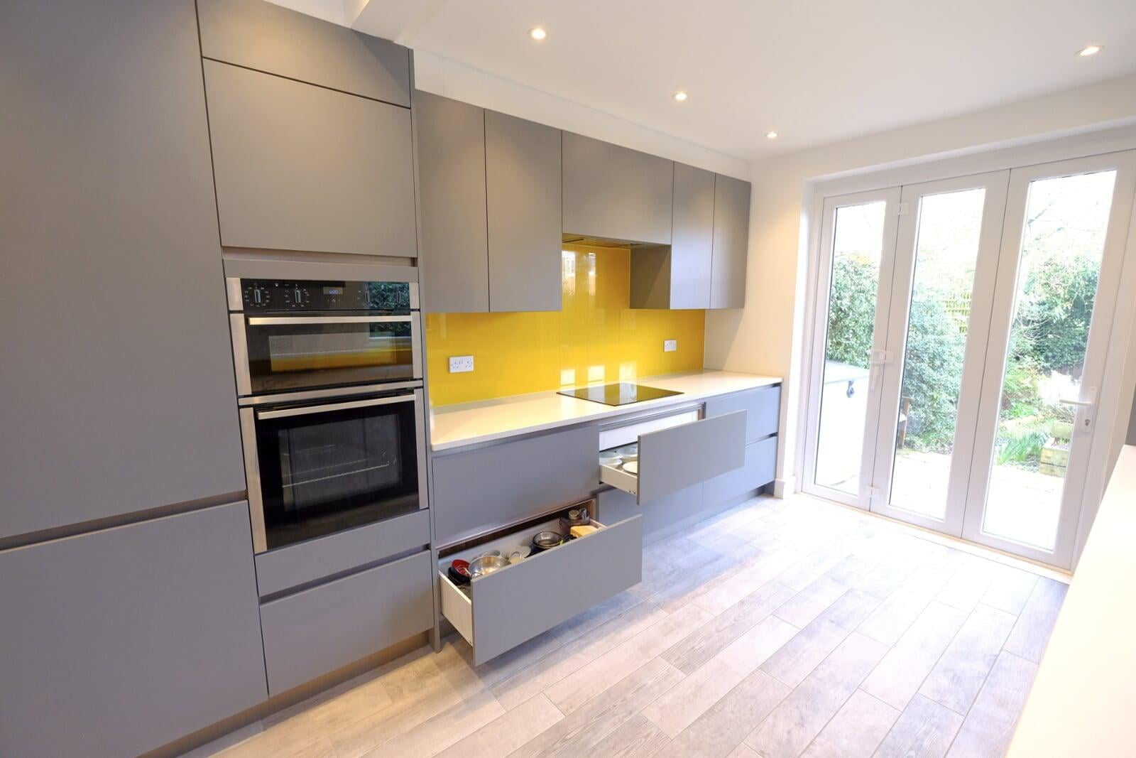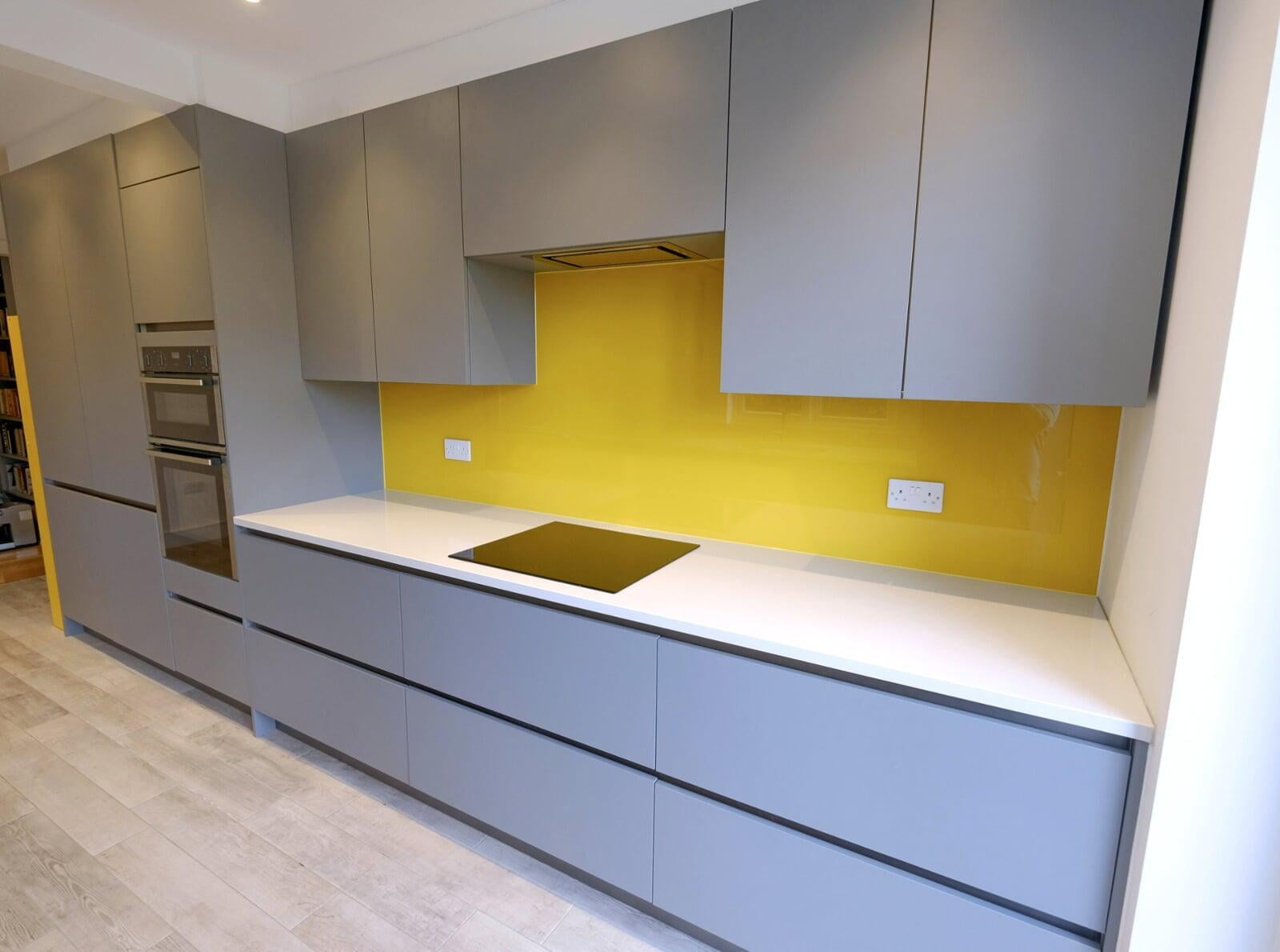 I’m delighted at how this kitchen turned out. It has completely transformed from its original form of dated blue cabinets that were pretty much falling apart. It had a horrible layout and the whole room was dreary and uninviting. This wonderful makeover has seen Dust Grey MFC handleless cabinetry teamed with a gorgeous Compac Alaska quartz worktop and a Golden Yellow glass splashback. The client has put in a new window where the sink now is and put in full doors at the back of the house to let in so much more light. All of the cabinetry is integrated and this layout is highly efficient and includes everything that he needs in his kitchen. My client loves the colour yellow and I think the glass splashback is a great addition to the scheme here.