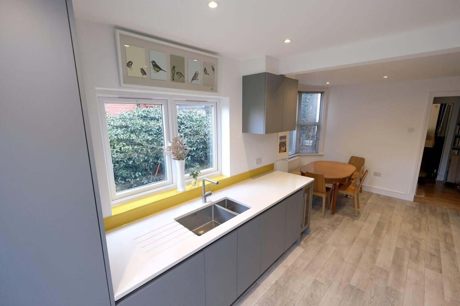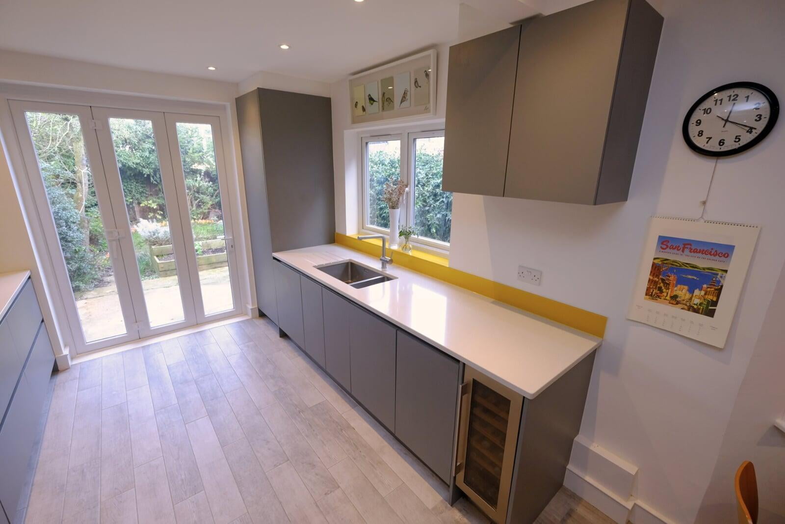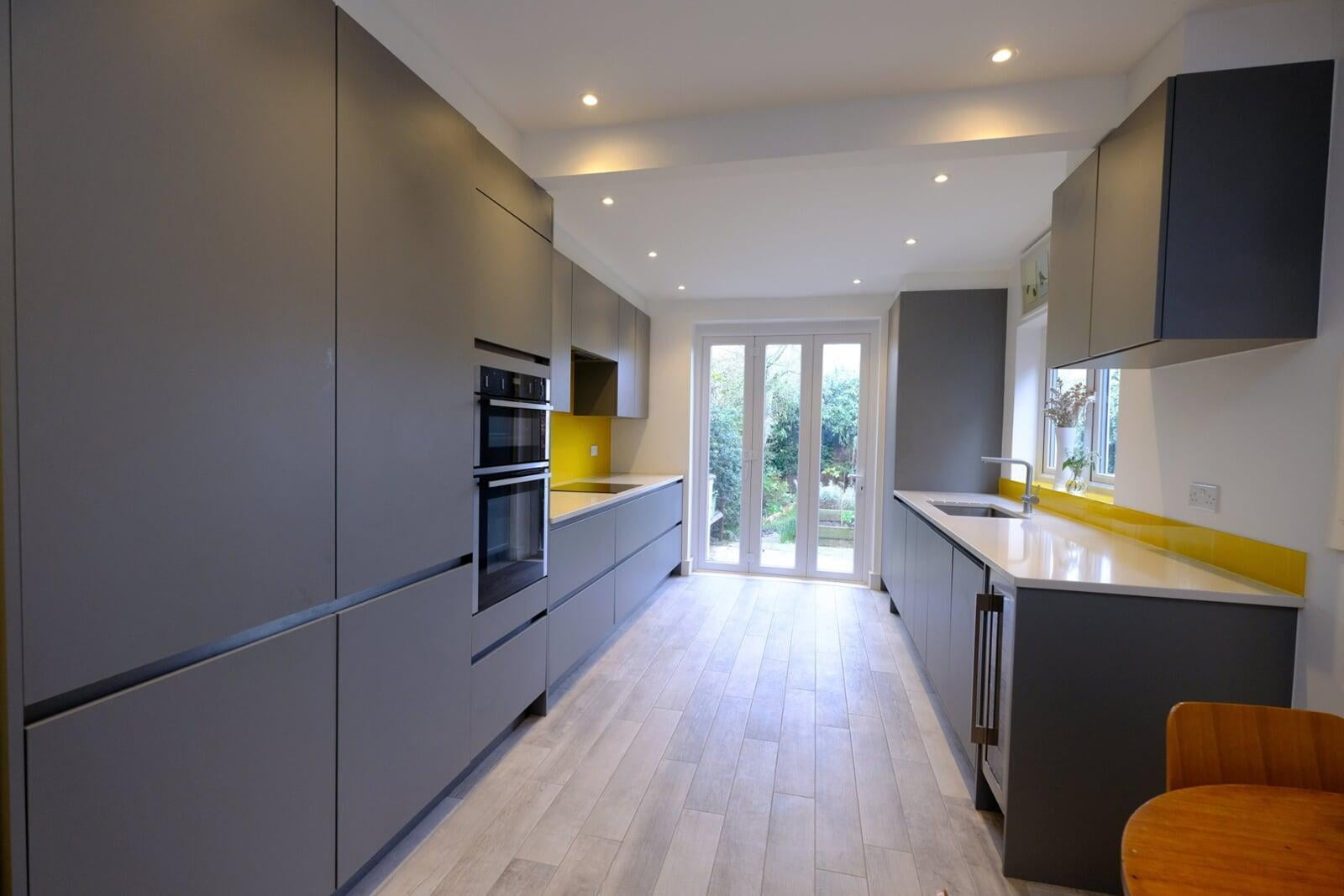I’m delighted at how this kitchen turned out. It has completely transformed from its original form of dated blue cabinets that were pretty much falling apart. It had a horrible layout and the whole room was dreary and uninviting. This wonderful makeover has seen Dust Grey MFC handleless cabinetry teamed with a gorgeous Compac Alaska quartz worktop and a Golden Yellow glass splashback. The client has put in a new window where the sink now is and put in full doors at the back of the house to let in so much more light. All of the cabinetry is integrated and this layout is highly efficient and includes everything that he needs in his kitchen. My client loves the colour yellow and I think the glass splashback is a great addition to the scheme here.