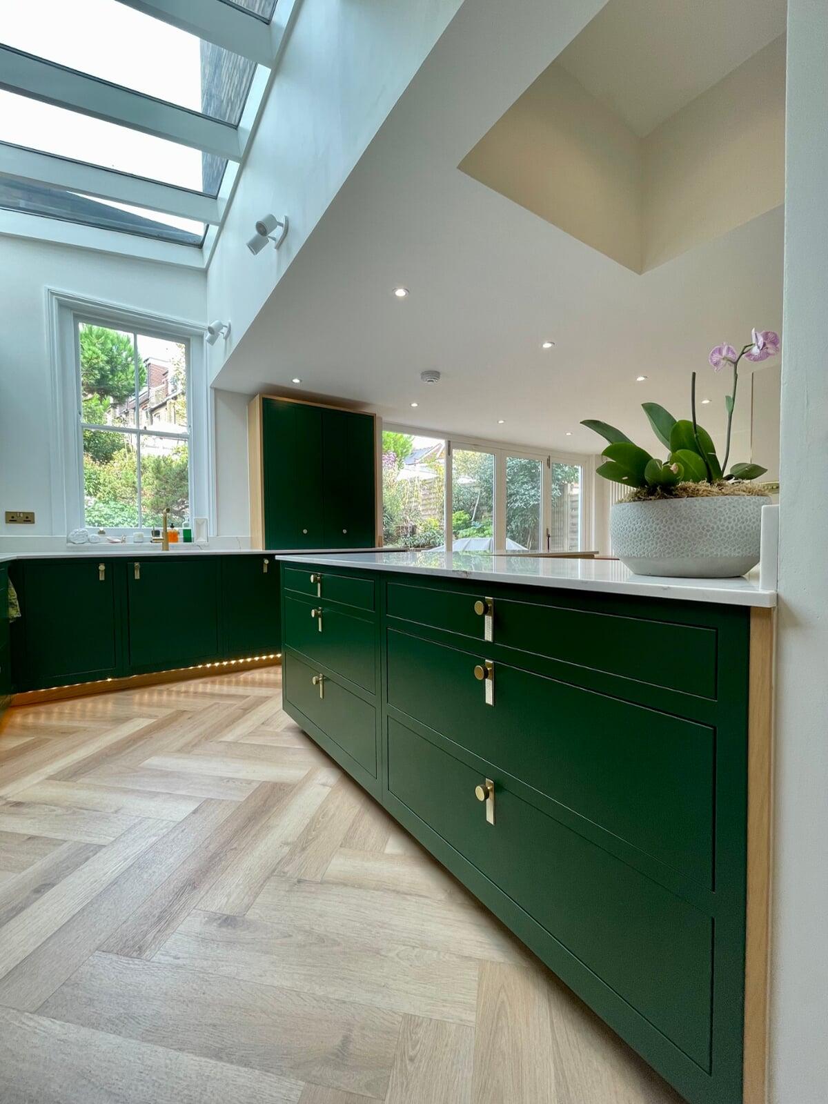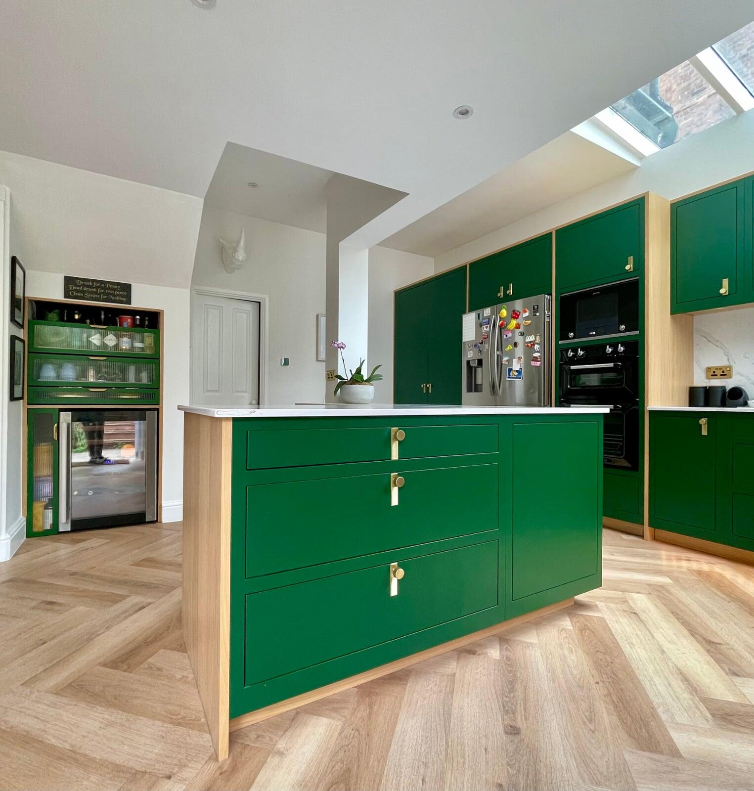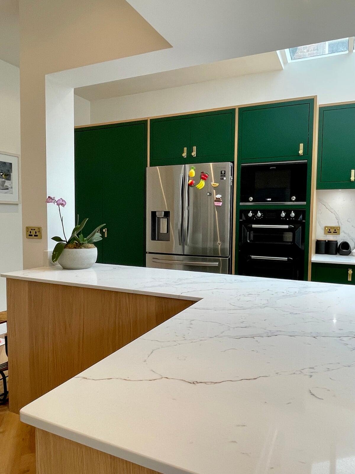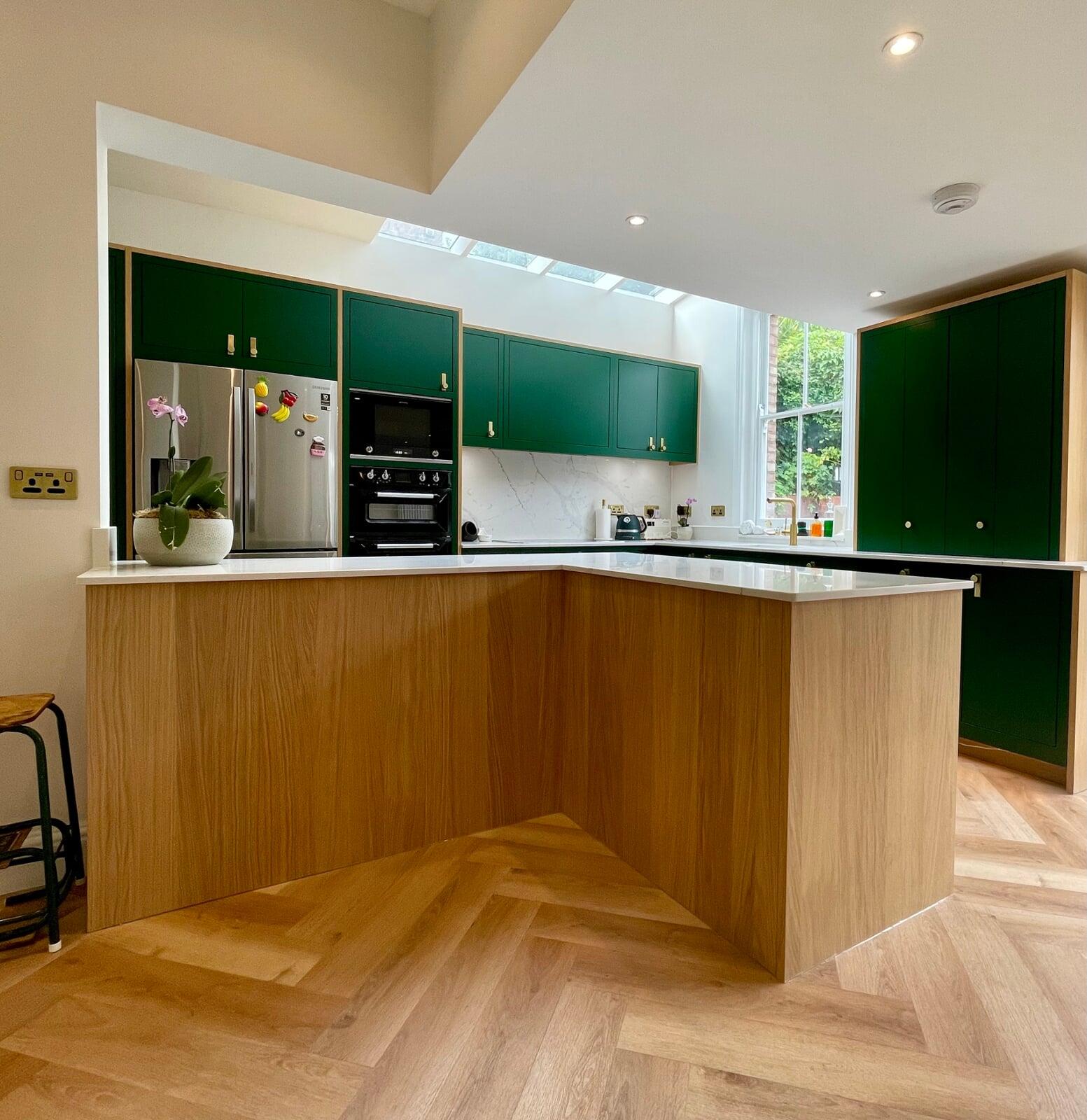 My client went with a modern twist to a classic style by selecting in-frame units but with a slab door rather than the traditional shaker door. This was painted in Little Greene’s Puck which is a rich and inviting green with a botanical hue to it. My client has a beautiful garden and was keen to connect the two spaces. The connection to nature is utilised further with the stunning 25mm thick real oak veneer panels we incorporated throughout the kitchen to frame the units. It’s also a particularly practical and robust material to use for end panels and plinths.