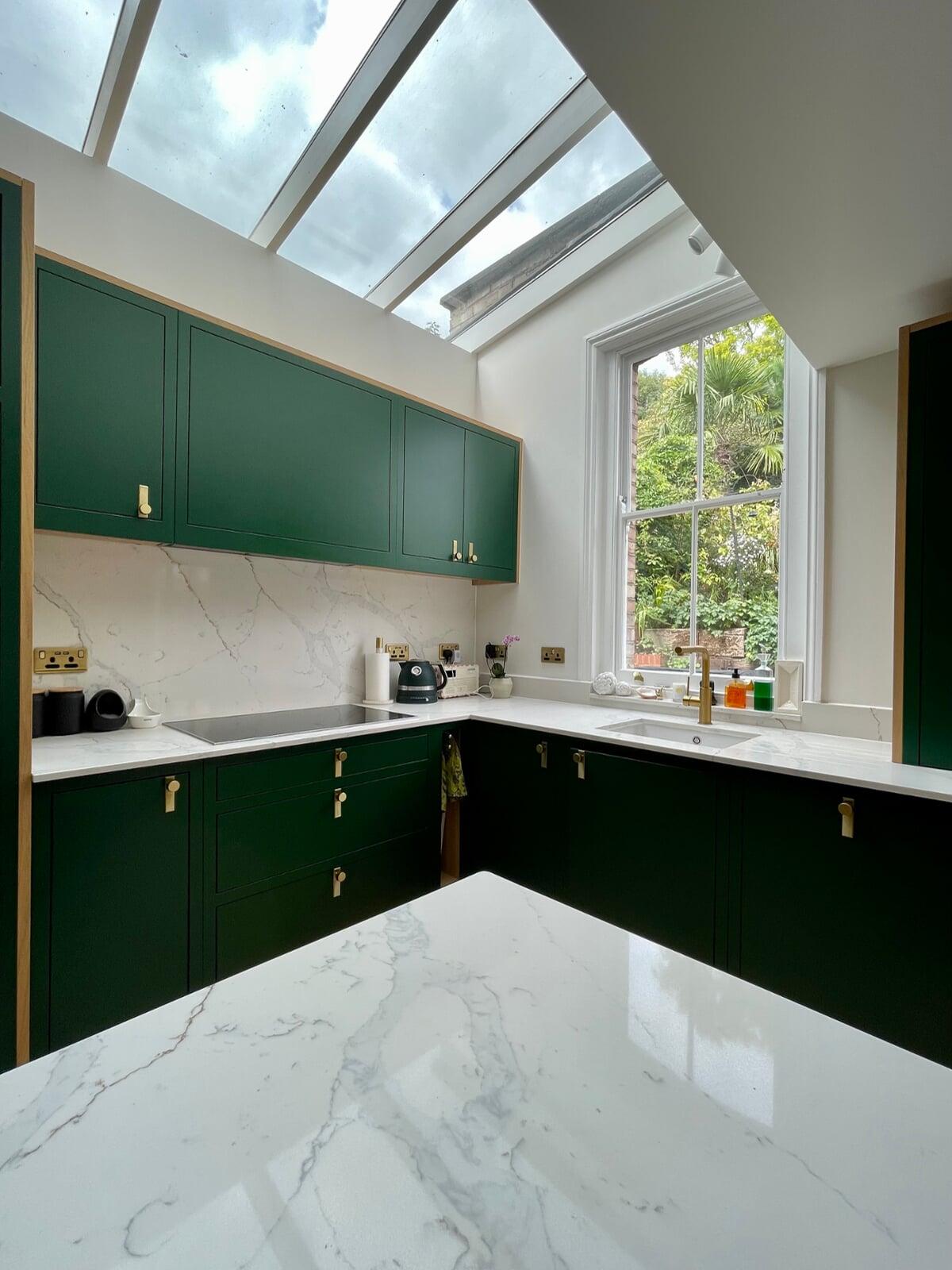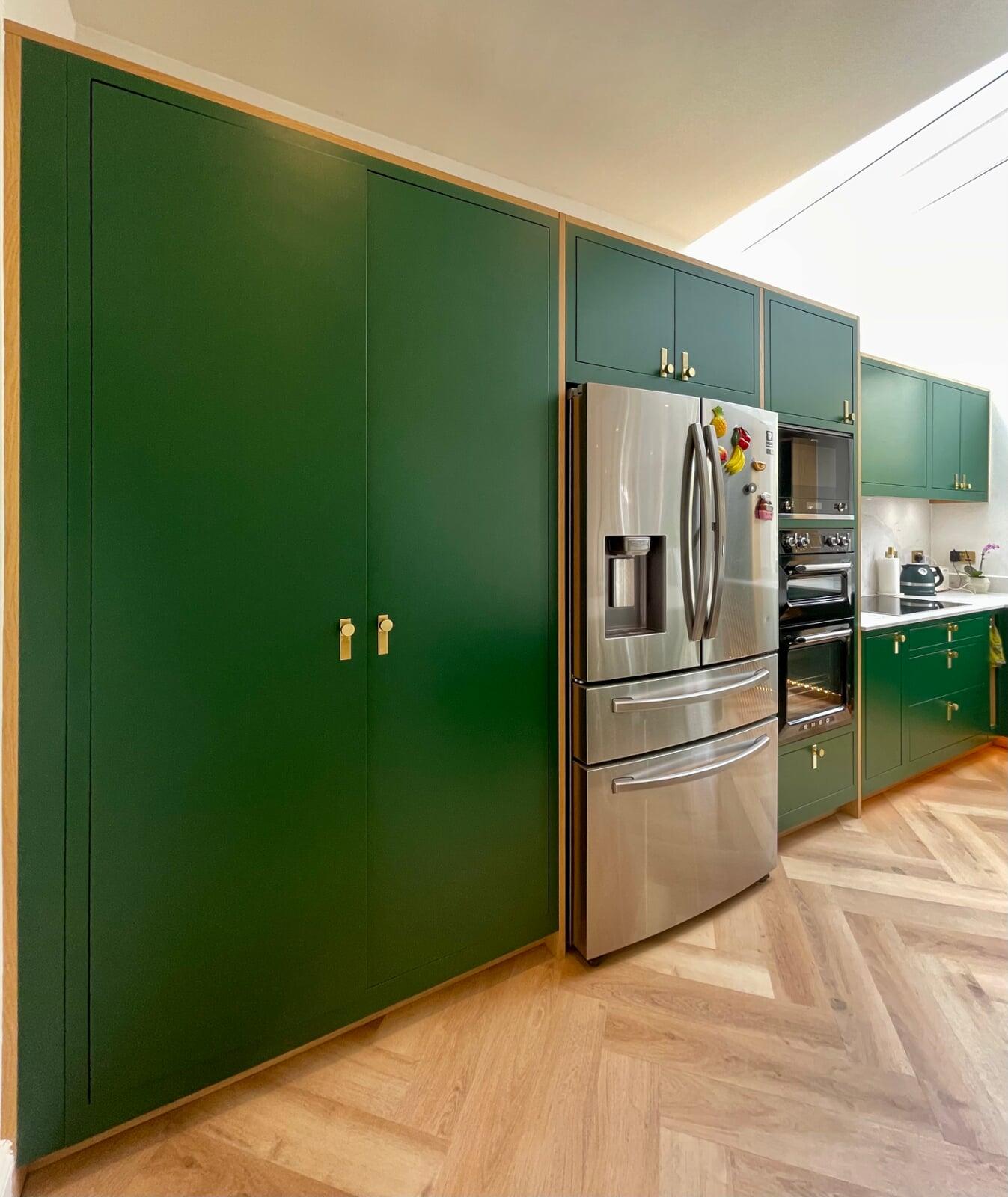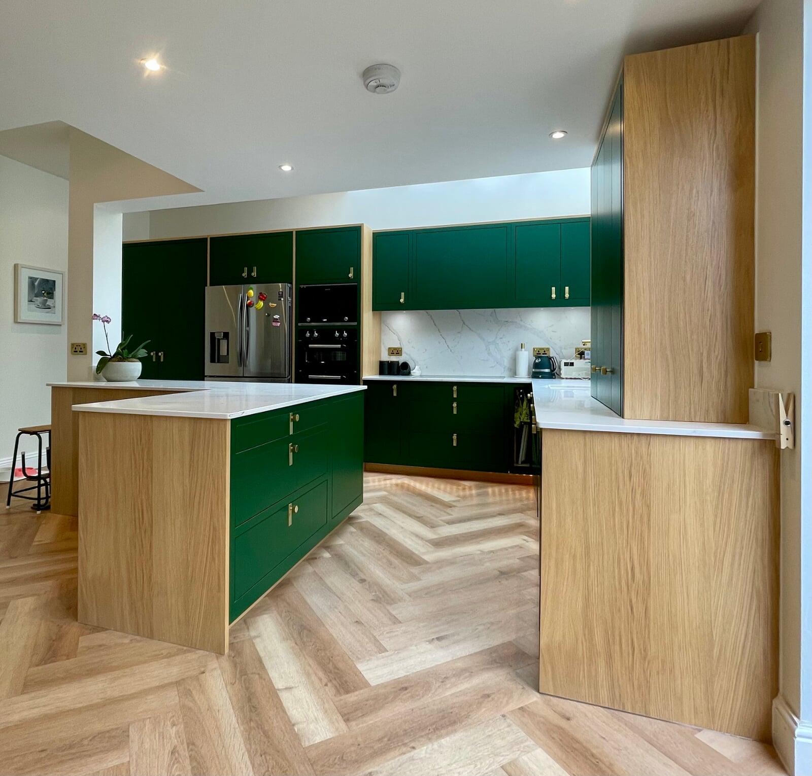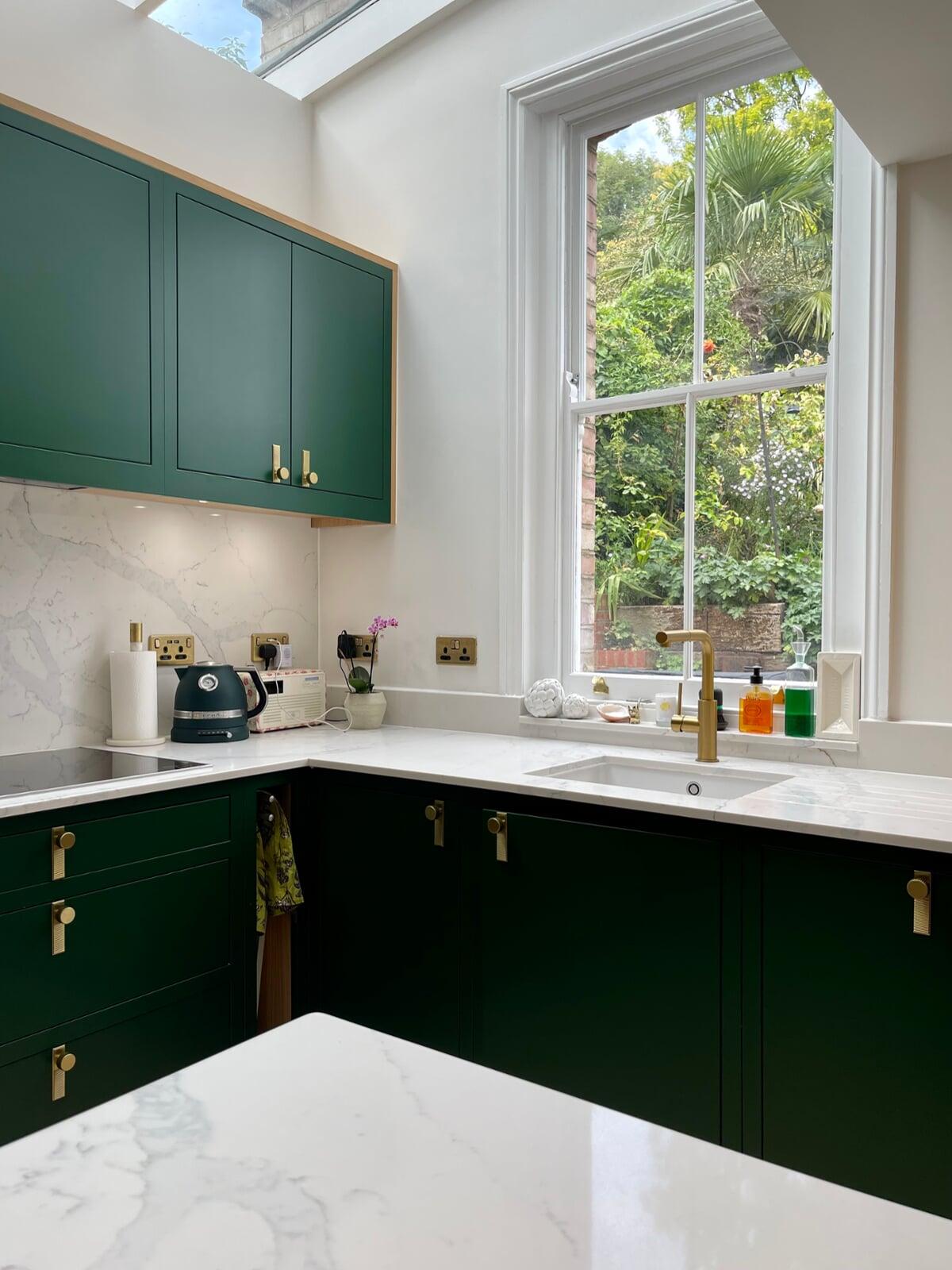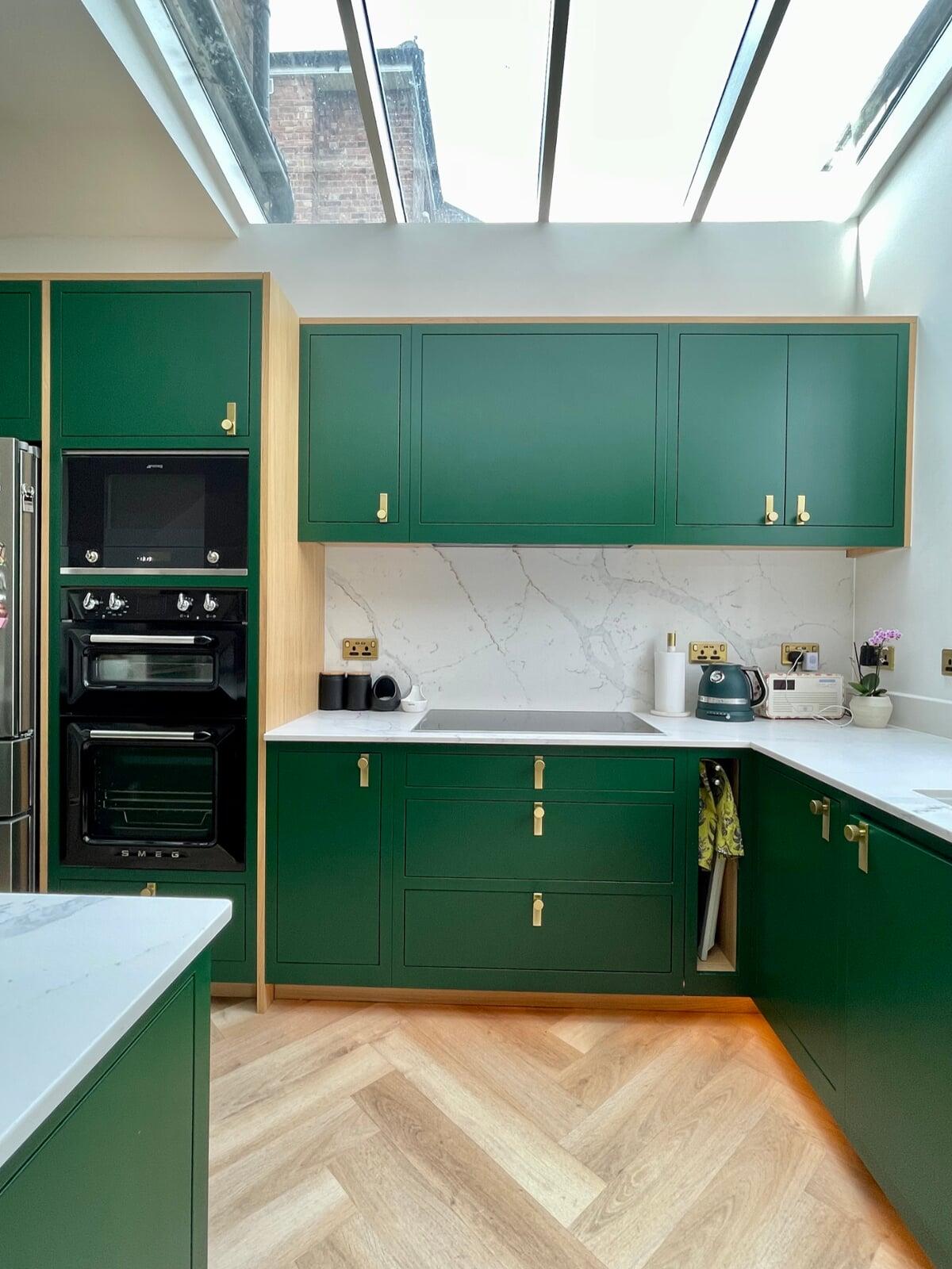 My client went with a modern twist to a classic style by selecting in-frame units but with a slab door rather than the traditional shaker door. This was painted in Little Greene’s Puck which is a rich and inviting green with a botanical hue to it. My client has a beautiful garden and was keen to connect the two spaces. The connection to nature is utilised further with the stunning 25mm thick real oak veneer panels we incorporated throughout the kitchen to frame the units. It’s also a particularly practical and robust material to use for end panels and plinths.