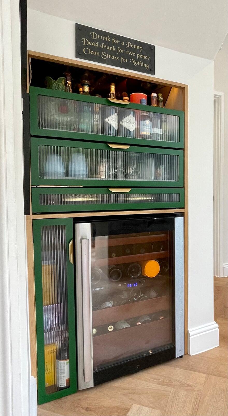 We accessorised with elegant brass accents for the handles and tap. The beautiful Nile Calacatta Gold worktop looks great on the island and is used as a full height backsplash behind the hob. My client had fun with her finishes and had a bar area with fluted glass drawers made to match the kitchen.