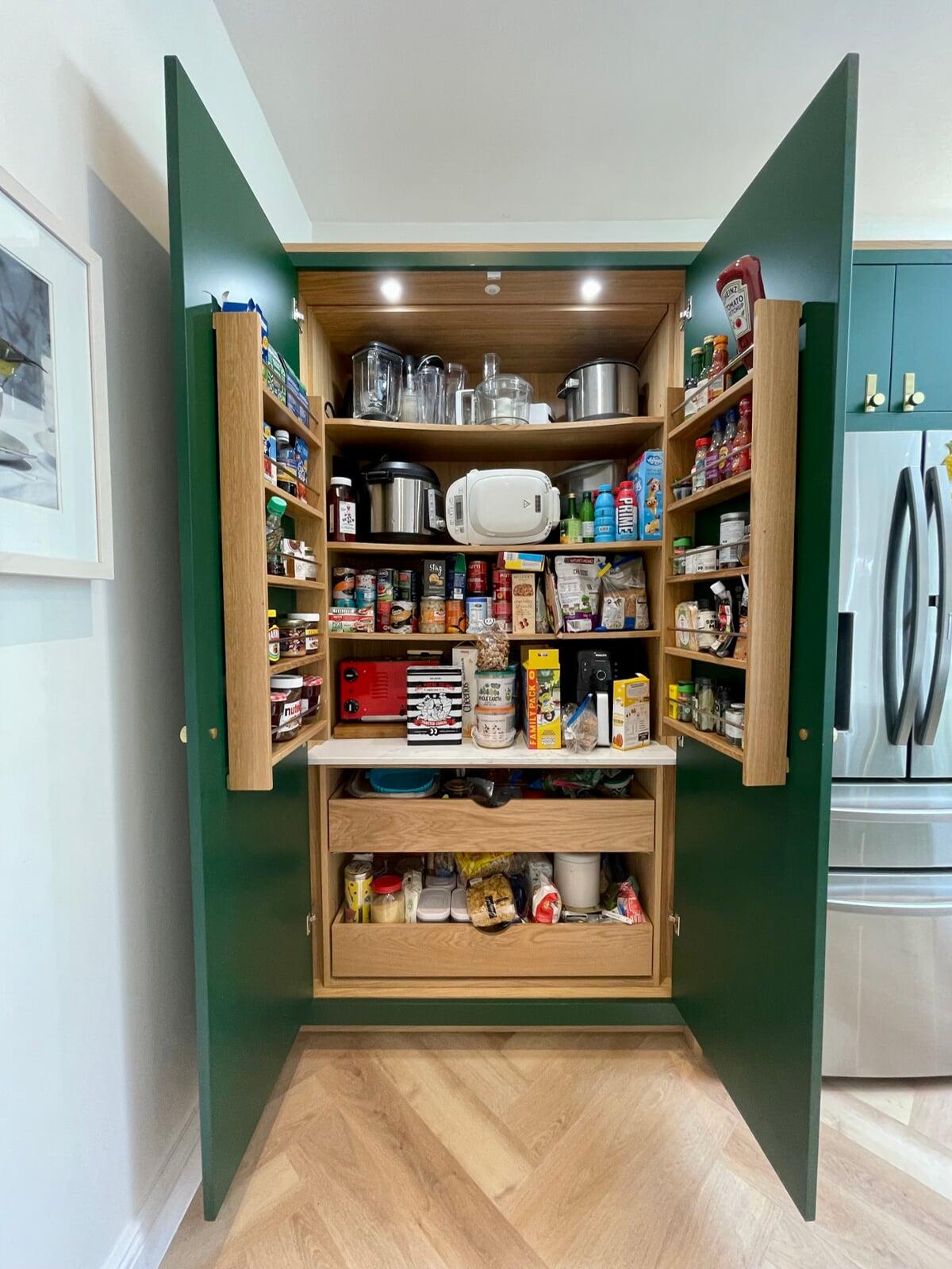 Thankfully, my client was totally on board with the layout, and we set about ensuring the storage and design would be everything that she wanted. We incorporated some super storage including a beautiful double pantry unit to house all the food and small appliances. There is also a bifolding dresser unit that has plugs inside it and is used to ensure appliances are hidden from view and aren’t cluttering up the work surface.