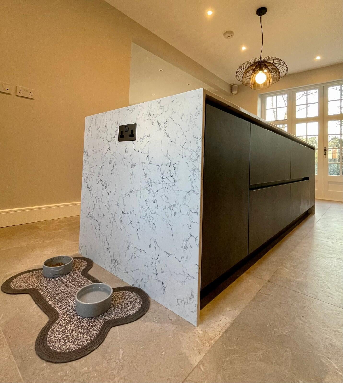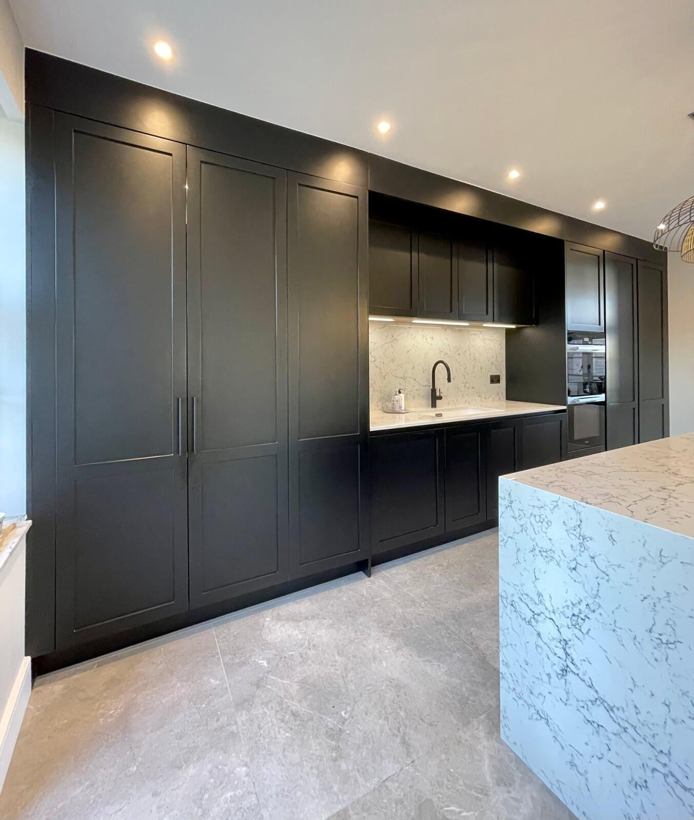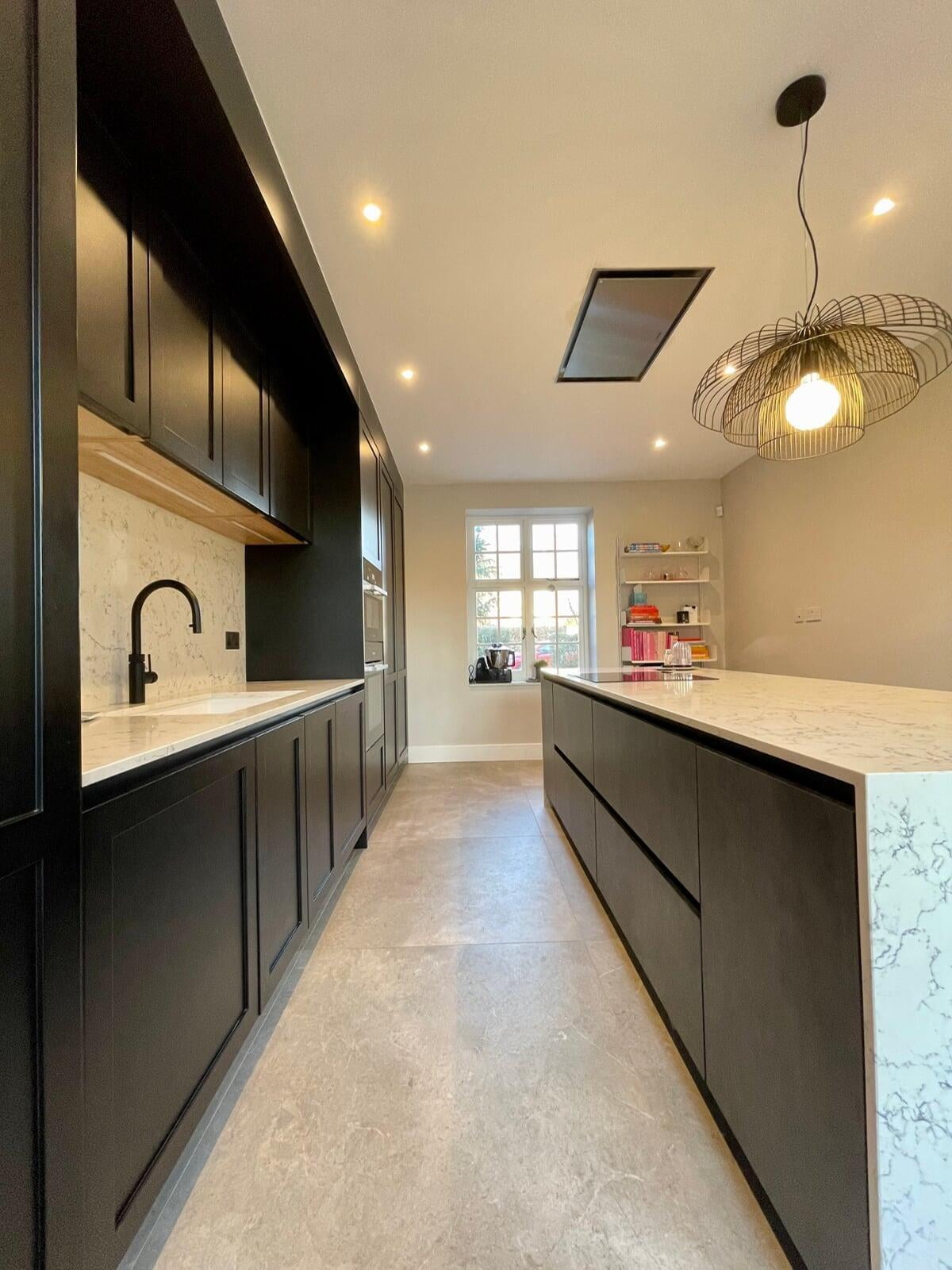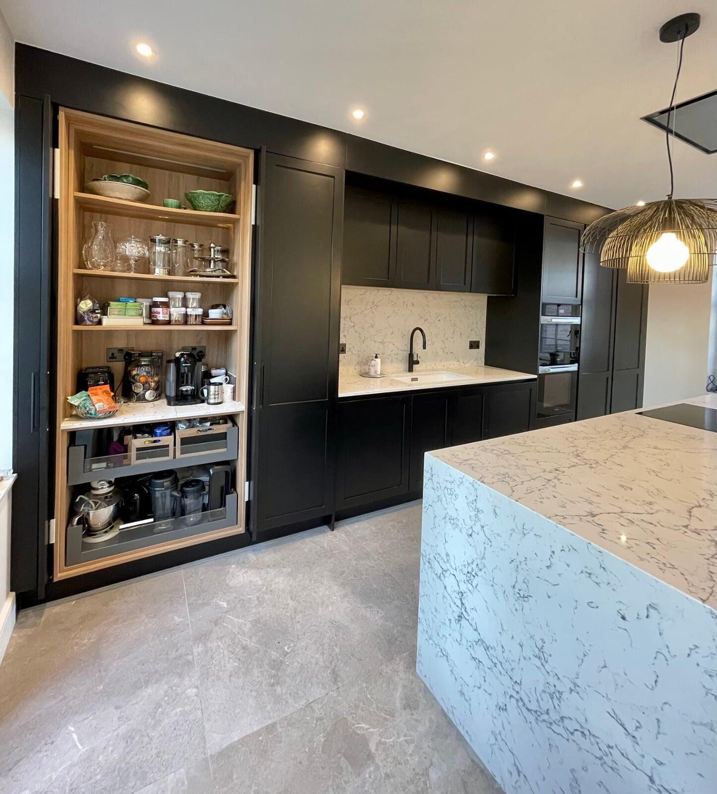 This beautiful kitchen belongs to a very talented chef and caterer.  She has a large social media following where her kitchen and her delicious food is regularly featured.  Her new kitchen needed to be both beautiful and extremely functional to meet all her work requirements.  My client had a very specific idea of the look she wanted to achieve, and it was a wonderful opportunity to be able to bring that vision to life.  The kitchen has smooth painted shaker style "handleless" units with a concrete effect laminate island.  The worktop is a stunning Caesarstone White Attica.  The black accessories elevate the overall look.  We spent a lot of time working together on the plans and details of this kitchen and I’m delighted with the result.  Most importantly, my client loves working in such a gorgeous space and her catering business is thriving.