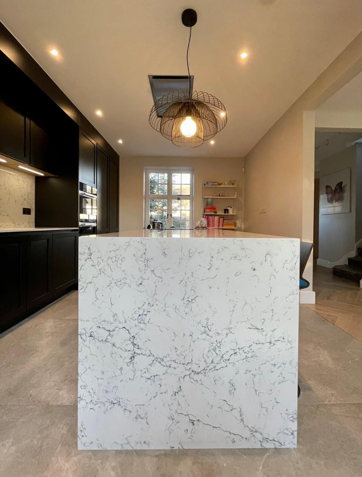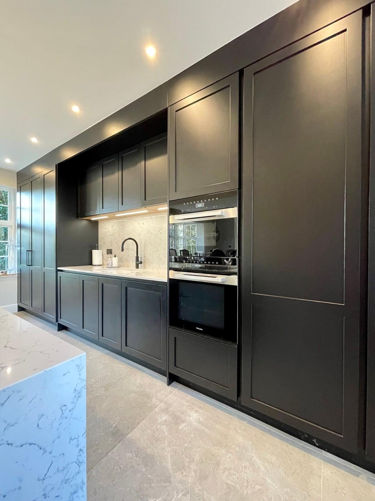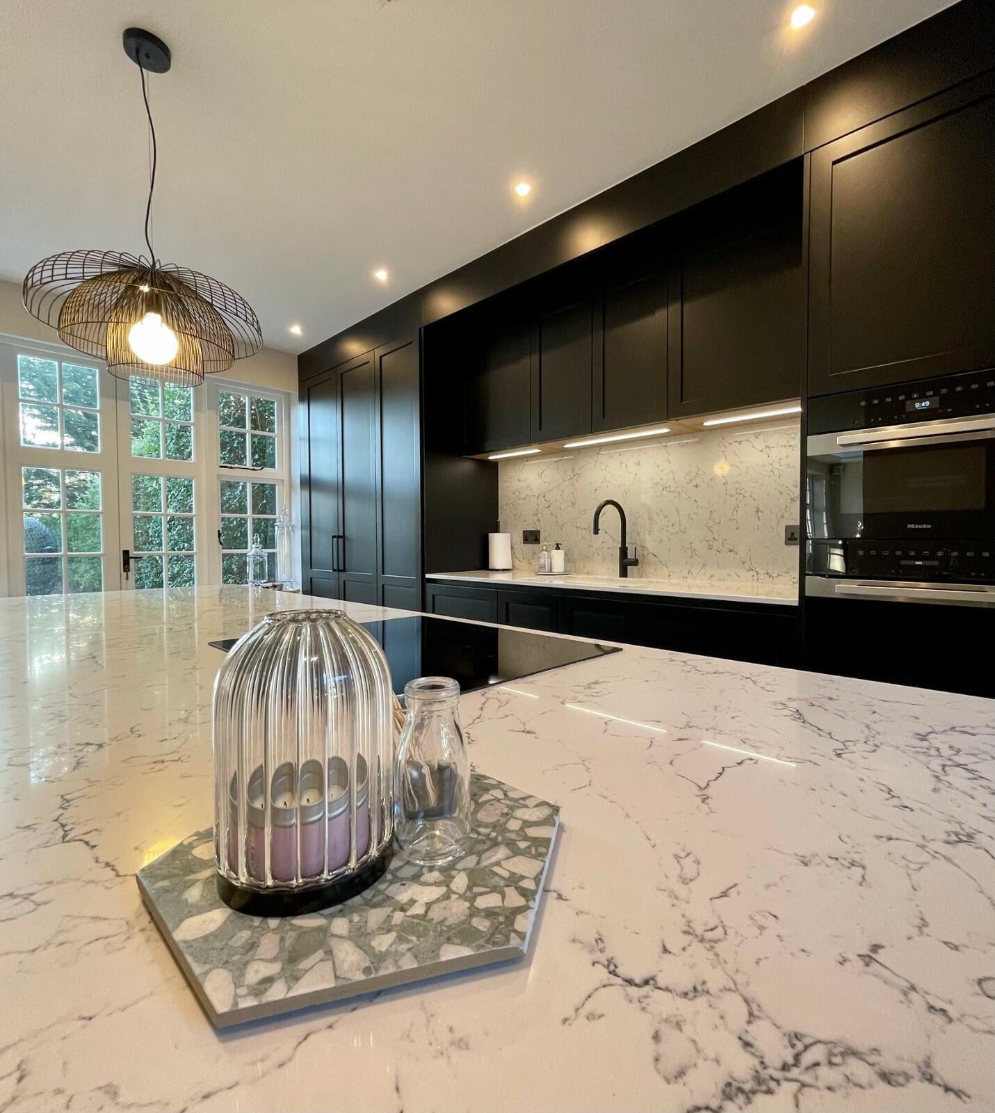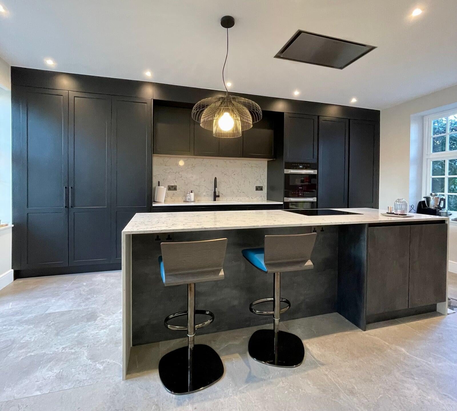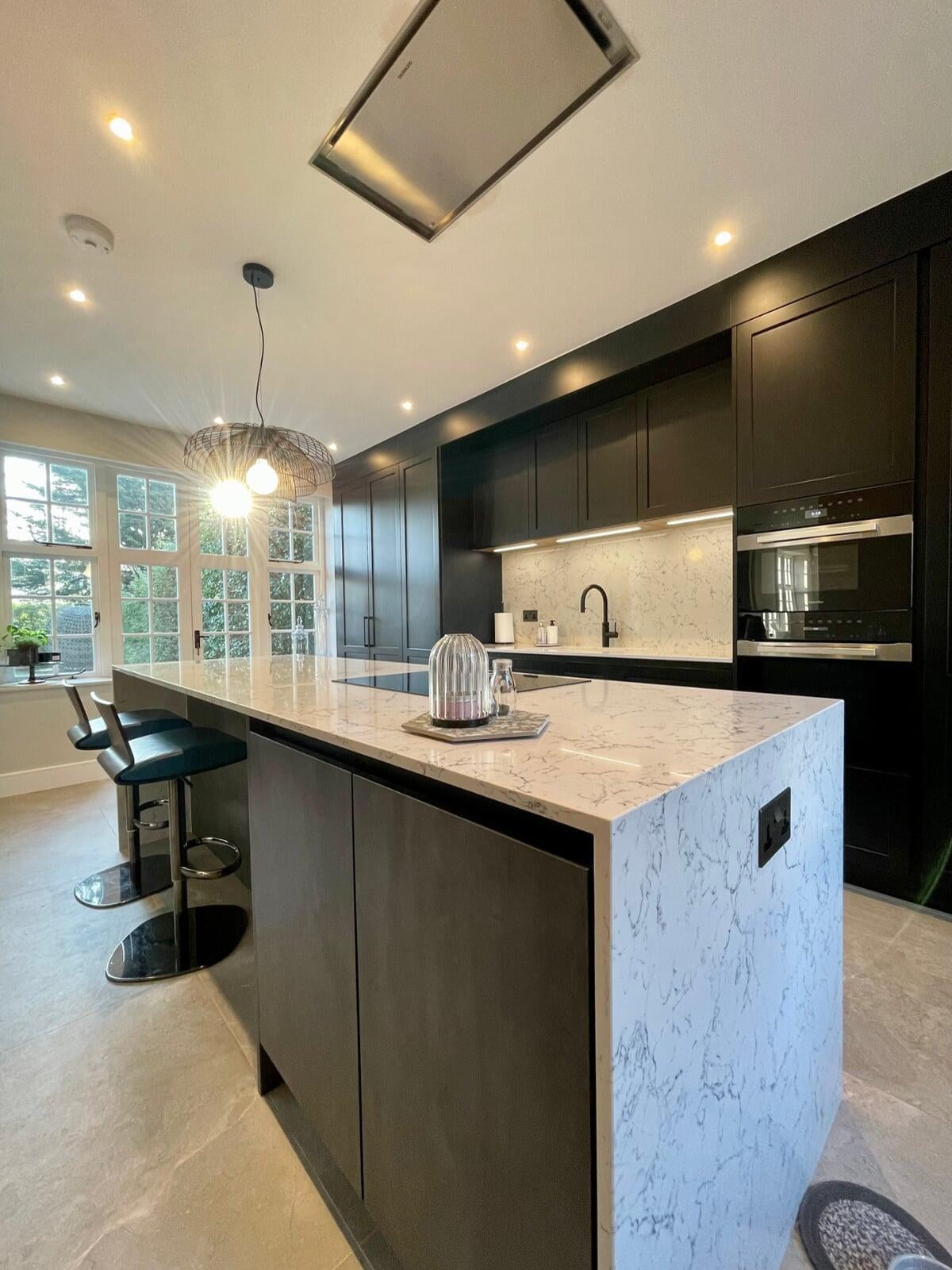 This beautiful kitchen belongs to a very talented chef and caterer.  She has a large social media following where her kitchen and her delicious food is regularly featured.  Her new kitchen needed to be both beautiful and extremely functional to meet all her work requirements.  My client had a very specific idea of the look she wanted to achieve, and it was a wonderful opportunity to be able to bring that vision to life.  The kitchen has smooth painted shaker style "handleless" units with a concrete effect laminate island.  The worktop is a stunning Caesarstone White Attica.  The black accessories elevate the overall look.  We spent a lot of time working together on the plans and details of this kitchen and I’m delighted with the result.  Most importantly, my client loves working in such a gorgeous space and her catering business is thriving.