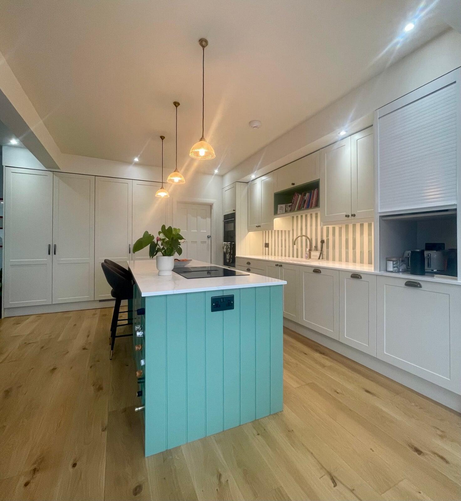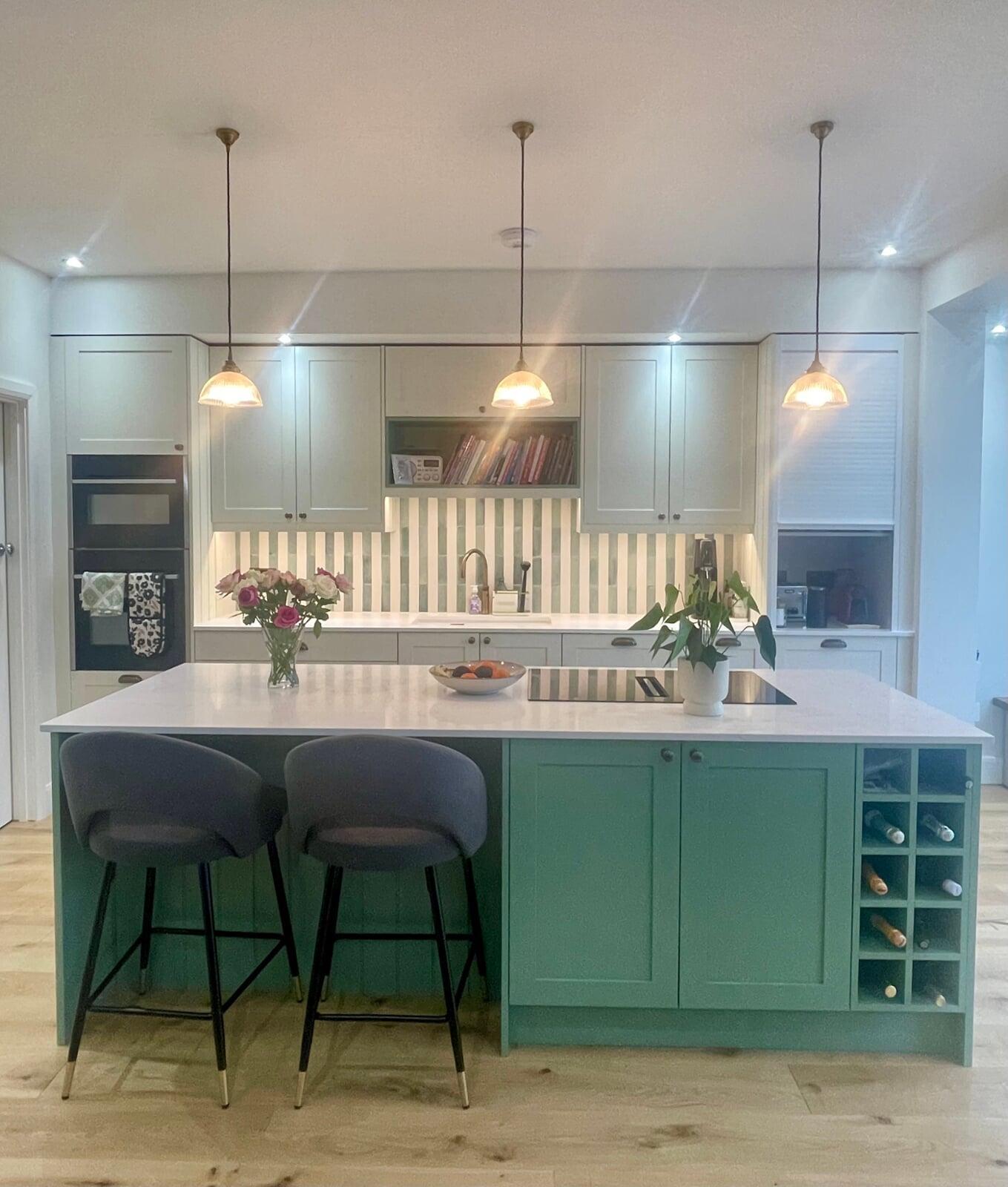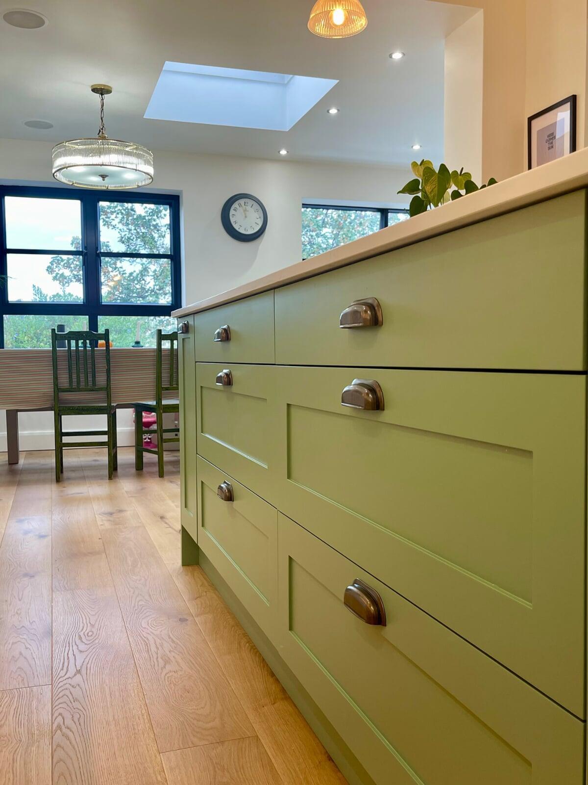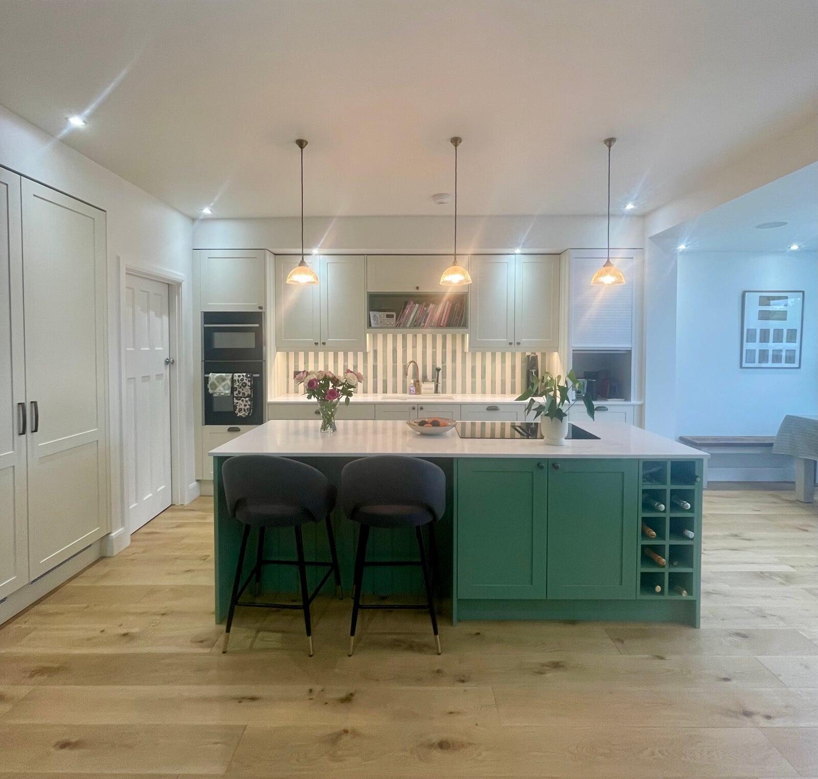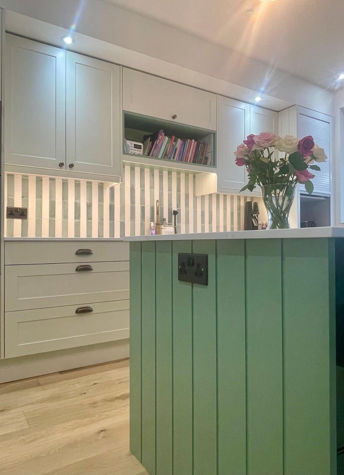 This very attractive kitchen forms part of a newly developed open plan space. The house has a very interesting layout with an elevated ground floor extension. The kitchen itself is a warm and inviting space that flows superbly in the centre of the open plan room. I love how the classic simplicity of the cabinetry marries that funky tiled backsplash which not only provides an interesting focal point but also perfectly ties in with the vertical grooves of the end panels in the design. The shaker cabinetry is impeccably produced by my bespoke joiners with an immaculate smooth spray-painted finish. The final lovely touch is the inclusion of those elegant bronze handles. My clients are beyond thrilled with everything and I’m extremely proud of the finished kitchen too.