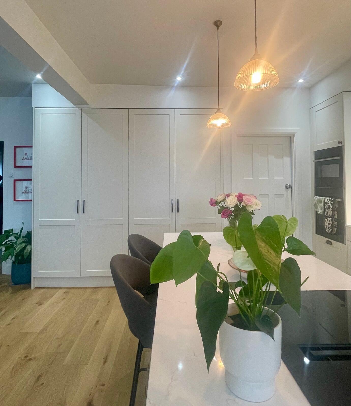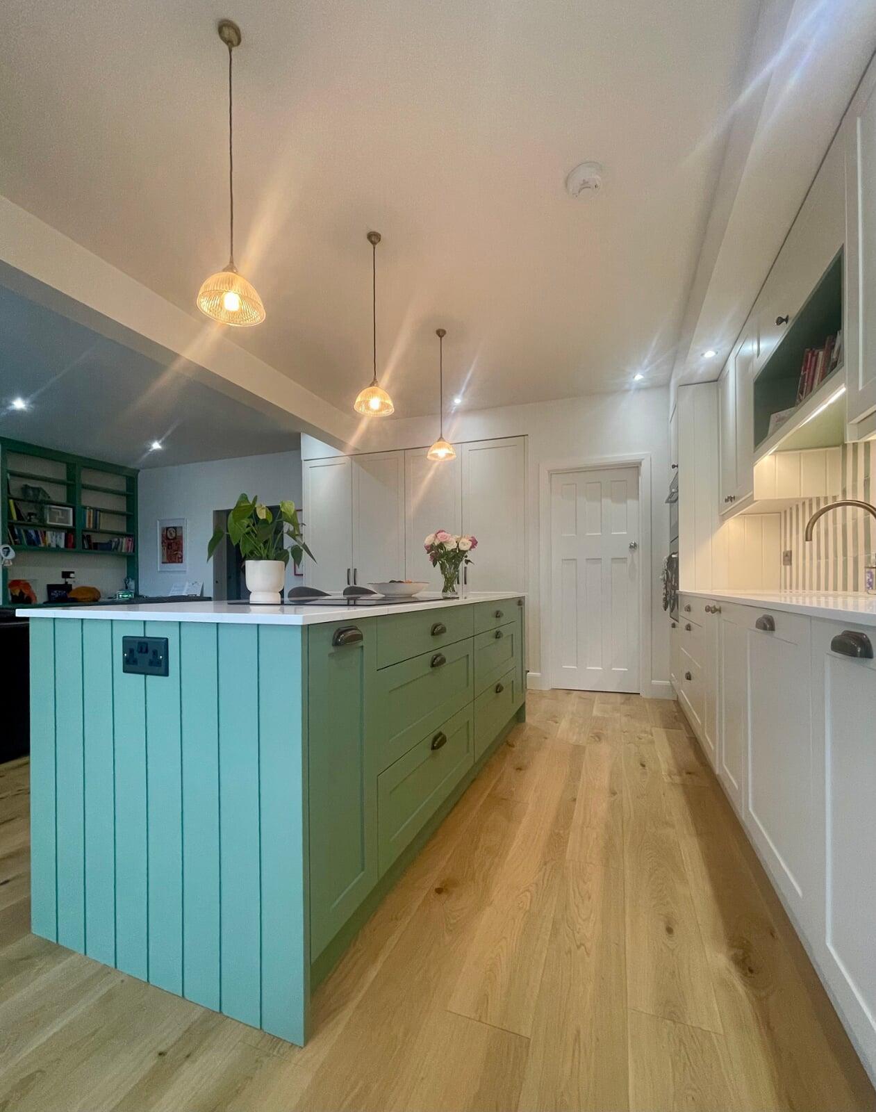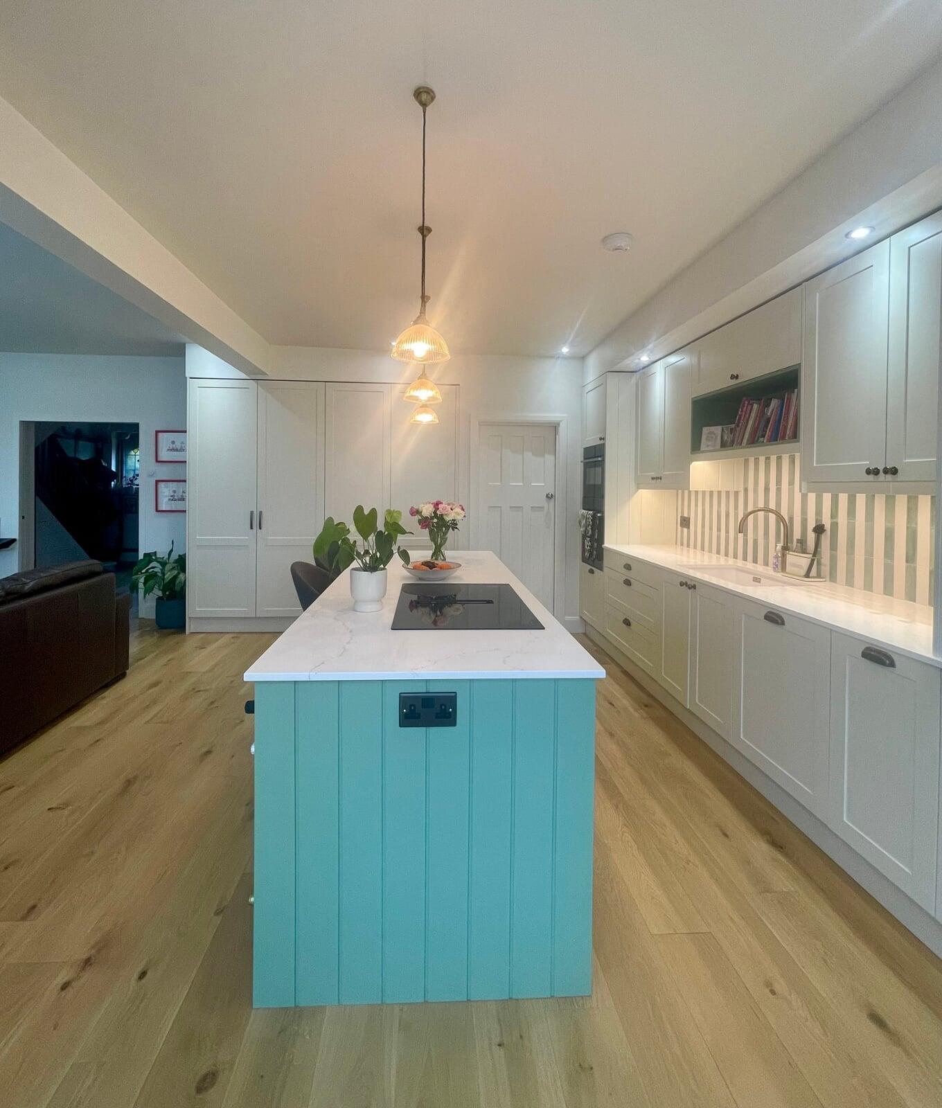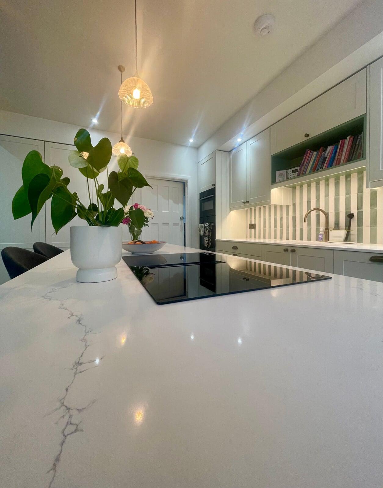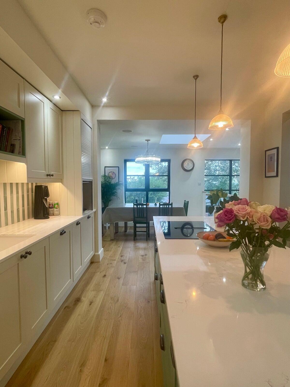 This very attractive kitchen forms part of a newly developed open plan space. The house has a very interesting layout with an elevated ground floor extension. The kitchen itself is a warm and inviting space that flows superbly in the centre of the open plan room. I love how the classic simplicity of the cabinetry marries that funky tiled backsplash which not only provides an interesting focal point but also perfectly ties in with the vertical grooves of the end panels in the design. The shaker cabinetry is impeccably produced by my bespoke joiners with an immaculate smooth spray-painted finish. The final lovely touch is the inclusion of those elegant bronze handles. My clients are beyond thrilled with everything and I’m extremely proud of the finished kitchen too.