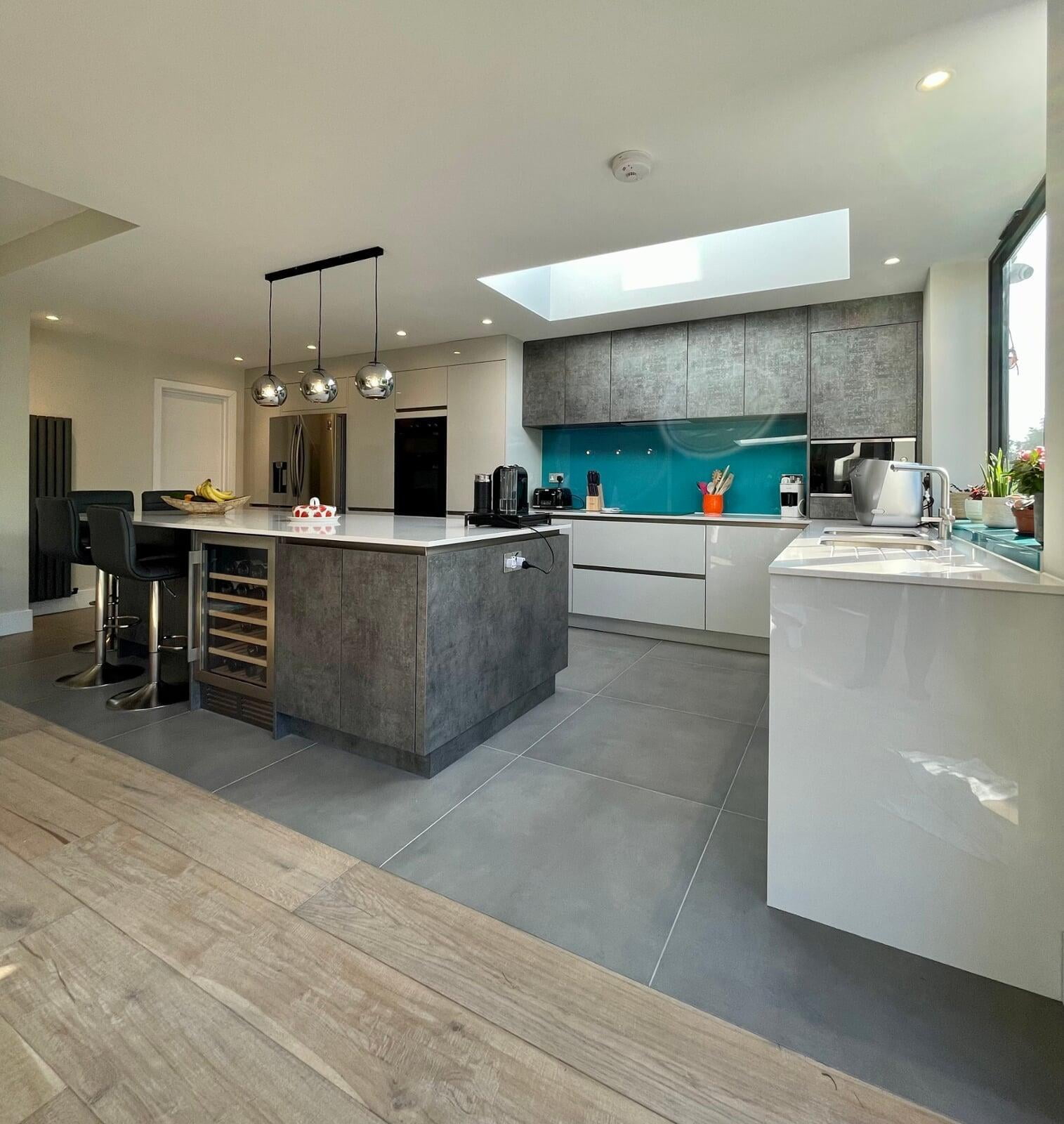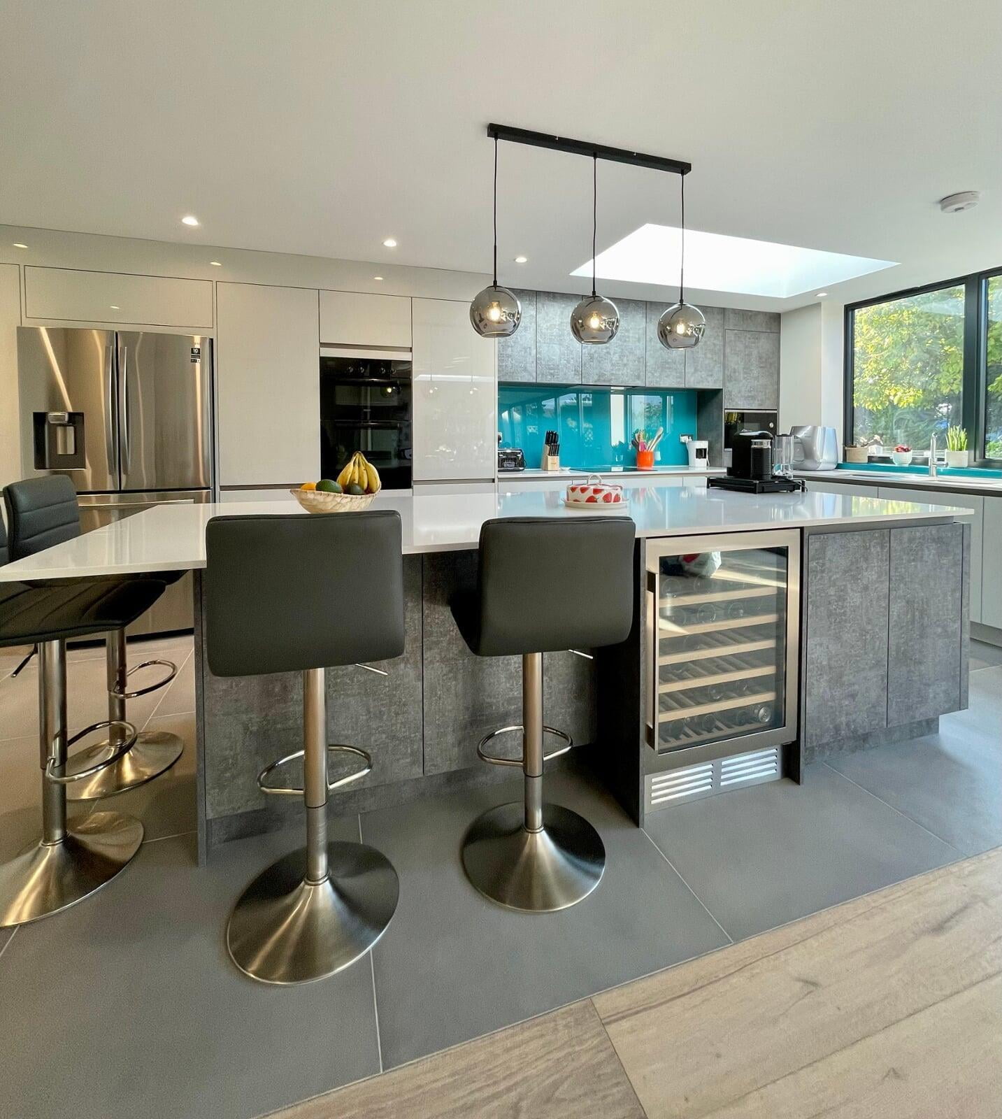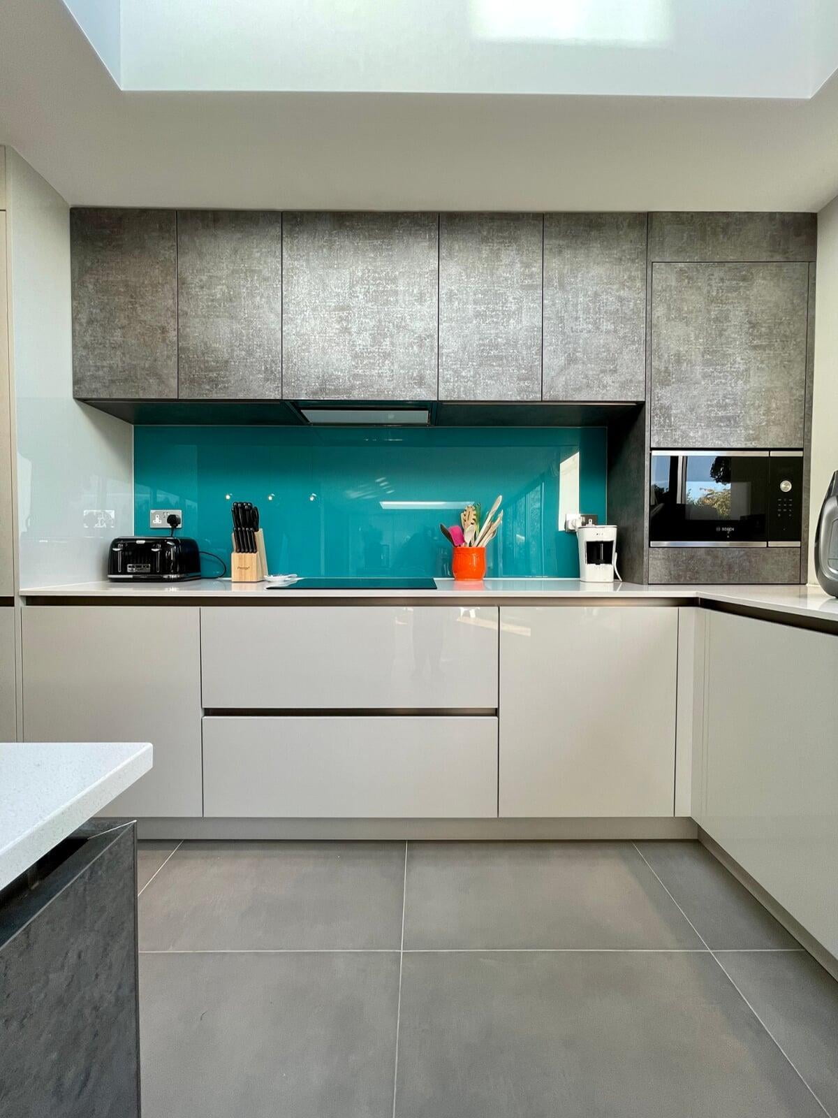 This was a wonderful project to work on. I had been producing many traditional kitchens at the time of this one, so it was really fun for me to sink my teeth into another modern "handleless" kitchen. I love the mix of the textured linen metallic melamine units and the gloriously shiny gloss units. It makes for a fabulous combination of textures and styles. The stunning aqua glass backsplash brings the scheme together brilliantly. The kitchen looks incredible in their beautiful new light filled rear extension. My clients were lovely to work with and very decisive! I’m delighted they have their dream kitchen.