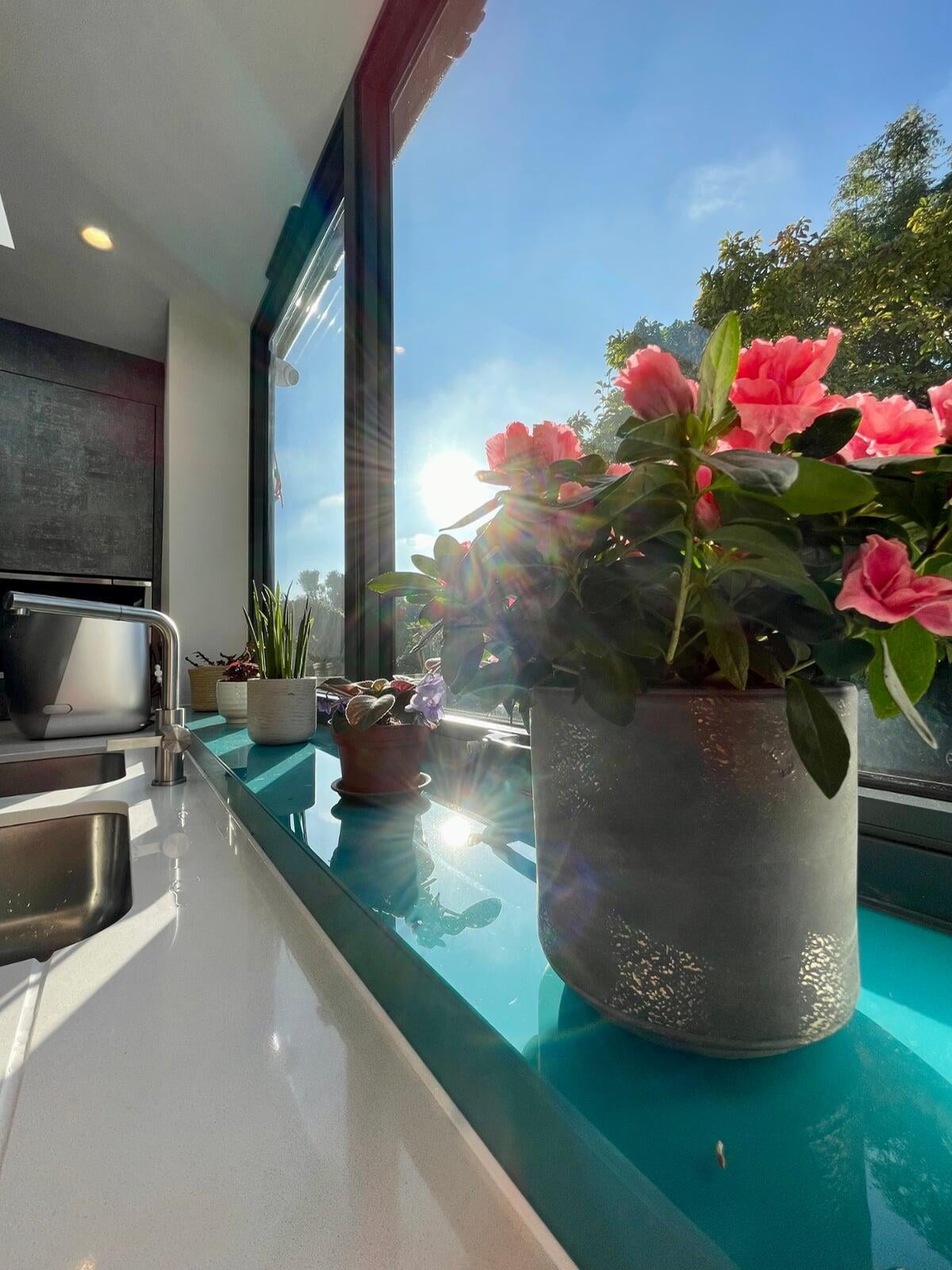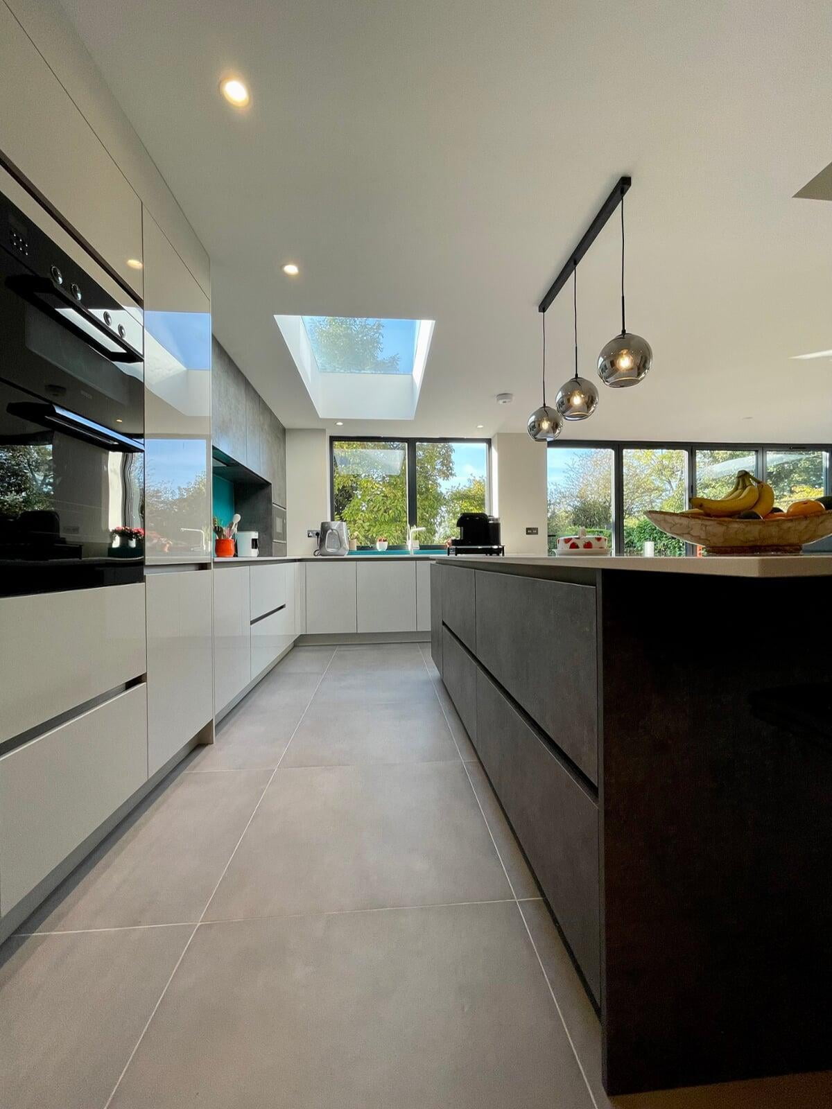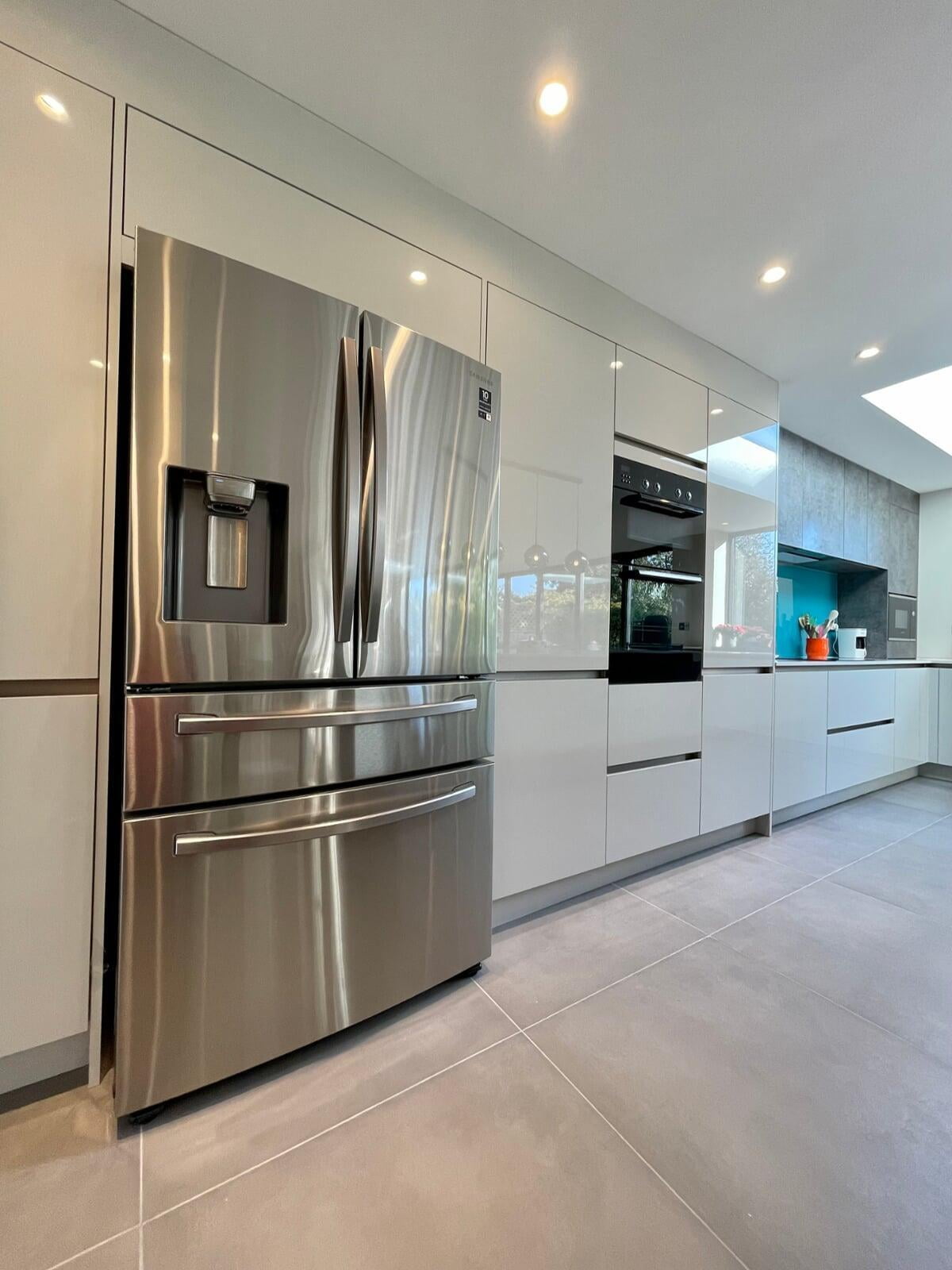 This was a wonderful project to work on. I had been producing many traditional kitchens at the time of this one, so it was really fun for me to sink my teeth into another modern "handleless" kitchen. I love the mix of the textured linen metallic melamine units and the gloriously shiny gloss units. It makes for a fabulous combination of textures and styles. The stunning aqua glass backsplash brings the scheme together brilliantly. The kitchen looks incredible in their beautiful new light filled rear extension. My clients were lovely to work with and very decisive! I’m delighted they have their dream kitchen.