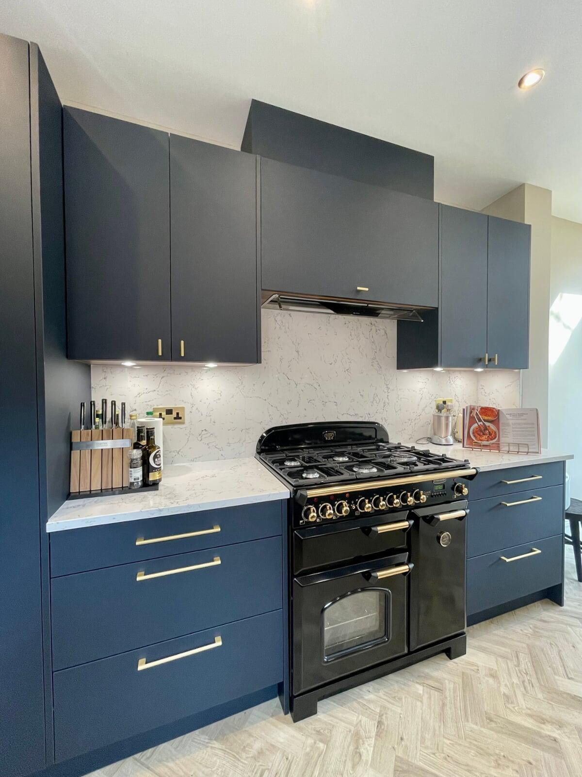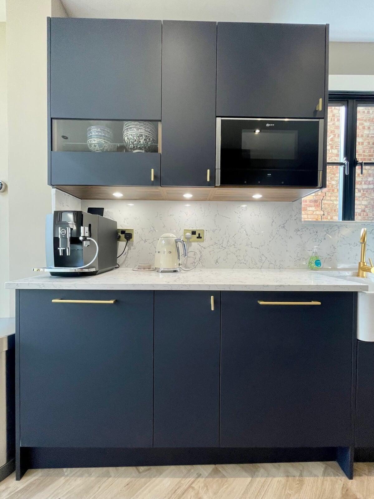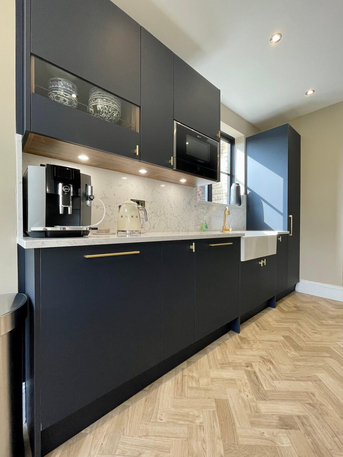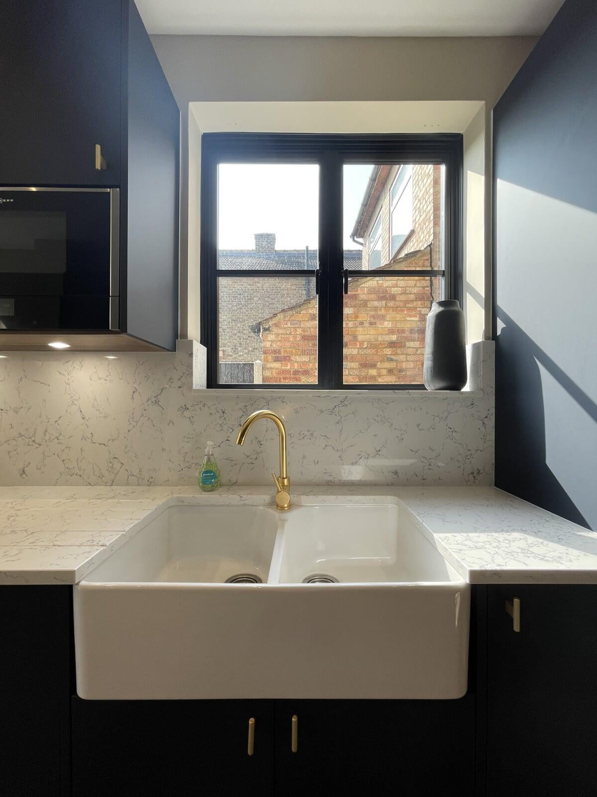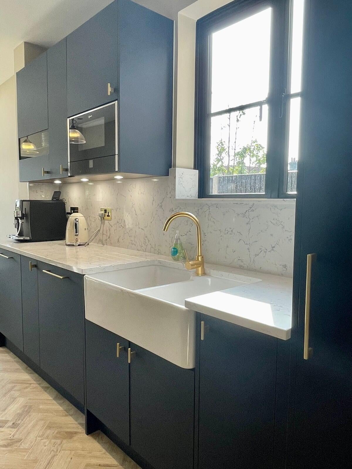 It was a pleasure to design and supply this kitchen for a lovely couple in Enfield. They had a good idea of the style of kitchen they wanted and we worked collaboratively to ensure their ideas would work practically and aesthetically. They chose a very beautiful Caesarstone White Attica quartz which they used as both the worktop, backsplash and across the window cil. The large amount of quartz pairs beautifully with the Perfect Matt Indigo cabinetry and Indigo handles to create a simple and elegant scheme.