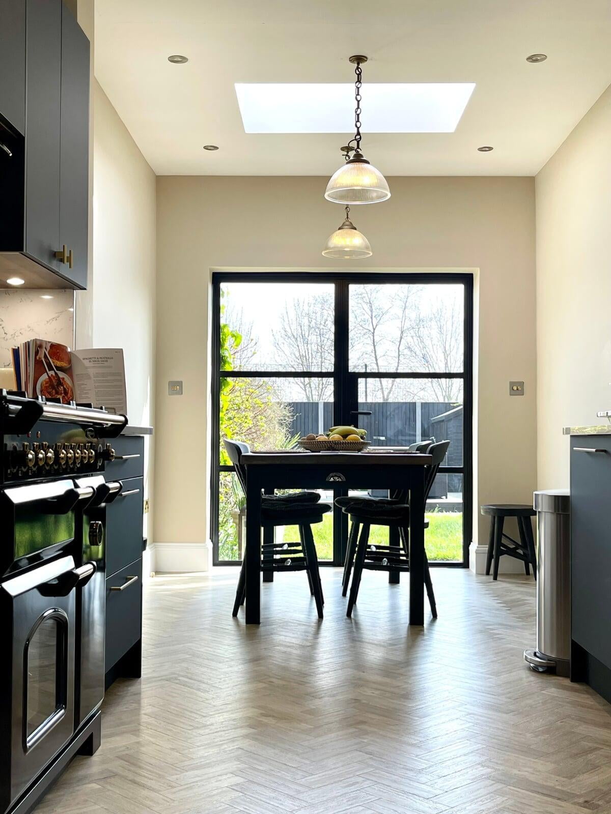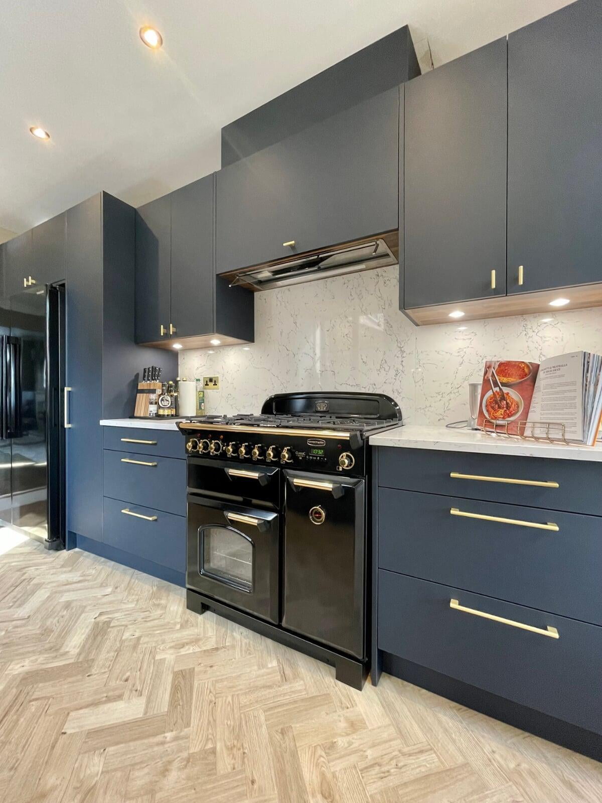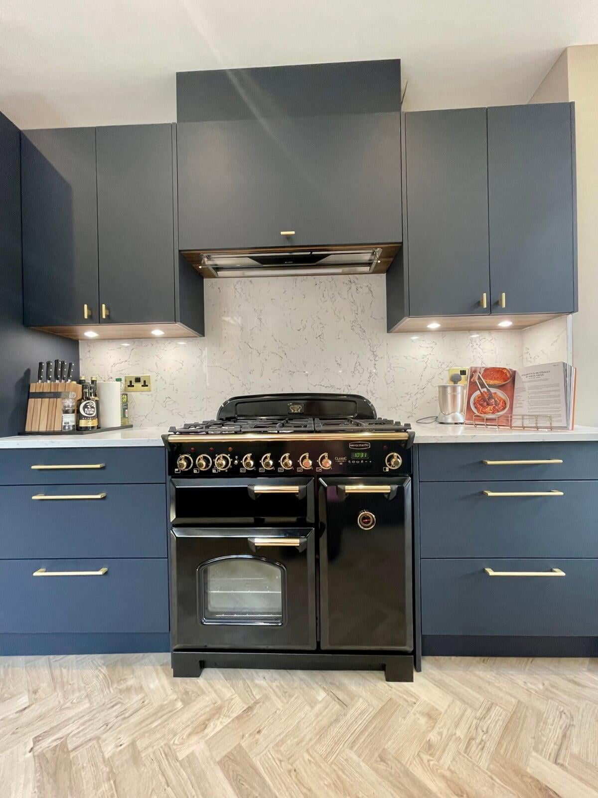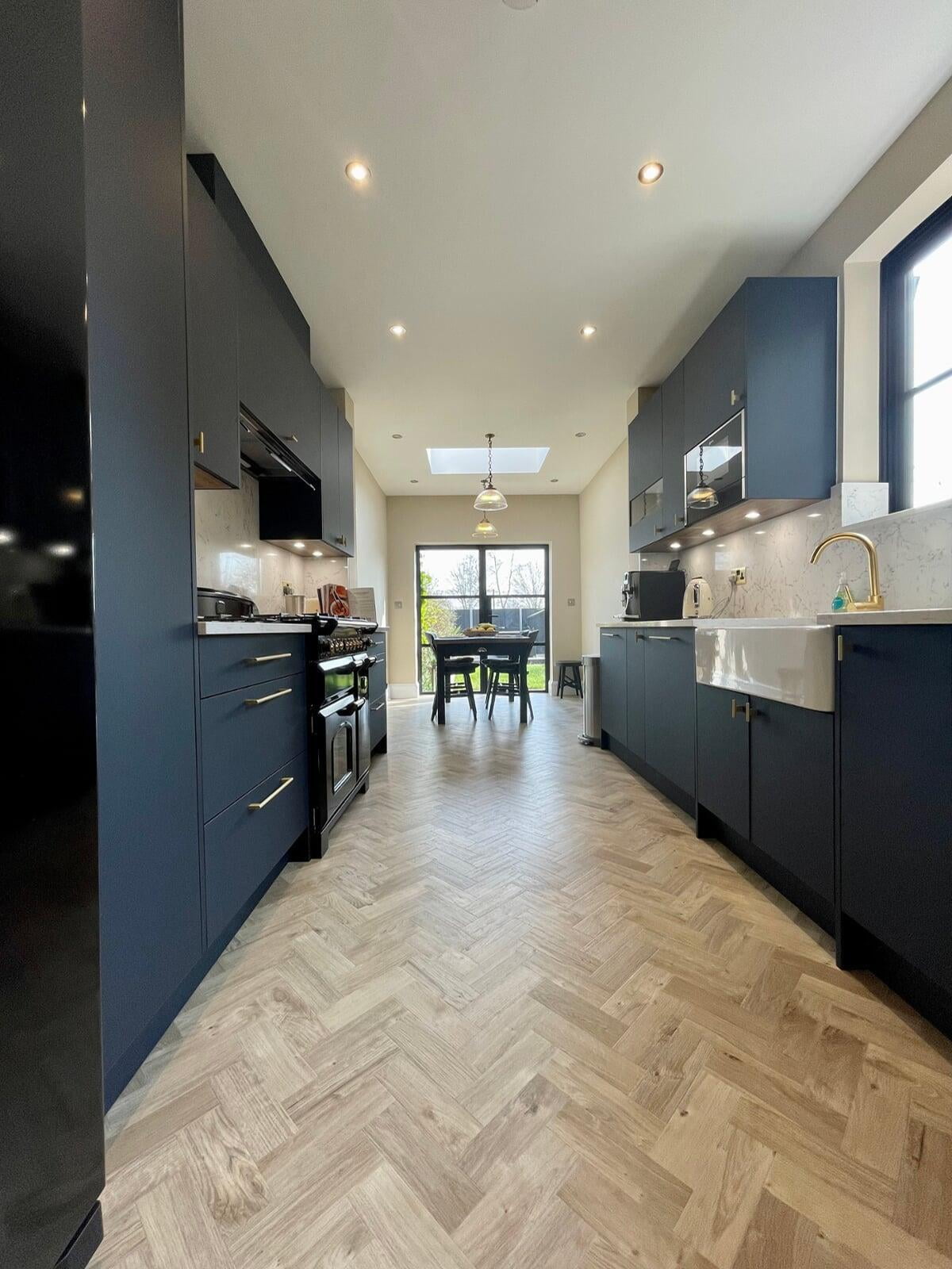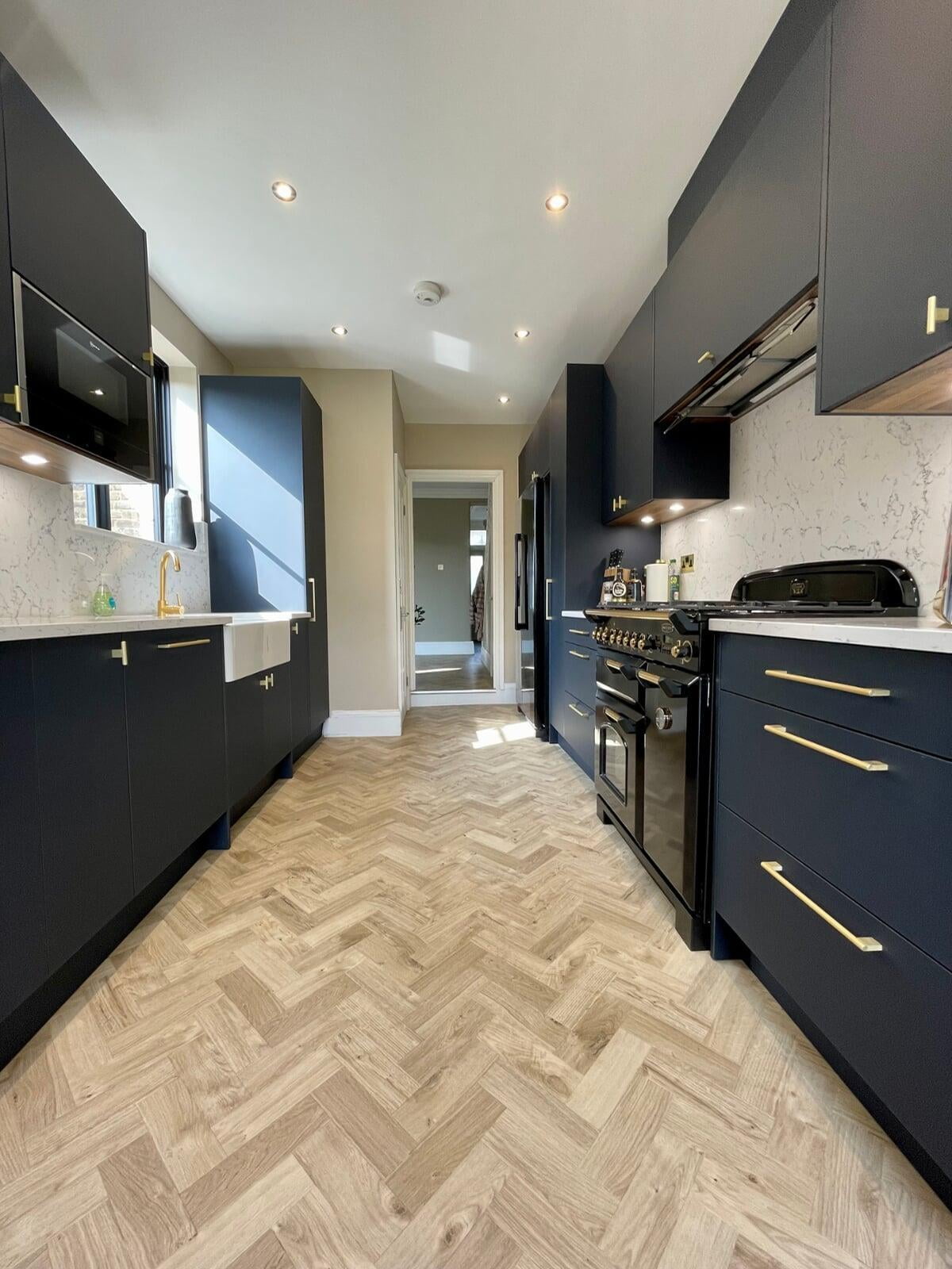 It was a pleasure to design and supply this kitchen for a lovely couple in Enfield. They had a good idea of the style of kitchen they wanted and we worked collaboratively to ensure their ideas would work practically and aesthetically. They chose a very beautiful Caesarstone White Attica quartz which they used as both the worktop, backsplash and across the window cil. The large amount of quartz pairs beautifully with the Perfect Matt Indigo cabinetry and Indigo handles to create a simple and elegant scheme.