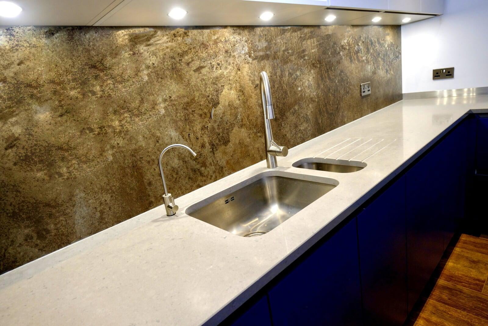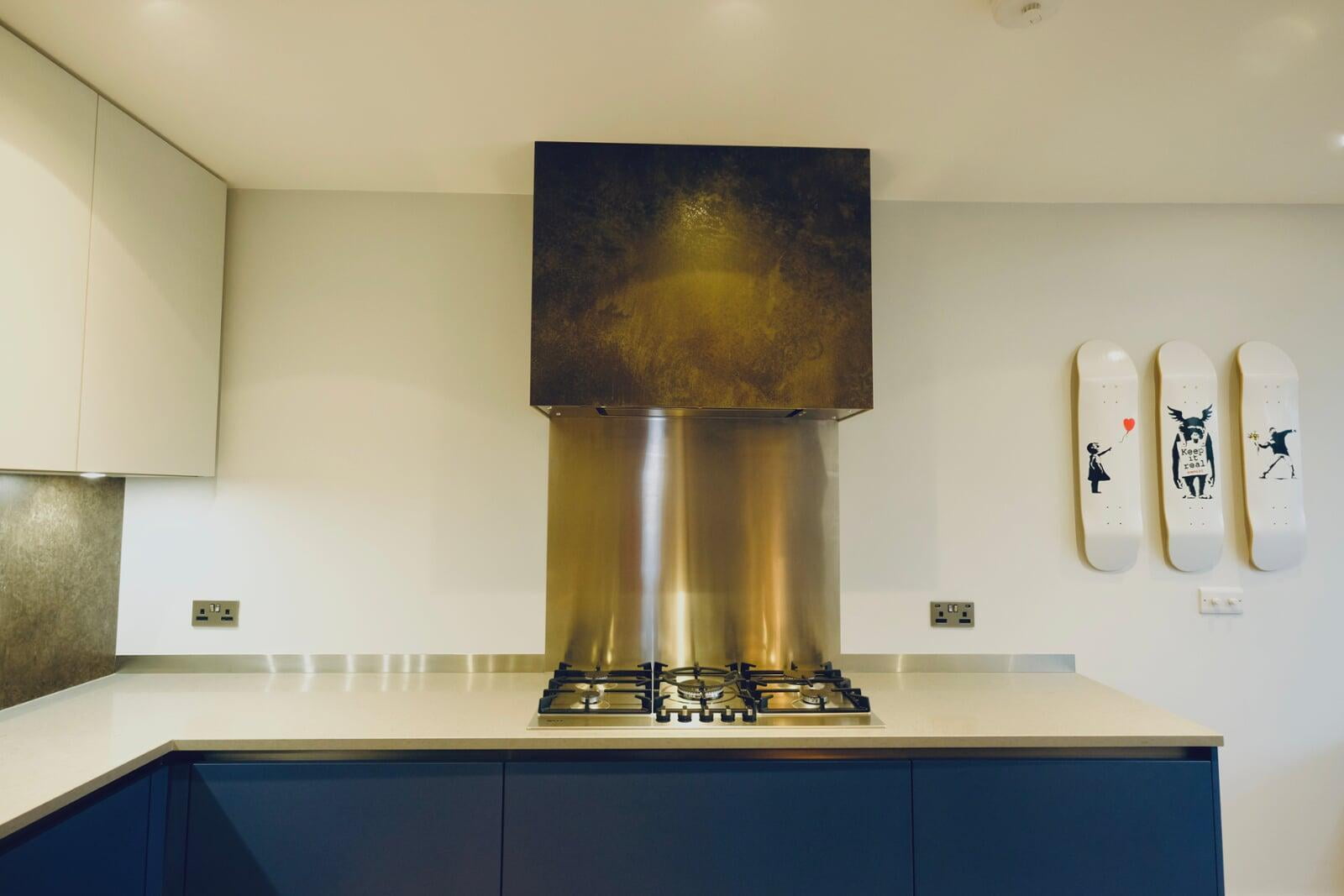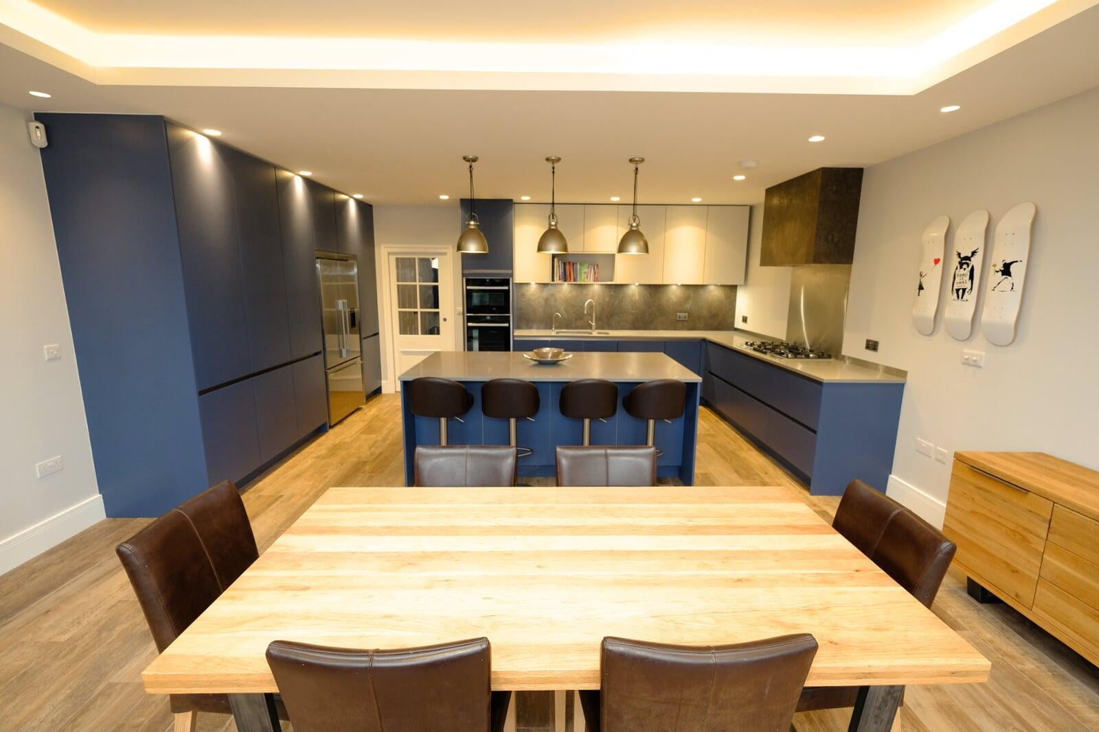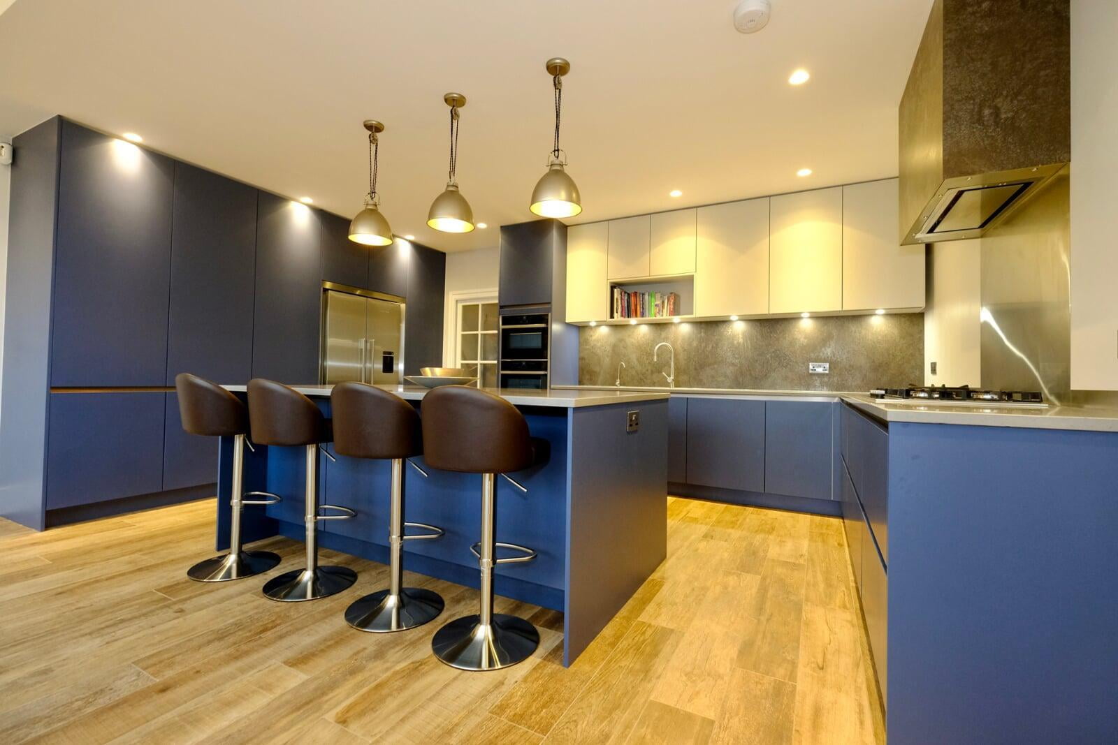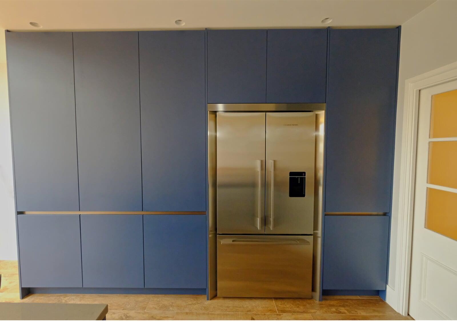 I love the colour scheme of this kitchen. All of the tall and base units are in Farrow and Ball’s Stiffkey Blue which is a bright and happy shade of blue. It works very well in such a light space designed with family living in mind. To compliment this colour, we selected the wall units in Farrow and Ball’s Blackened which is a lovely muted shade and the walls were painted in that same shade too. It was a lot of fun putting together the colour scheme for this kitchen. During their research into all things kitchen, my clients had fallen in love with a particular porcelain tile that they were keen to include in the final design. Given that they also loved Stiffkey Blue, we let these two textures lead the scheme. From here, we decided to use that wonderful porcelain to clad the back wall splashback and then create a box around the extractor which we would also clad in the same porcelain. The way the extractor cladding matches the splashback along the back wall is a very striking feature of the kitchen. As I continued to look at complimentary textures, I realised that a simple stainless steel hob backsplash worked best with such an ornate tile and from there we decided to go with a simple but beautiful grey Caesarstone quartz worktop in Concrete which had a very subtle hint of blue in it. We also then made sure that the handlelesss rails were also in the stainless steel finish. It was important that we could introduce several textures into the kitchen without any one of those overwhelming the overall scheme. I think the colours and textures work so beautifully together. We initially had a very different layout for the tall units in the design, but we had to change these when we were told that there would be a pillar and boiler in the kitchen that wasn’t on the architects original drawings. Despite this small setback, we were still able to create a bank of tall units that is both attractive and efficient. By utilising a special flush kit that is unique to Fisher & Paykel, we were able to have the American style fridge/freezer that the client wanted while having it look integrated amongst the adjacent tall units. All of the wall and tall units are a custom height to take them to the ceiling. There is a vast amount of storage in this kitchen and every inch of the kitchen is efficiently utilised. The island is a fantastic size and a wonderful place for the kids to draw and play as well as being a great food preparation and entertainment zone.