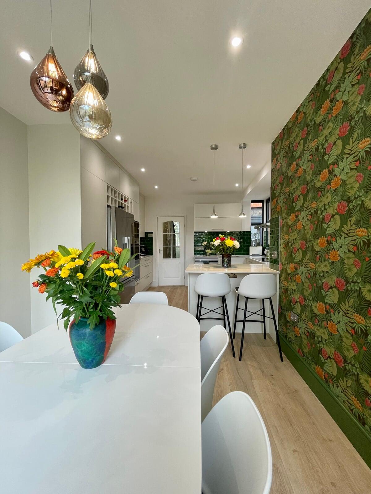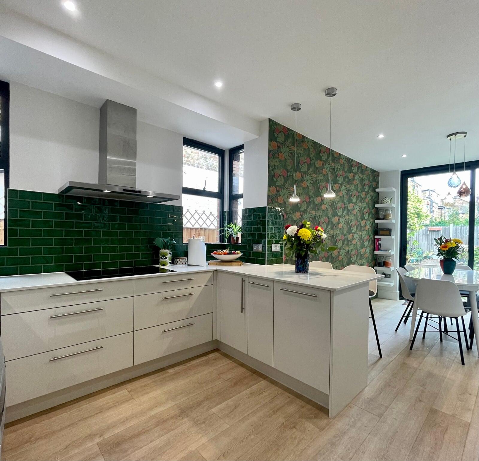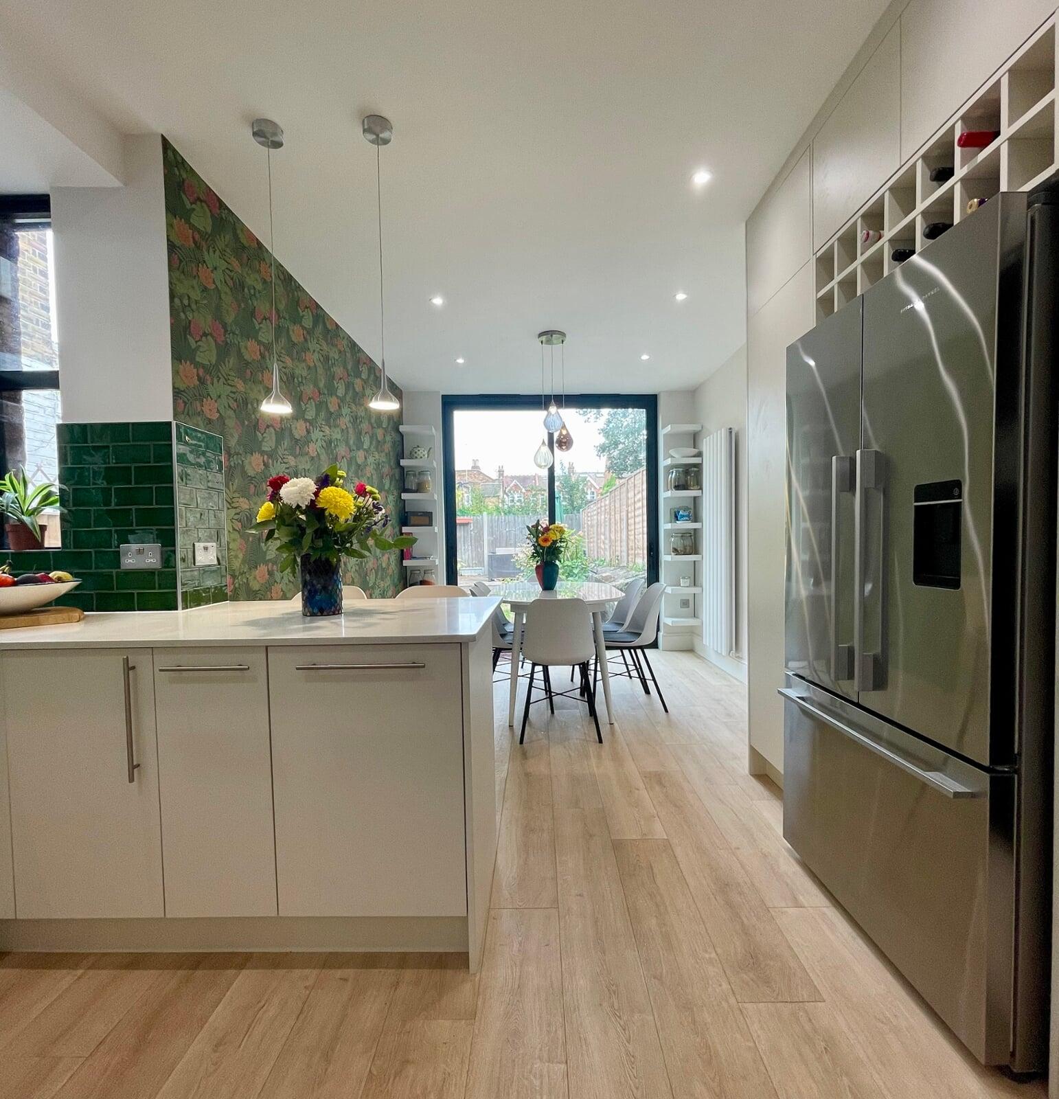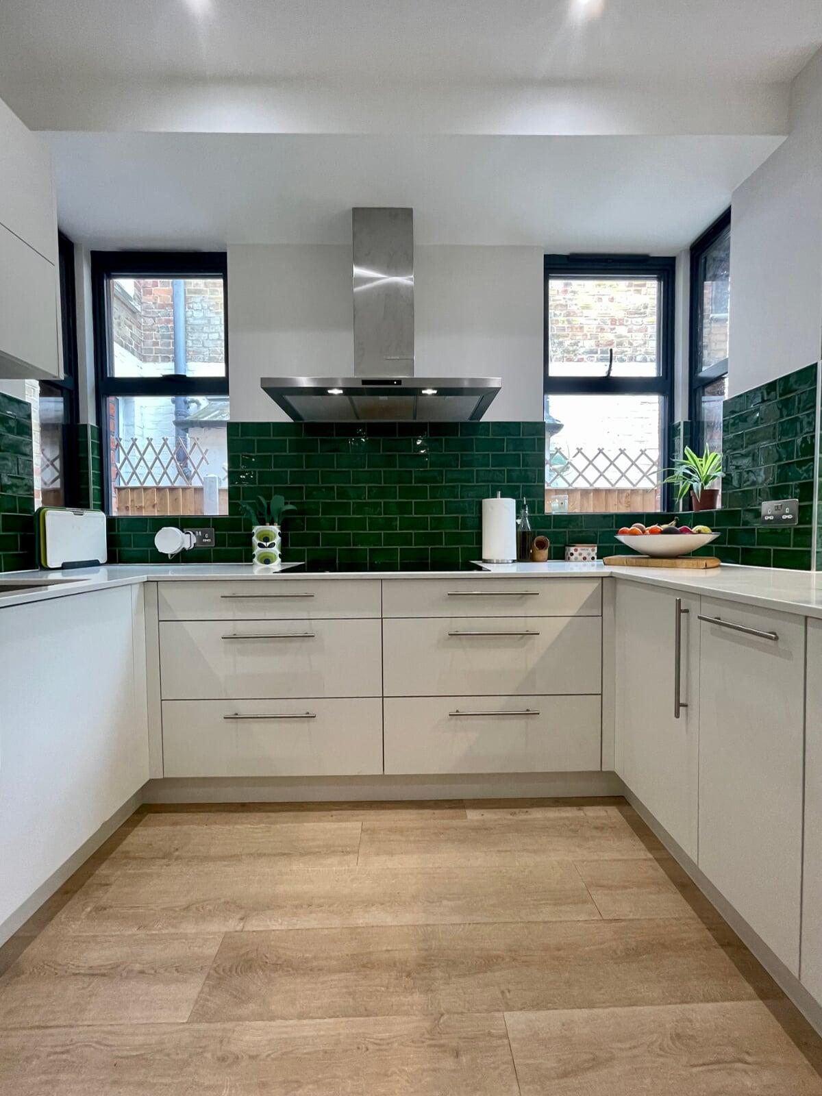 This kitchen has undergone a huge transformation. When I first went to meet these clients, the kitchen was dark, gloomy and had a split-level floor for reasons nobody quite understood as it lent nothing to the flow of the room. My clients initially struggled to see the amazing potential their room had, and I was very excited to share my ideas with them. My clients love the colour green and felt that they really wanted a dark green kitchen. It soon became clear that a lighter scheme would work much better in the space and that there were numerous ways of bringing green into the scheme with accessories and accents which is exactly what we did. My brilliant team of builders transformed the space by levelling the floor and ceiling, making the doors to the garden far bigger and blocking off a window to create a wall for the extractor that could now duct outside as well as tackling all the plumbing, electrical and decorating requirements. The finished kitchen is superb! It’s a simple white slab style with efficient storage and a very nice run of worktop with a breakfast bar incorporated. It’s beautiful, spacious, light and flows brilliantly. My clients chose some wonderful accessories to finish their perfect almost green dream kitchen!