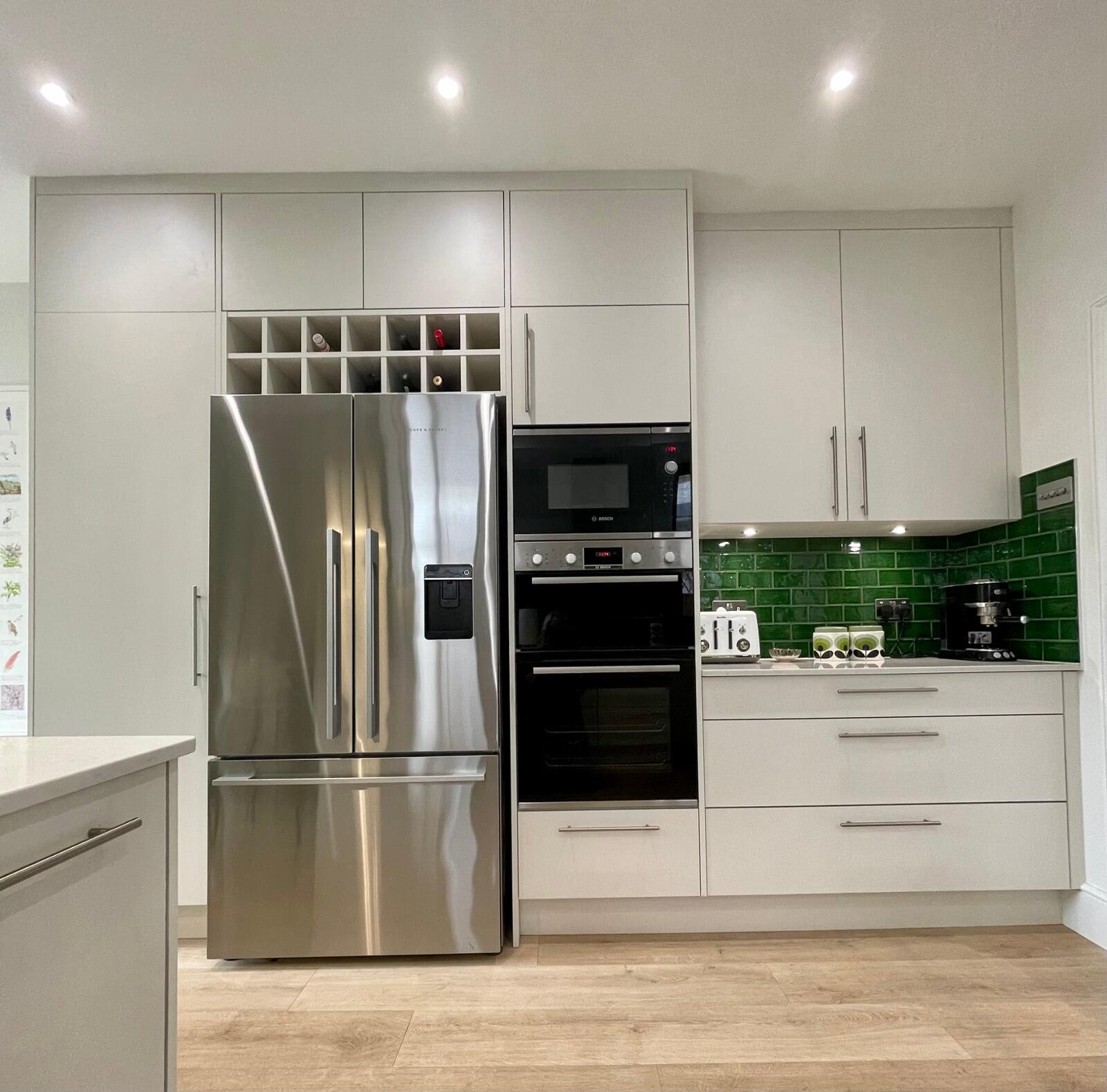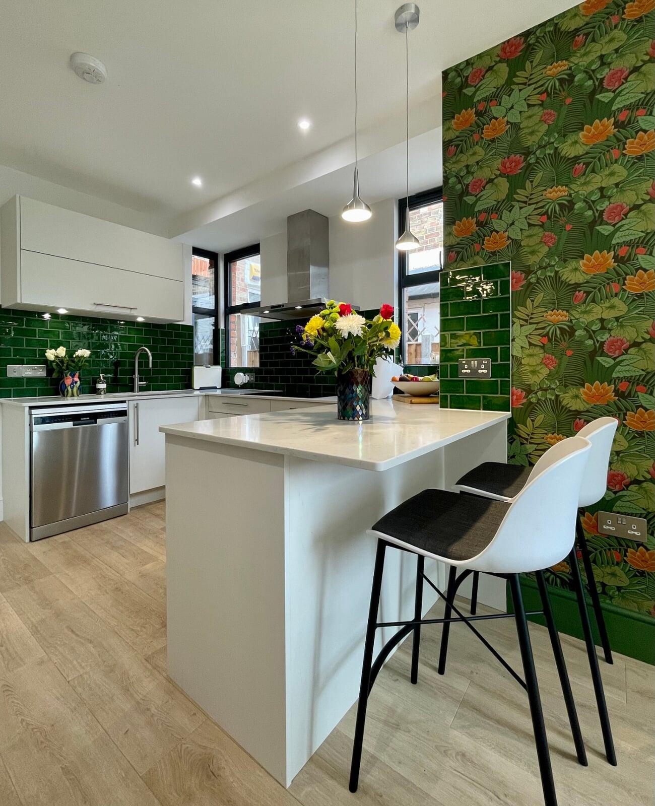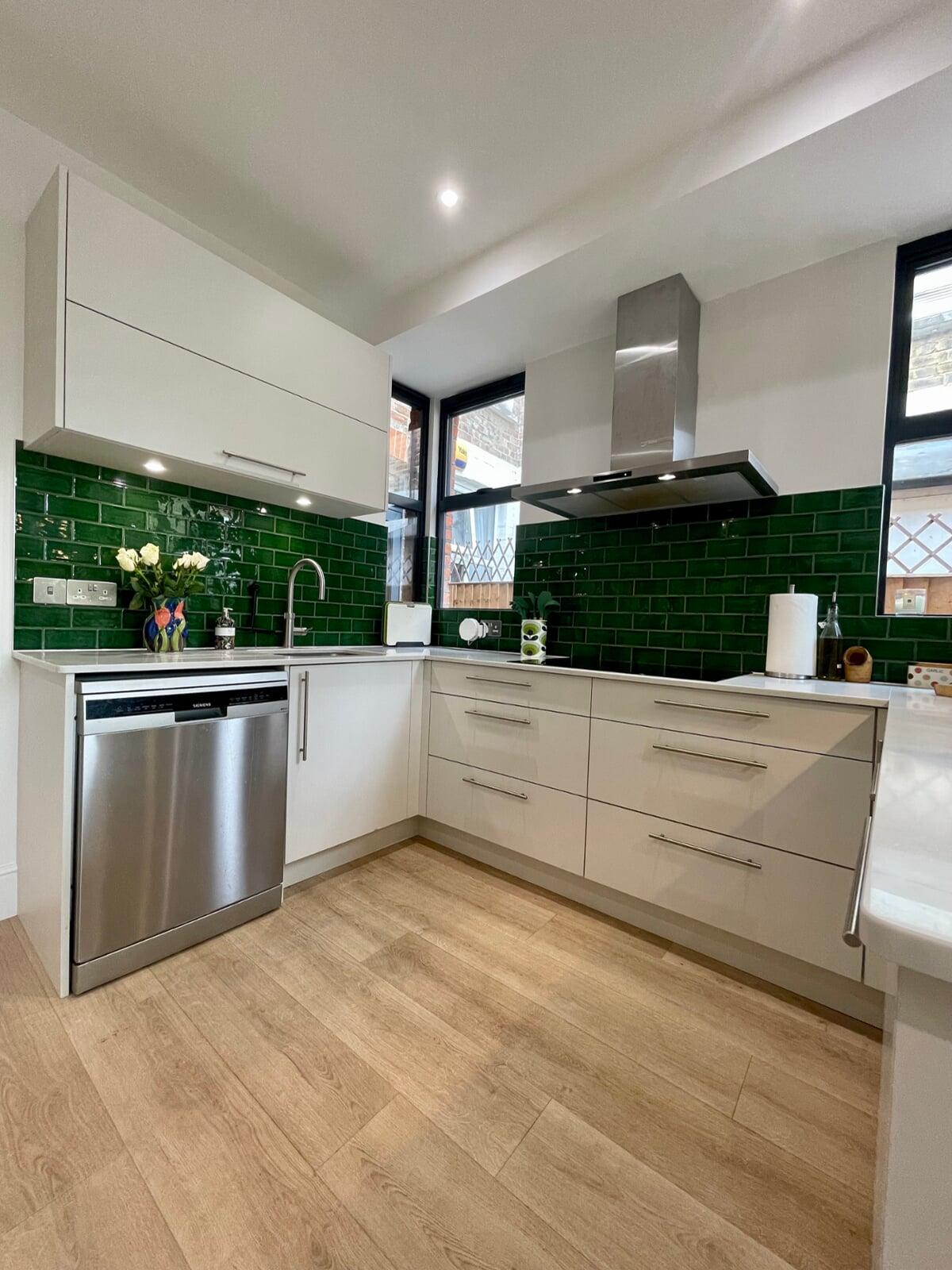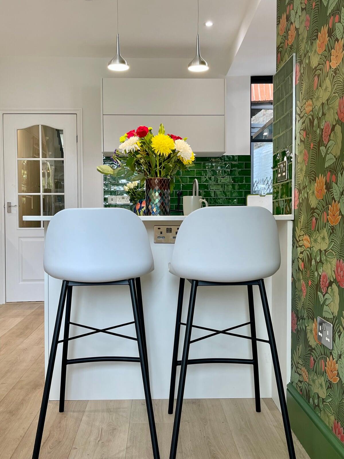 This kitchen has undergone a huge transformation. When I first went to meet these clients, the kitchen was dark, gloomy and had a split-level floor for reasons nobody quite understood as it lent nothing to the flow of the room. My clients initially struggled to see the amazing potential their room had, and I was very excited to share my ideas with them. My clients love the colour green and felt that they really wanted a dark green kitchen. It soon became clear that a lighter scheme would work much better in the space and that there were numerous ways of bringing green into the scheme with accessories and accents which is exactly what we did. My brilliant team of builders transformed the space by levelling the floor and ceiling, making the doors to the garden far bigger and blocking off a window to create a wall for the extractor that could now duct outside as well as tackling all the plumbing, electrical and decorating requirements. The finished kitchen is superb! It’s a simple white slab style with efficient storage and a very nice run of worktop with a breakfast bar incorporated. It’s beautiful, spacious, light and flows brilliantly. My clients chose some wonderful accessories to finish their perfect almost green dream kitchen!