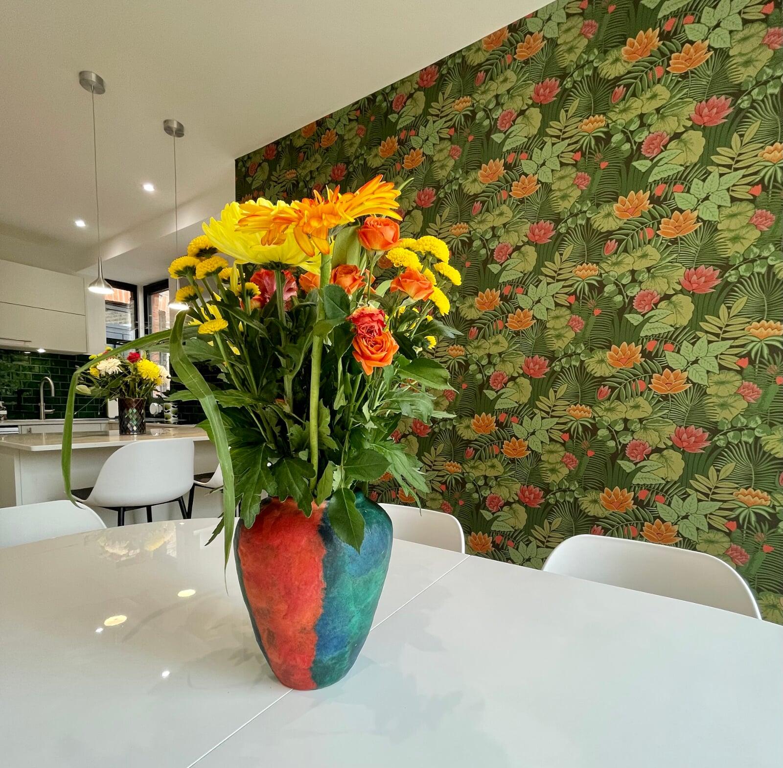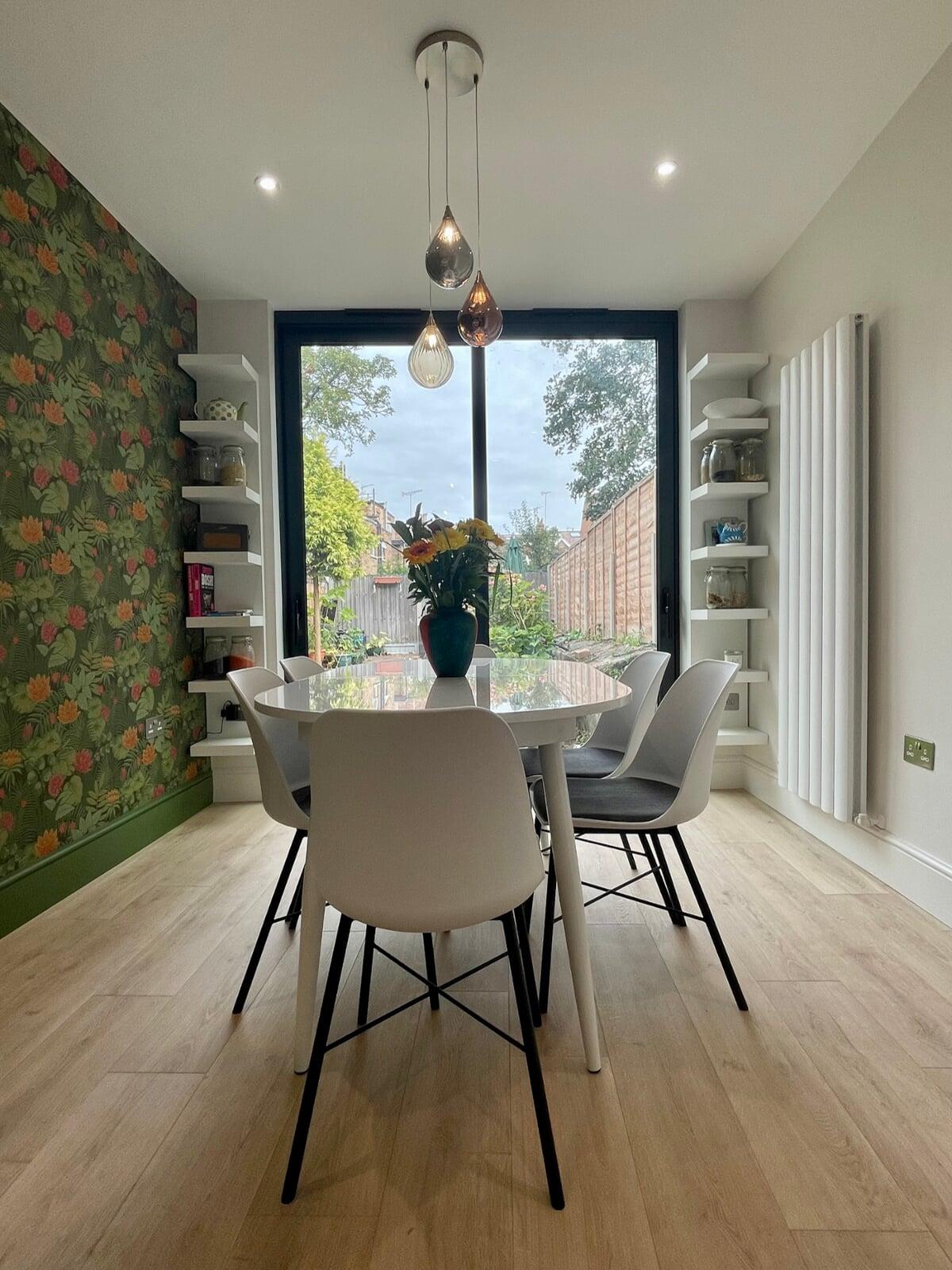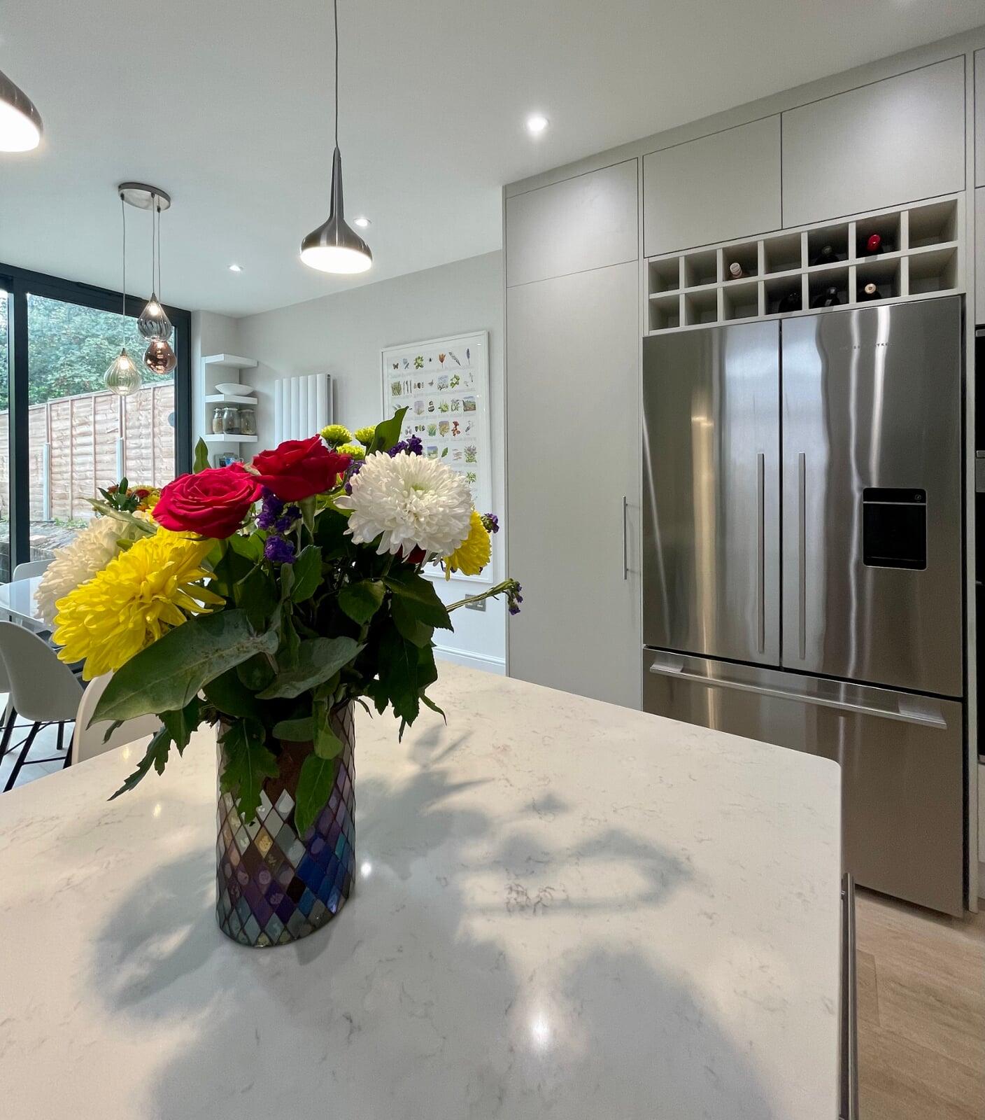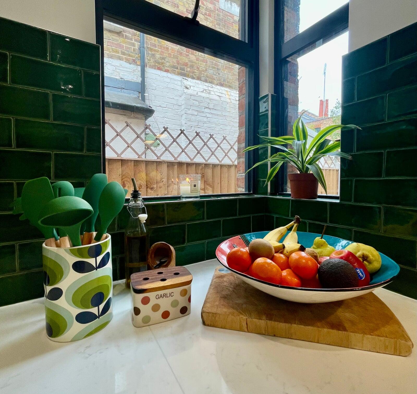 This kitchen has undergone a huge transformation. When I first went to meet these clients, the kitchen was dark, gloomy and had a split-level floor for reasons nobody quite understood as it lent nothing to the flow of the room. My clients initially struggled to see the amazing potential their room had, and I was very excited to share my ideas with them. My clients love the colour green and felt that they really wanted a dark green kitchen. It soon became clear that a lighter scheme would work much better in the space and that there were numerous ways of bringing green into the scheme with accessories and accents which is exactly what we did. My brilliant team of builders transformed the space by levelling the floor and ceiling, making the doors to the garden far bigger and blocking off a window to create a wall for the extractor that could now duct outside as well as tackling all the plumbing, electrical and decorating requirements. The finished kitchen is superb! It’s a simple white slab style with efficient storage and a very nice run of worktop with a breakfast bar incorporated. It’s beautiful, spacious, light and flows brilliantly. My clients chose some wonderful accessories to finish their perfect almost green dream kitchen!