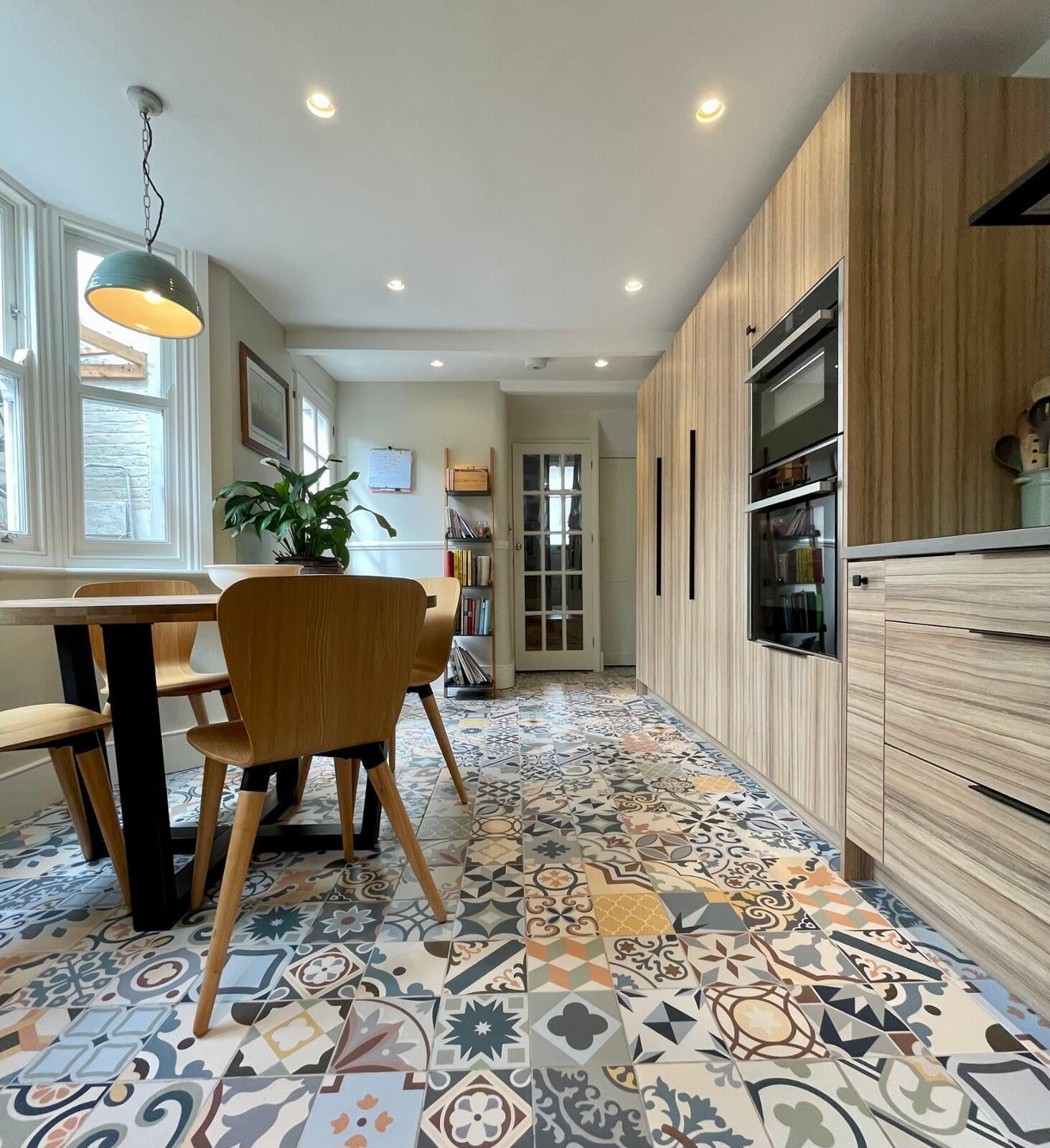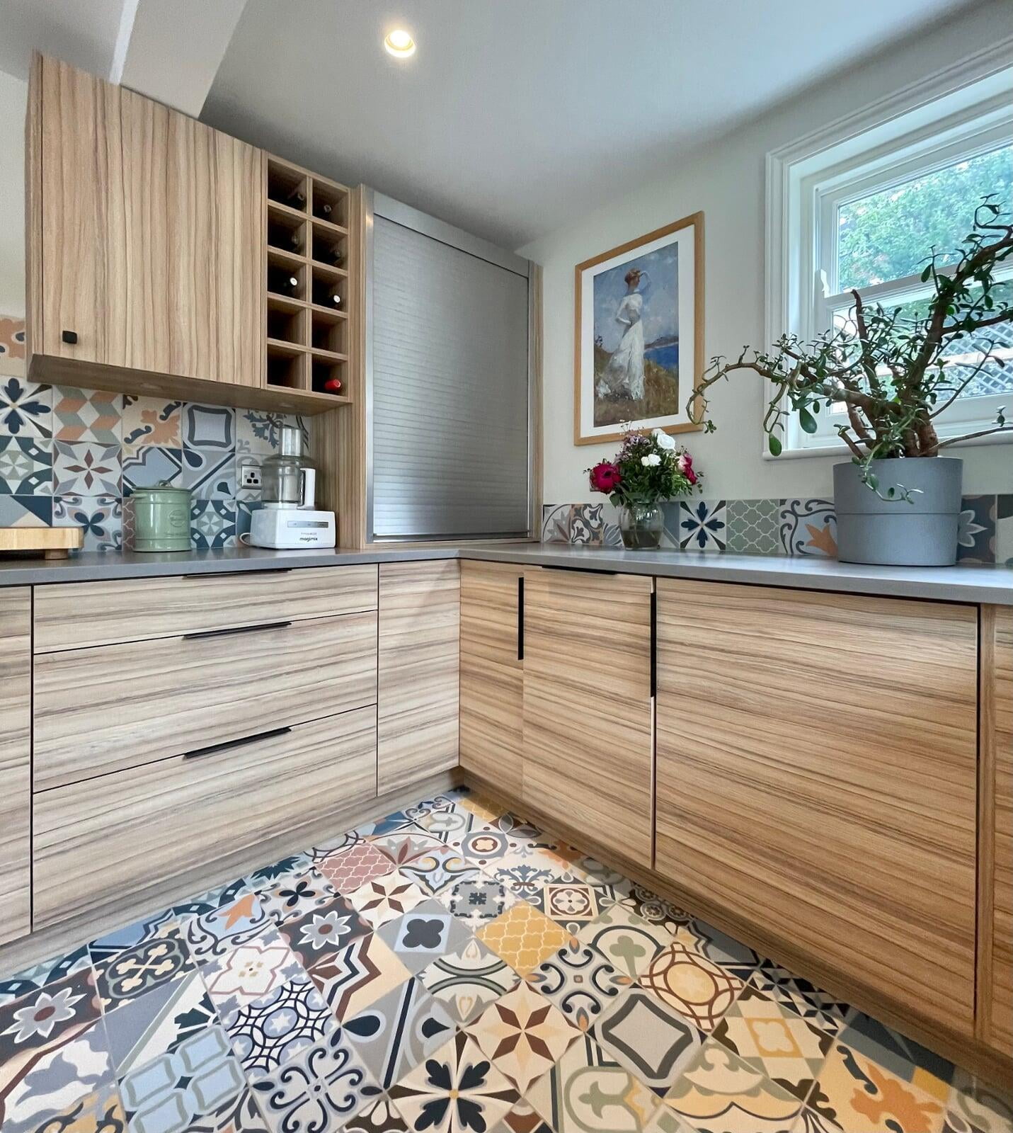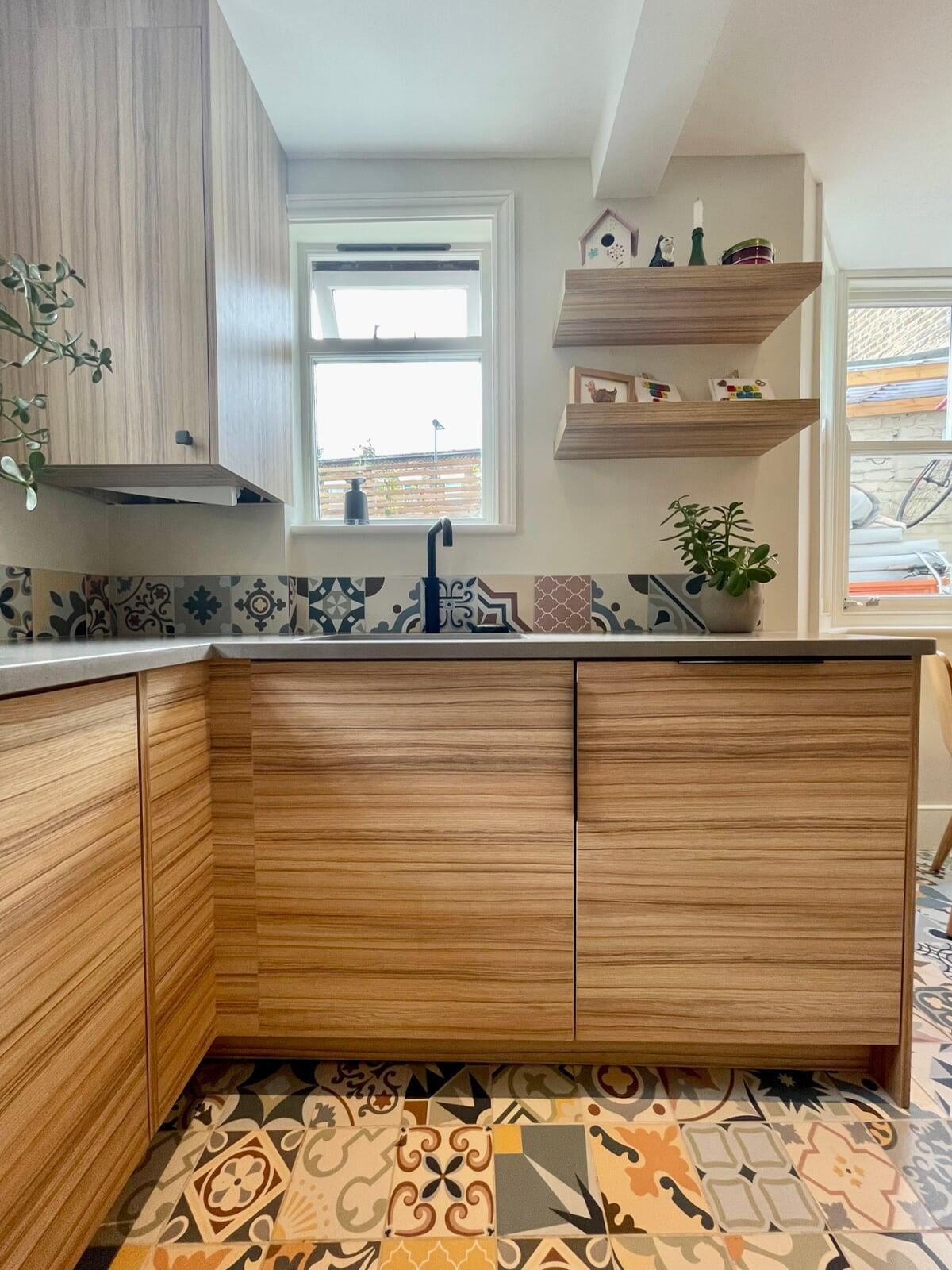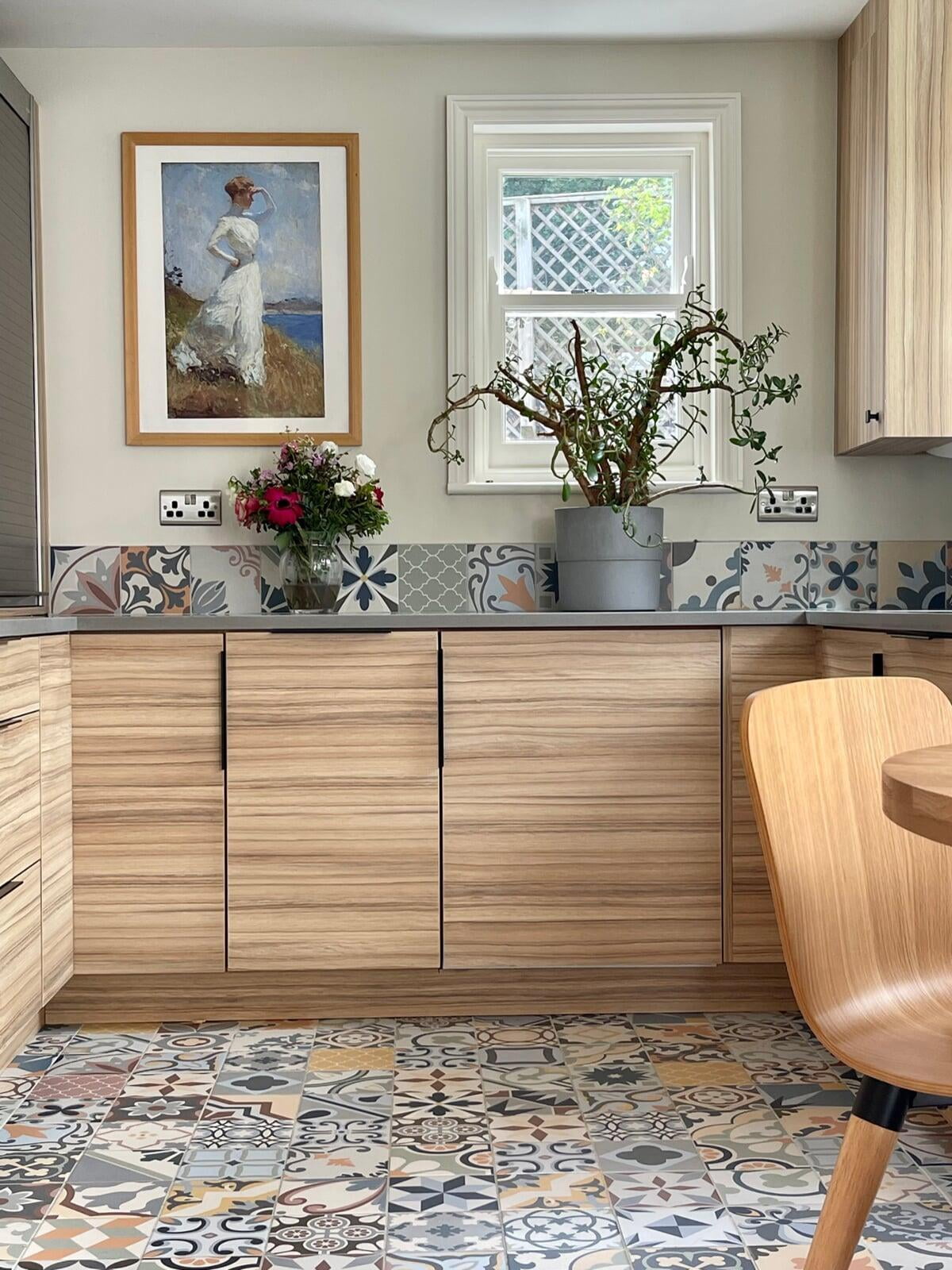 My clients initial concern for this kitchen renovation was how their guinea pig would cope with the upheaval! After some reassurances, the guinea pig was sent on a lovely seaside sabbatical, and we went full steam ahead. The original kitchen in this Victorian terrace was dark and dreary and in need of renovating. The room was very cluttered with little worktop space and virtually no storage. There was also a large chimney breast in the kitchen, and I kept everything crossed that they would agree to remove it as it would give huge scope to what could then be done there. Thankfully, they trusted my recommendation and the chimney breast went. This allowed for masses of storage in the room. Even though the room is filled with cabinets in a very bold wood effect colour scheme with vibrant mix tiles on the floor and walls, the room is significantly lighter and seems so much bigger. It makes you feel happy when you walk into it. I know that my clients love it and I believe the guinea pig is happy too!