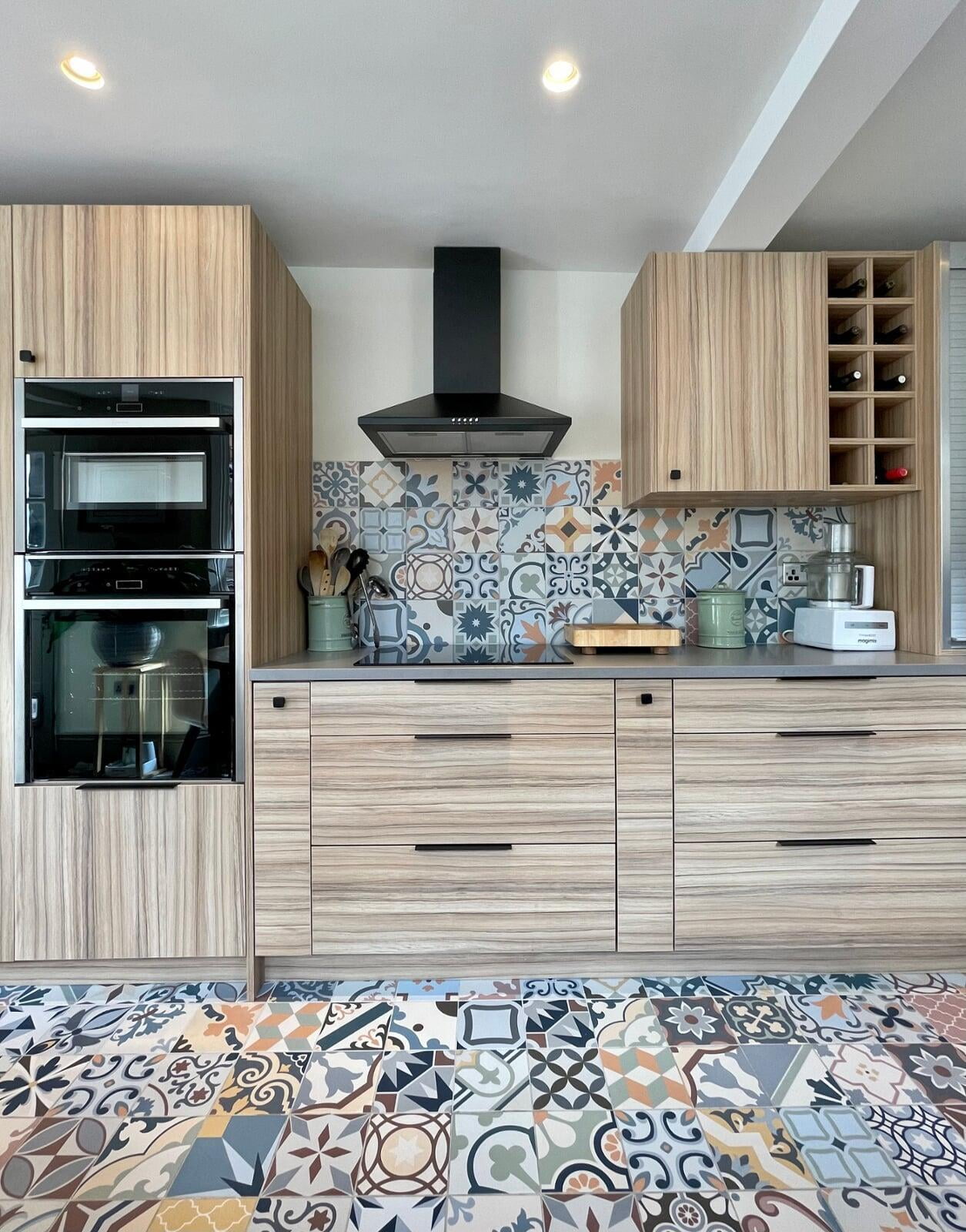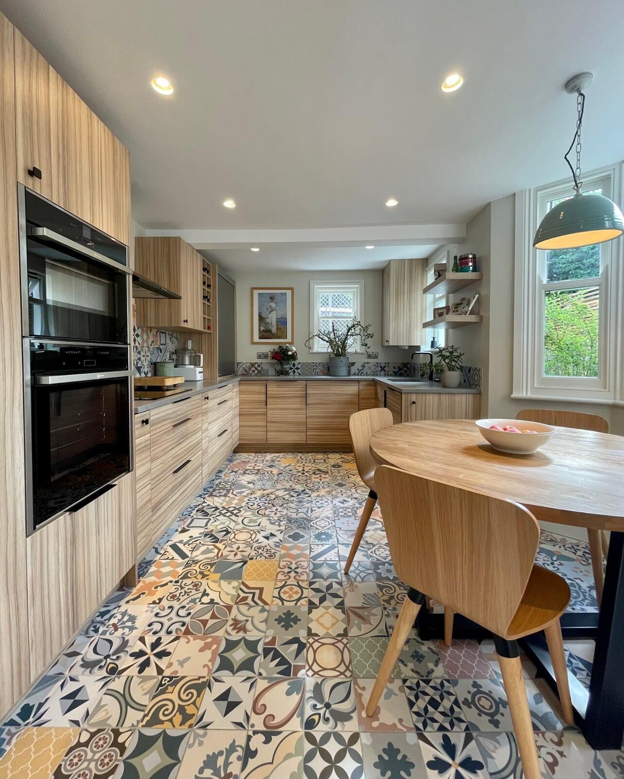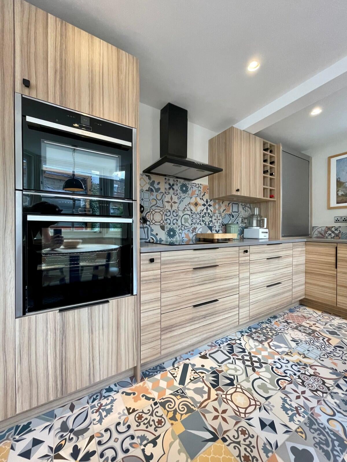 My clients initial concern for this kitchen renovation was how their guinea pig would cope with the upheaval! After some reassurances, the guinea pig was sent on a lovely seaside sabbatical, and we went full steam ahead. The original kitchen in this Victorian terrace was dark and dreary and in need of renovating. The room was very cluttered with little worktop space and virtually no storage. There was also a large chimney breast in the kitchen, and I kept everything crossed that they would agree to remove it as it would give huge scope to what could then be done there. Thankfully, they trusted my recommendation and the chimney breast went. This allowed for masses of storage in the room. Even though the room is filled with cabinets in a very bold wood effect colour scheme with vibrant mix tiles on the floor and walls, the room is significantly lighter and seems so much bigger. It makes you feel happy when you walk into it. I know that my clients love it and I believe the guinea pig is happy too!
