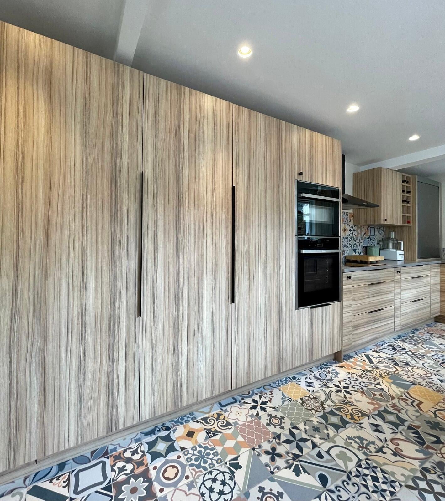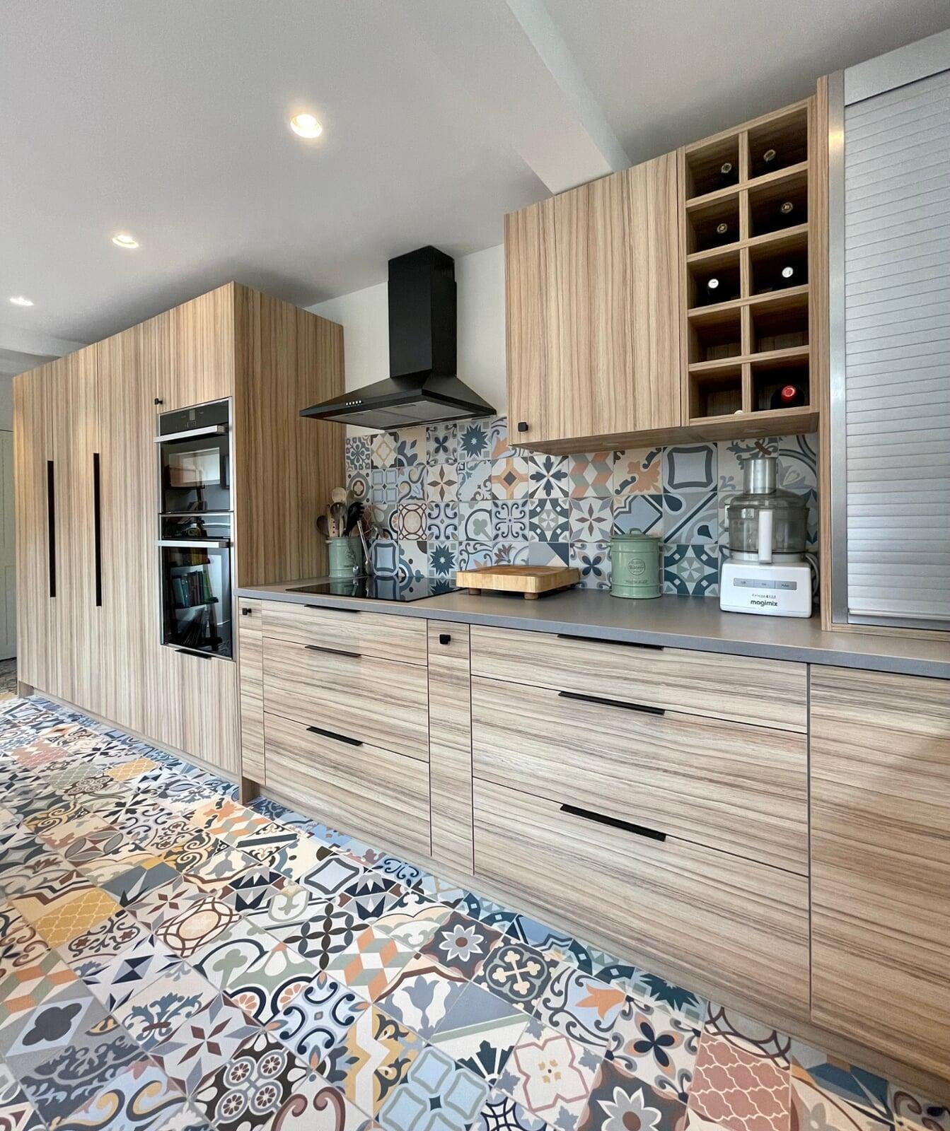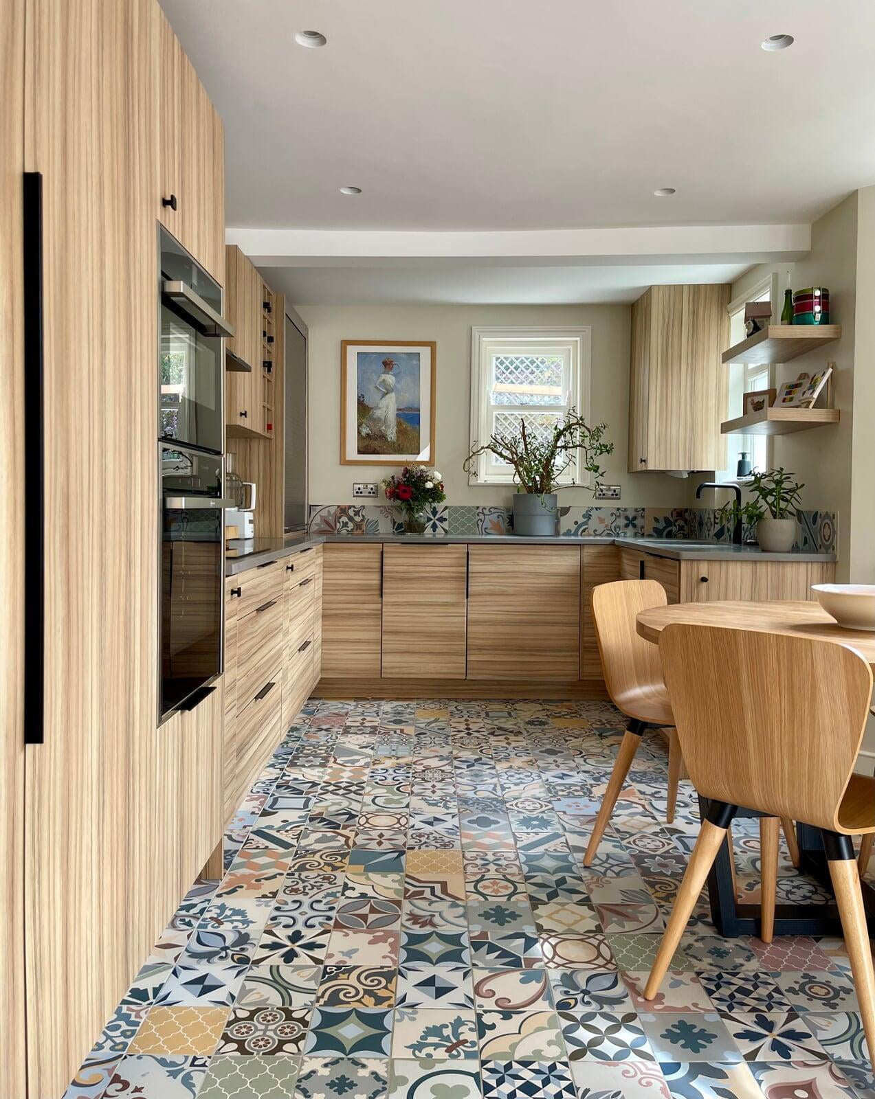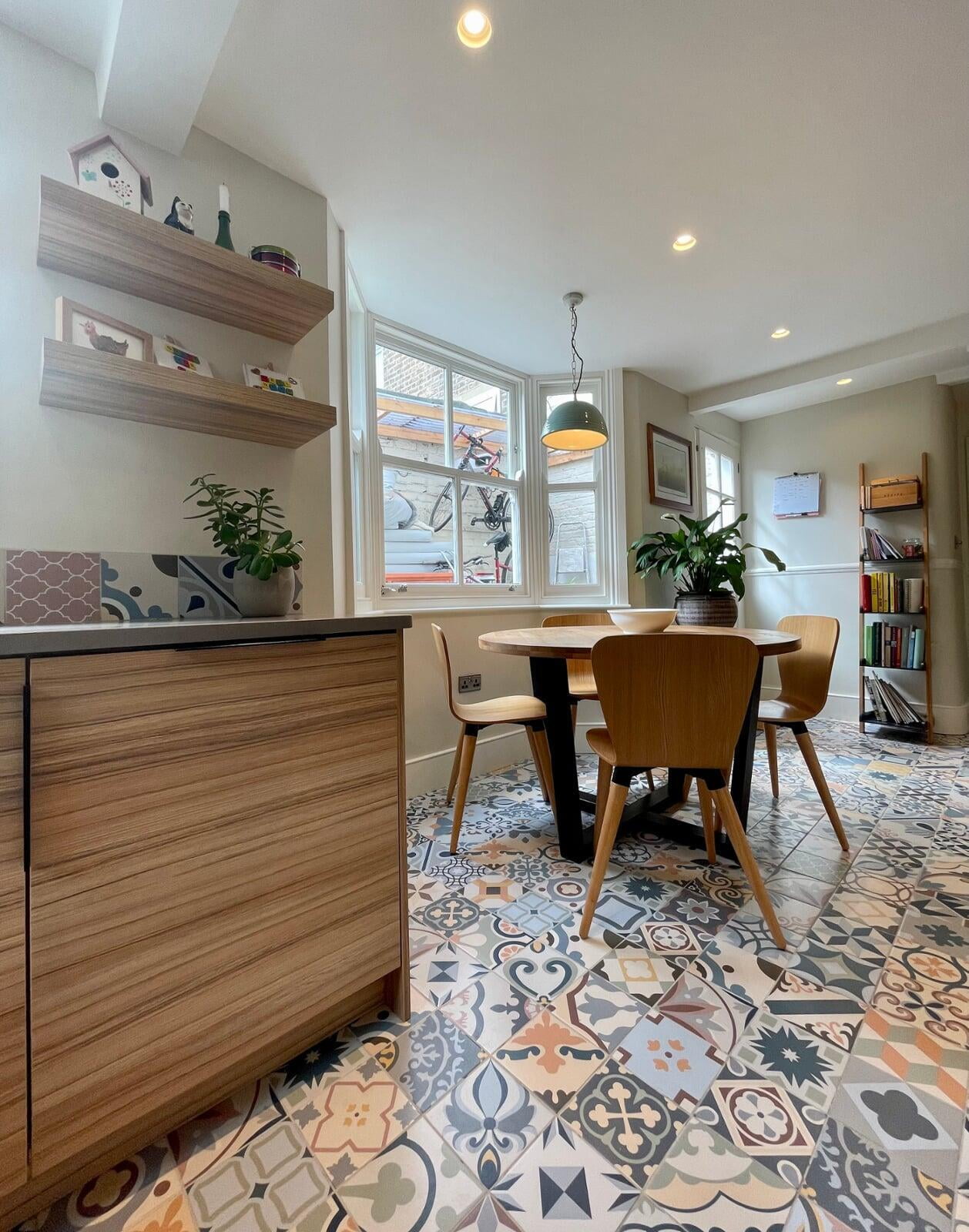 My clients initial concern for this kitchen renovation was how their guinea pig would cope with the upheaval! After some reassurances, the guinea pig was sent on a lovely seaside sabbatical, and we went full steam ahead. The original kitchen in this Victorian terrace was dark and dreary and in need of renovating. The room was very cluttered with little worktop space and virtually no storage. There was also a large chimney breast in the kitchen, and I kept everything crossed that they would agree to remove it as it would give huge scope to what could then be done there. Thankfully, they trusted my recommendation and the chimney breast went. This allowed for masses of storage in the room. Even though the room is filled with cabinets in a very bold wood effect colour scheme with vibrant mix tiles on the floor and walls, the room is significantly lighter and seems so much bigger. It makes you feel happy when you walk into it. I know that my clients love it and I believe the guinea pig is happy too!
