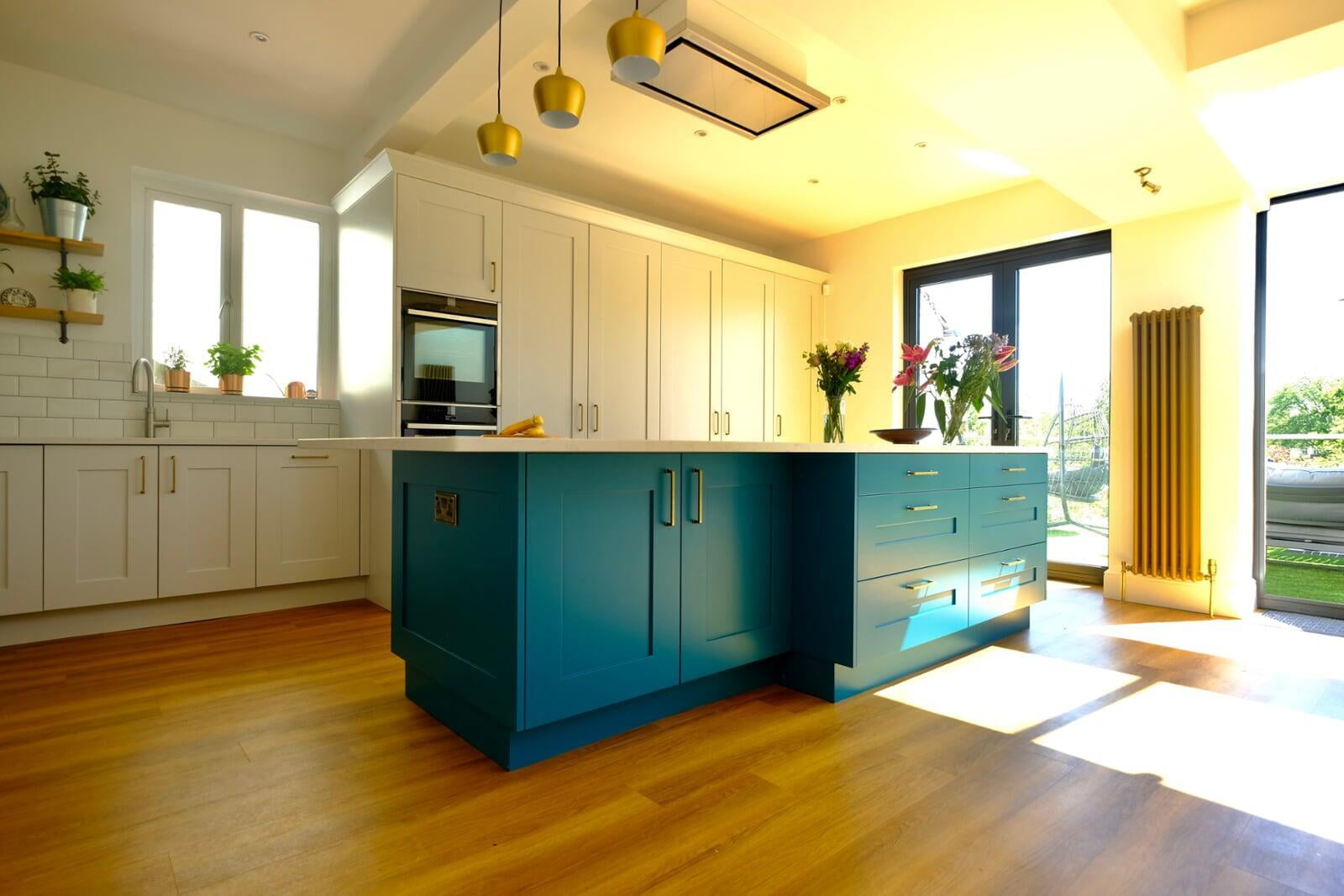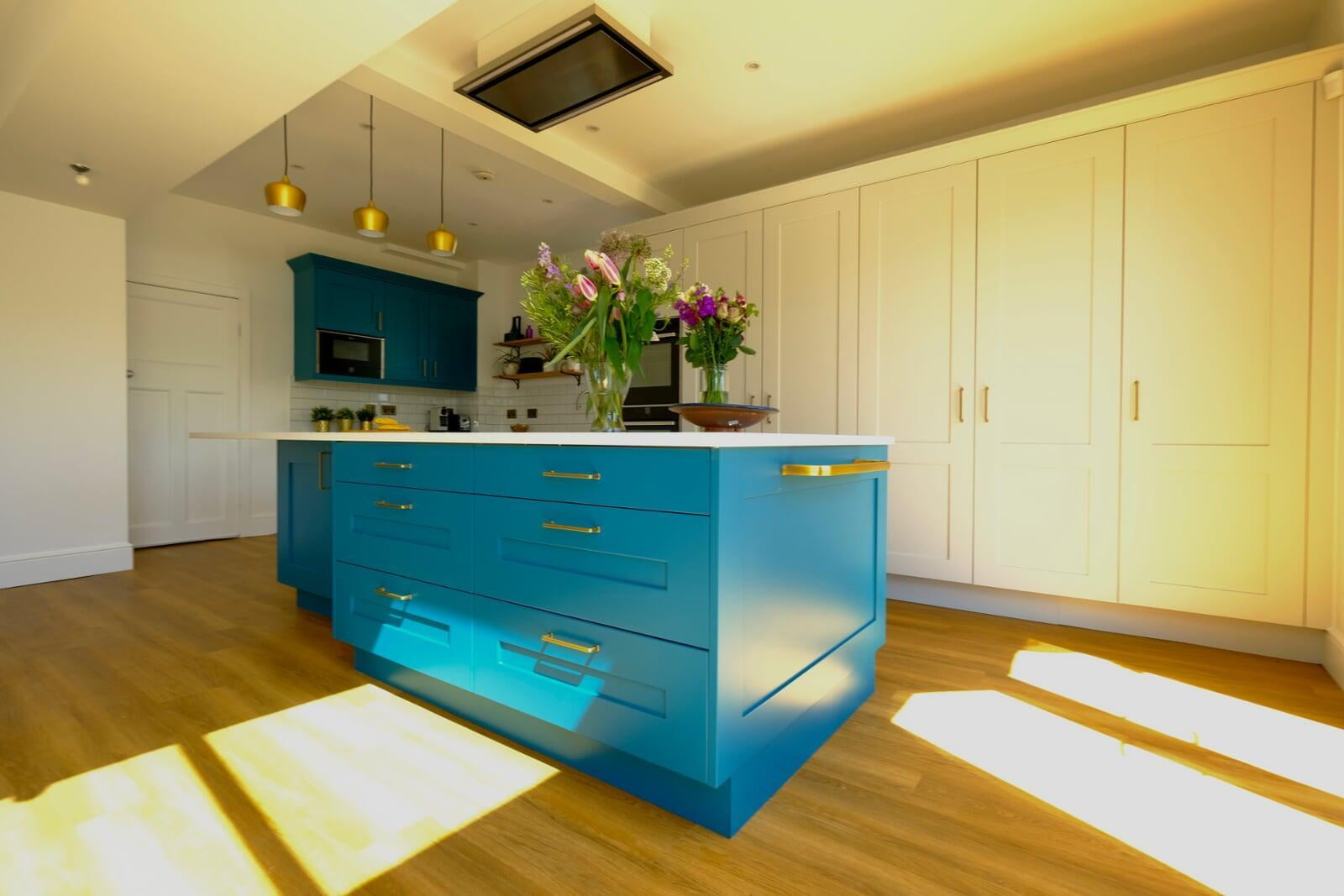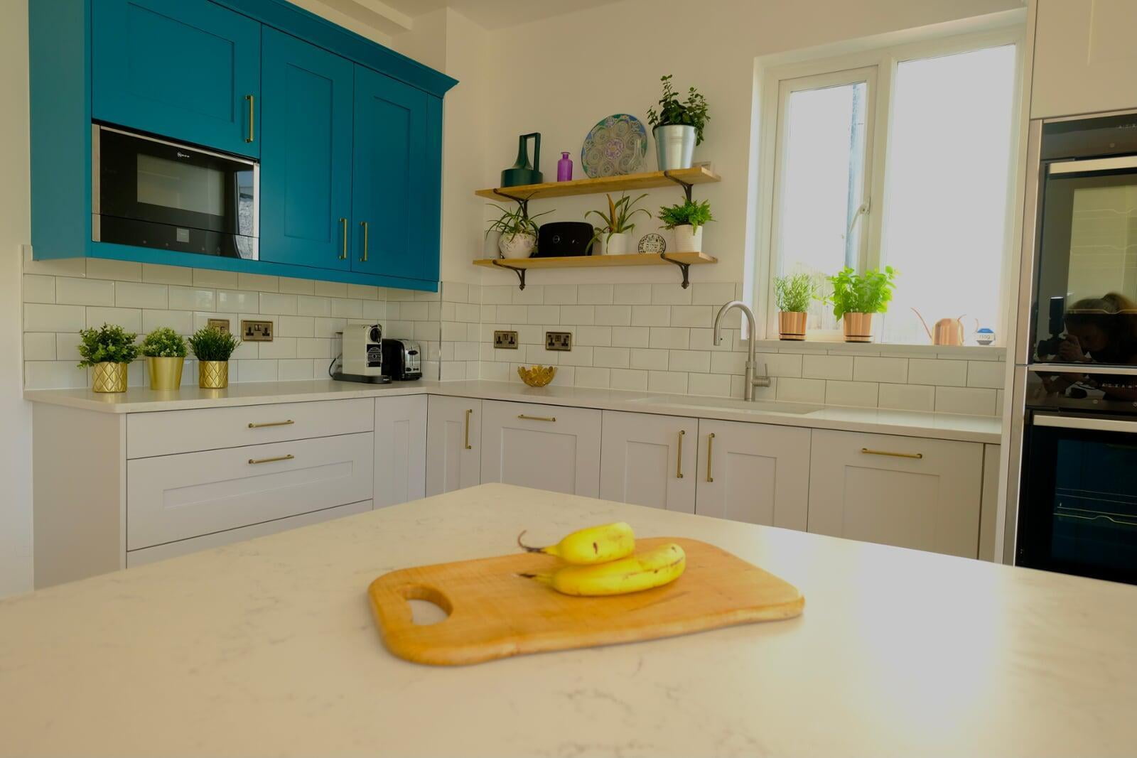 This kitchen has undergone quite the transformation. We renovated an existing extension that was in serious need of updating. It was unattractive and had limited storage and counter space. The stripped-out room had a lot of complicated pillars and posts to navigate and varying ceiling heights to contend with. These had an impact on how we could position the extractor, sink and pendant lights. I really like letting a space dictate the layout and this kitchen is a great example of that. My client who had been dreaming of the perfect kitchen for a very long time had a few qualms about the design because it involved some unusual inclusions due to the restrictions we needed to adhere to. The pendant lights on the island are small and run across the depth of the island rather than width due to one of the many ceiling beams in the room. We utilised a high-quality recirculating extractor rather than ducting it outside. Originally, there was an opening into a small cupboard housing a washing machine and tumble dryer. We blocked this up and moved the washing machine and dryer upstairs. This enabled us to run the units all the way along the back wall which meant we could have a full run of tall units which would then hide the different ceiling heights and wall depths along there. The access to that original cupboard is now outside and is a great little cupboard housing gardening equipment. The kitchen now has some superb storage. It looks beautiful with the brass accents, metro tile backsplash and a stunning Nile Carrara honed quartz worktop. My client finally has her dream kitchen!