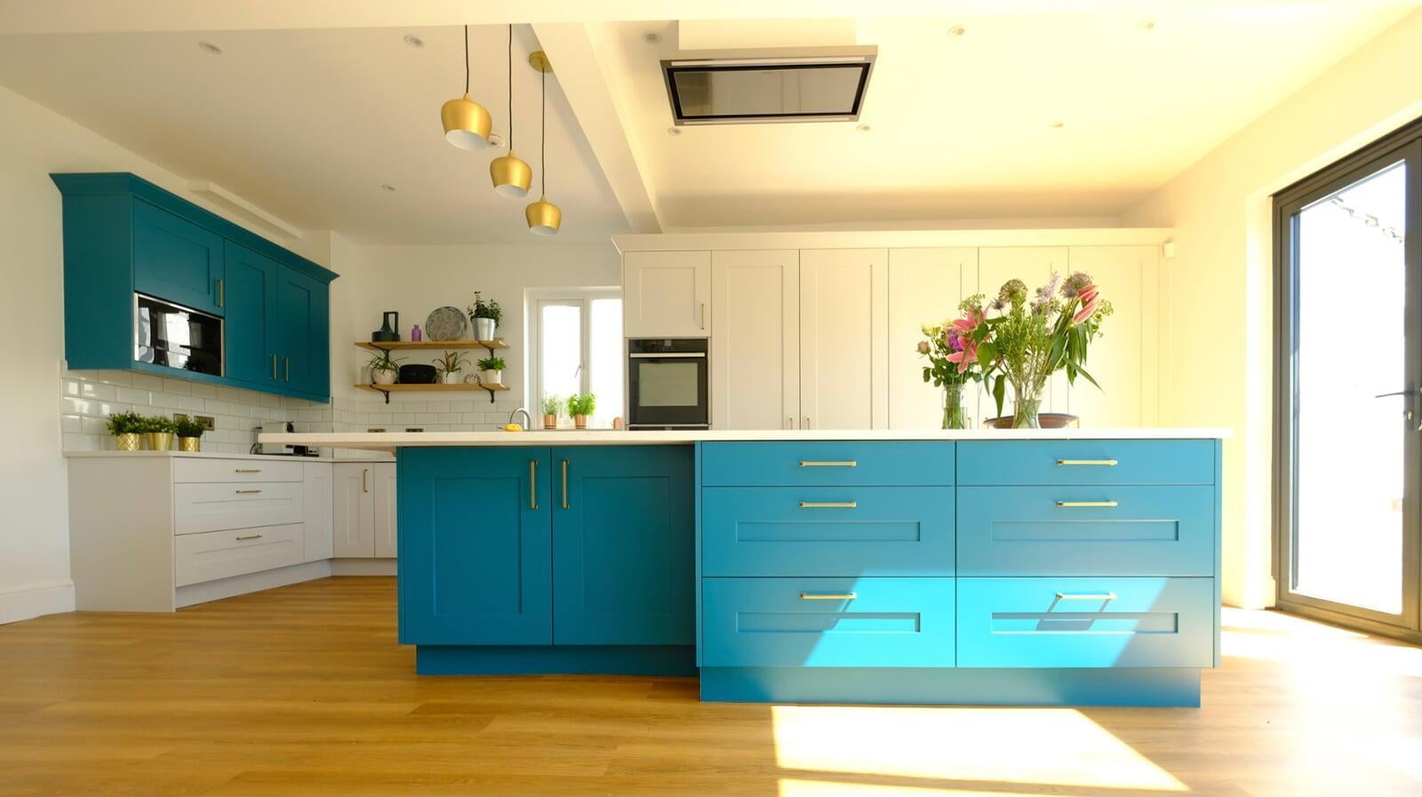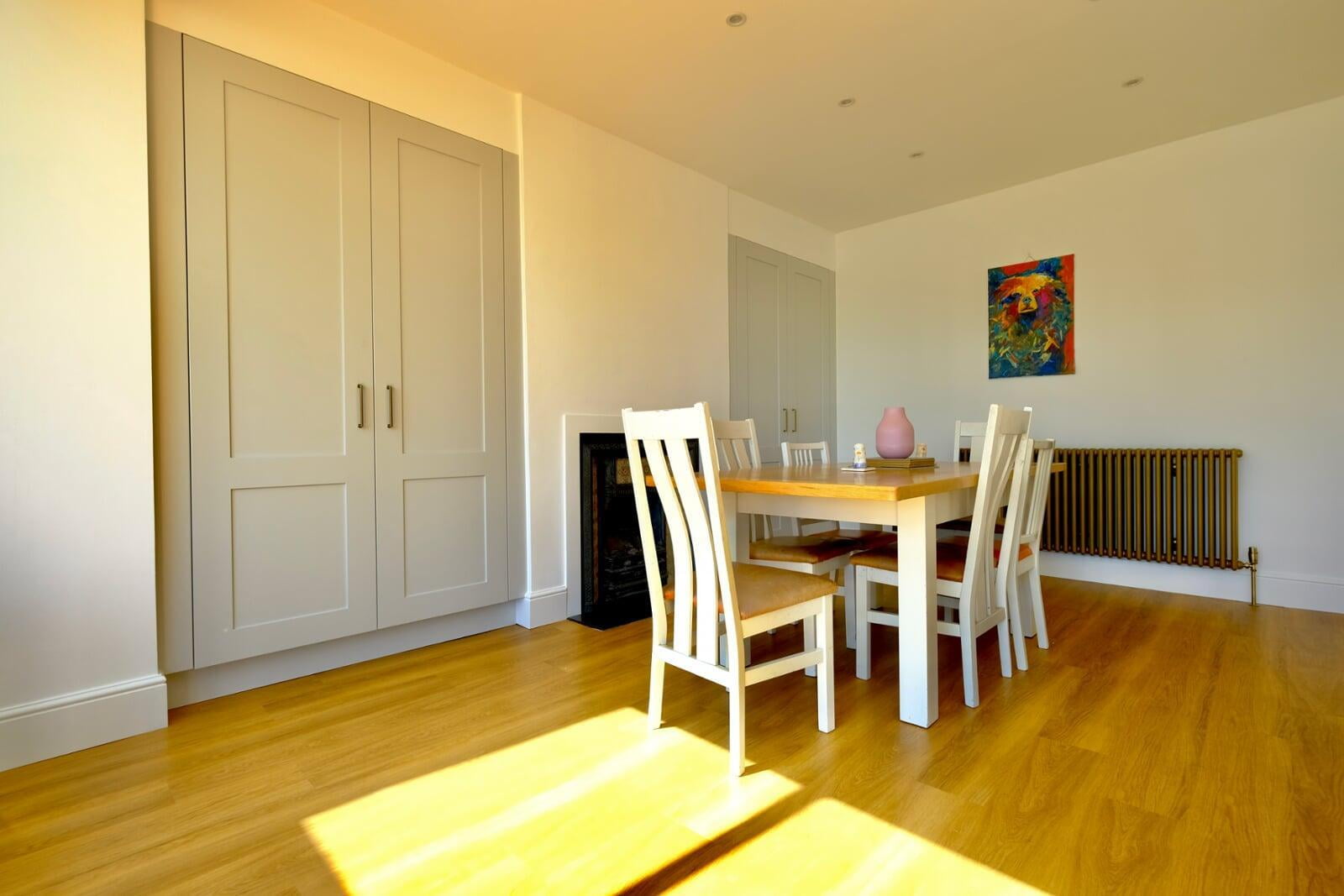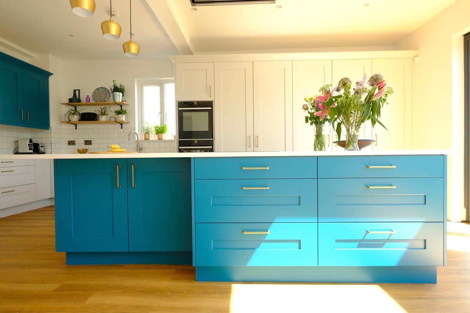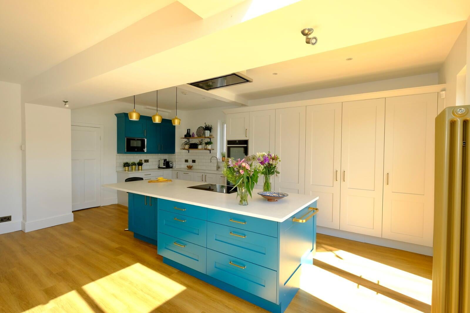 This kitchen has undergone quite the transformation. We renovated an existing extension that was in serious need of updating. It was unattractive and had limited storage and counter space. The stripped-out room had a lot of complicated pillars and posts to navigate and varying ceiling heights to contend with. These had an impact on how we could position the extractor, sink and pendant lights. I really like letting a space dictate the layout and this kitchen is a great example of that. My client who had been dreaming of the perfect kitchen for a very long time had a few qualms about the design because it involved some unusual inclusions due to the restrictions we needed to adhere to. The pendant lights on the island are small and run across the depth of the island rather than width due to one of the many ceiling beams in the room. We utilised a high-quality recirculating extractor rather than ducting it outside. Originally, there was an opening into a small cupboard housing a washing machine and tumble dryer. We blocked this up and moved the washing machine and dryer upstairs. This enabled us to run the units all the way along the back wall which meant we could have a full run of tall units which would then hide the different ceiling heights and wall depths along there. The access to that original cupboard is now outside and is a great little cupboard housing gardening equipment. The kitchen now has some superb storage. It looks beautiful with the brass accents, metro tile backsplash and a stunning Nile Carrara honed quartz worktop. My client finally has her dream kitchen!