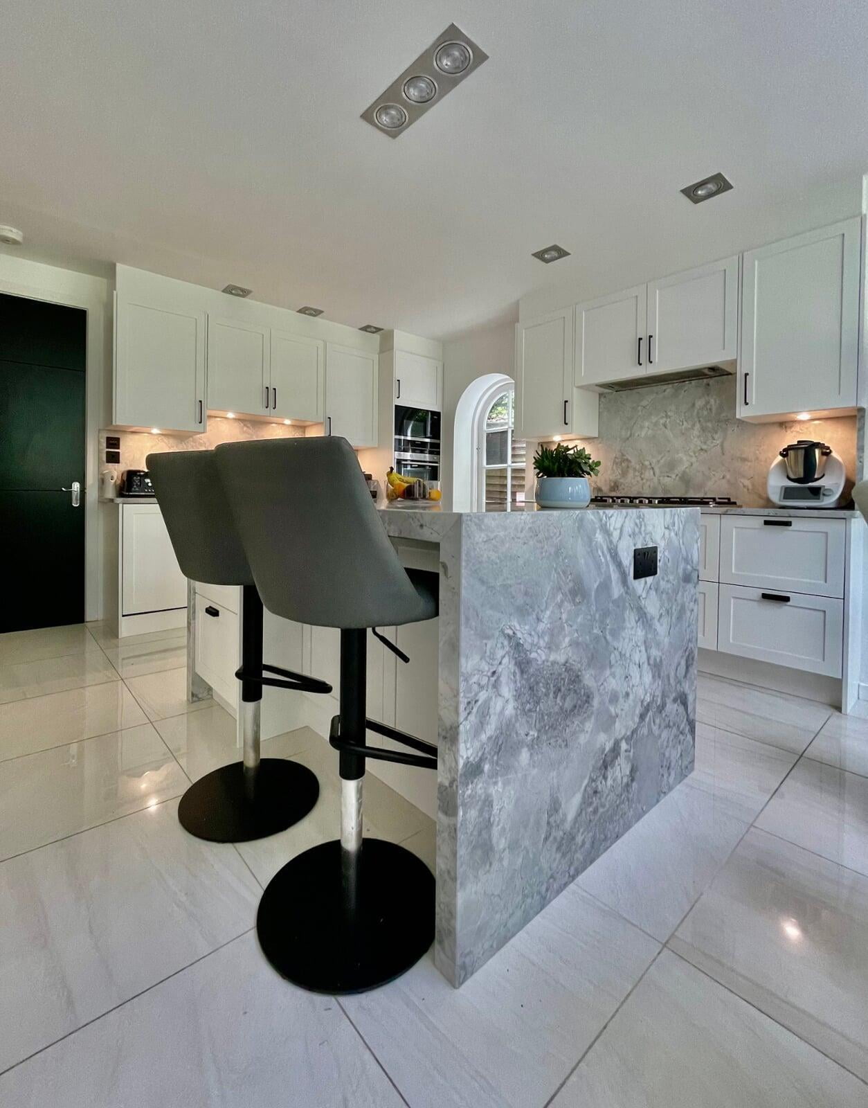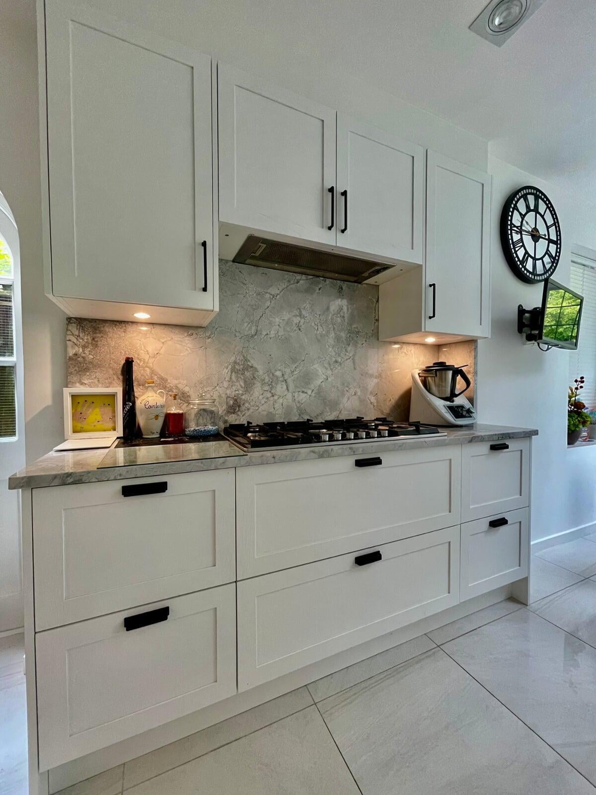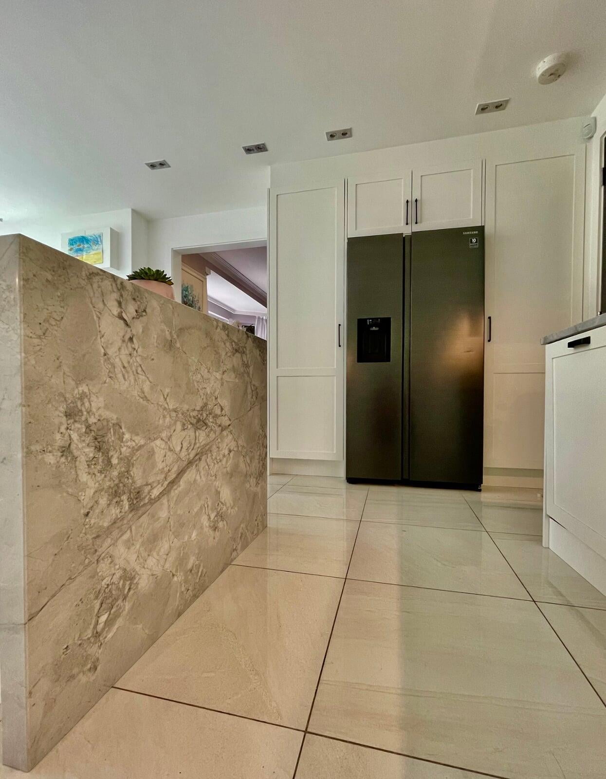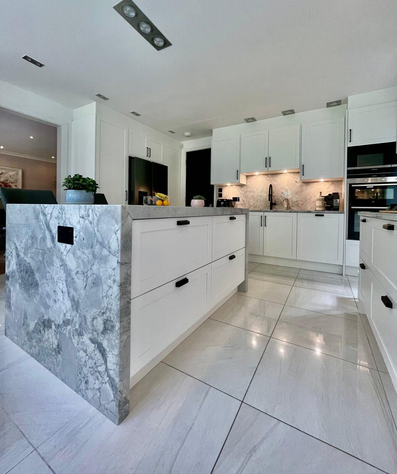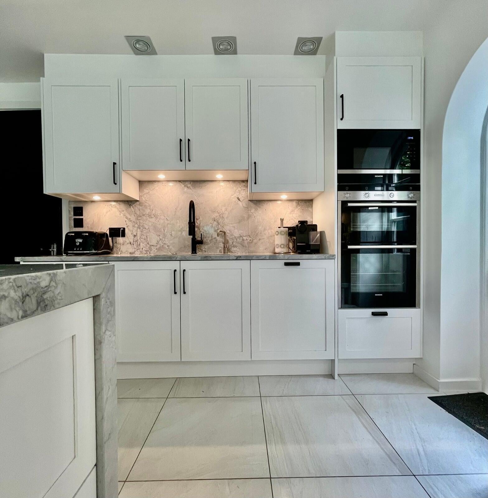 This kitchen renovation wasn’t massively different to what was originally there. However, we did tweak a lot of the cabinetry to improve storage and the kitchen overall is lighter, brighter and much more efficient. We utilised Bianca Eclipsia natural granite on the worktop and backsplash which is the most equisite stone. The island is not big, but by building up the thickness of the stone here to 80mm, the island looks far bigger and grander than it actually is. The stone is definitely and quite rightly the star of the show and the first thing you notice as you enter the room. My client has indicated they would like to work with me on future projects and it would be great to work with them again.