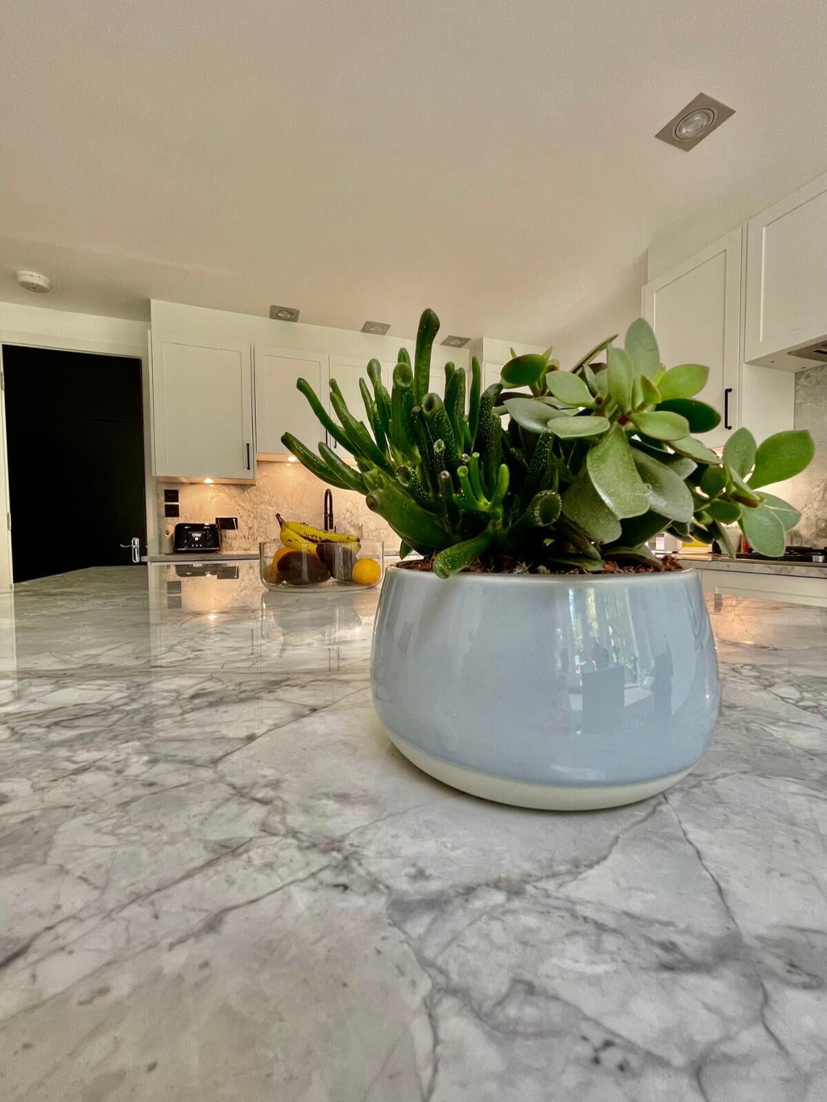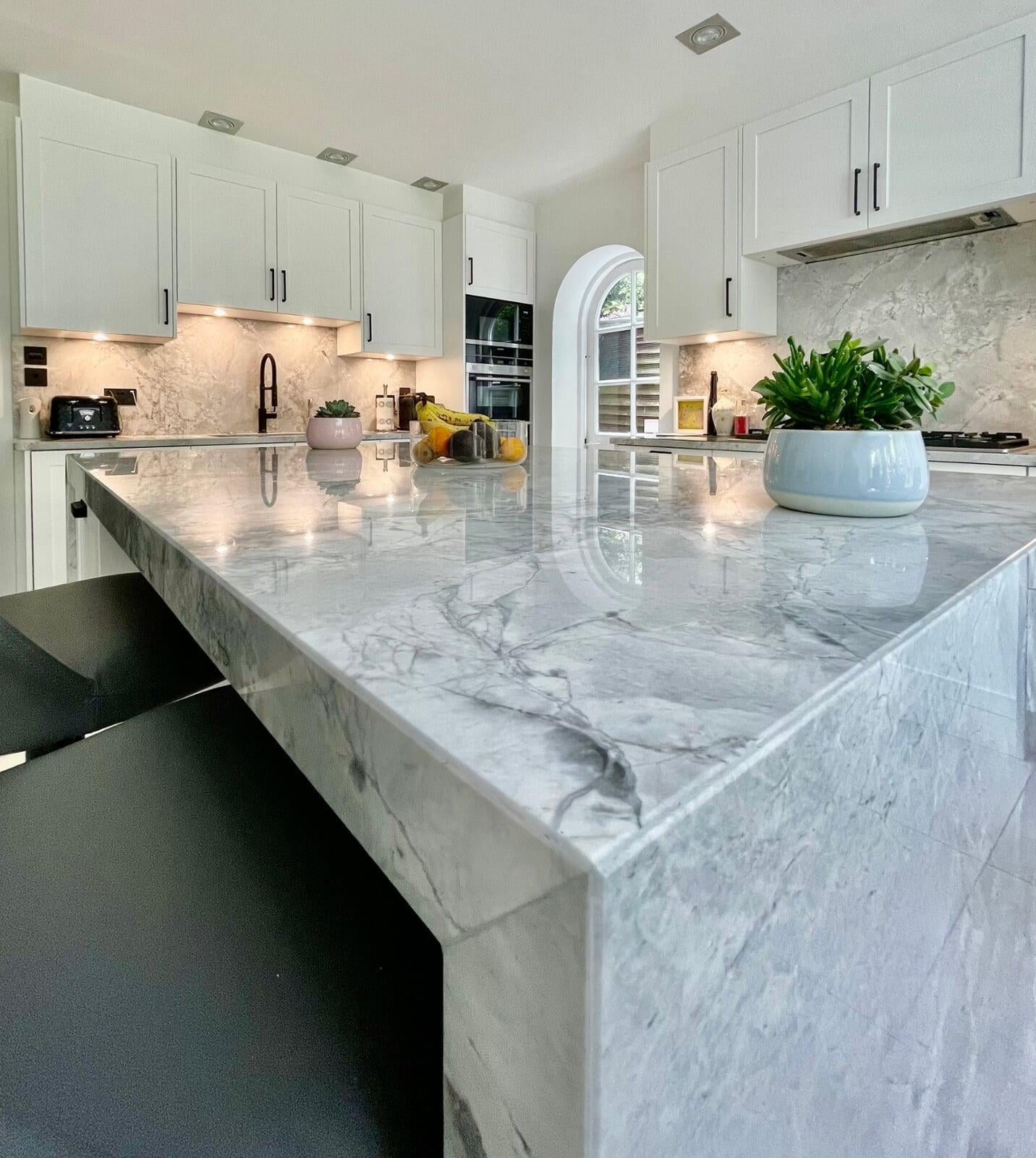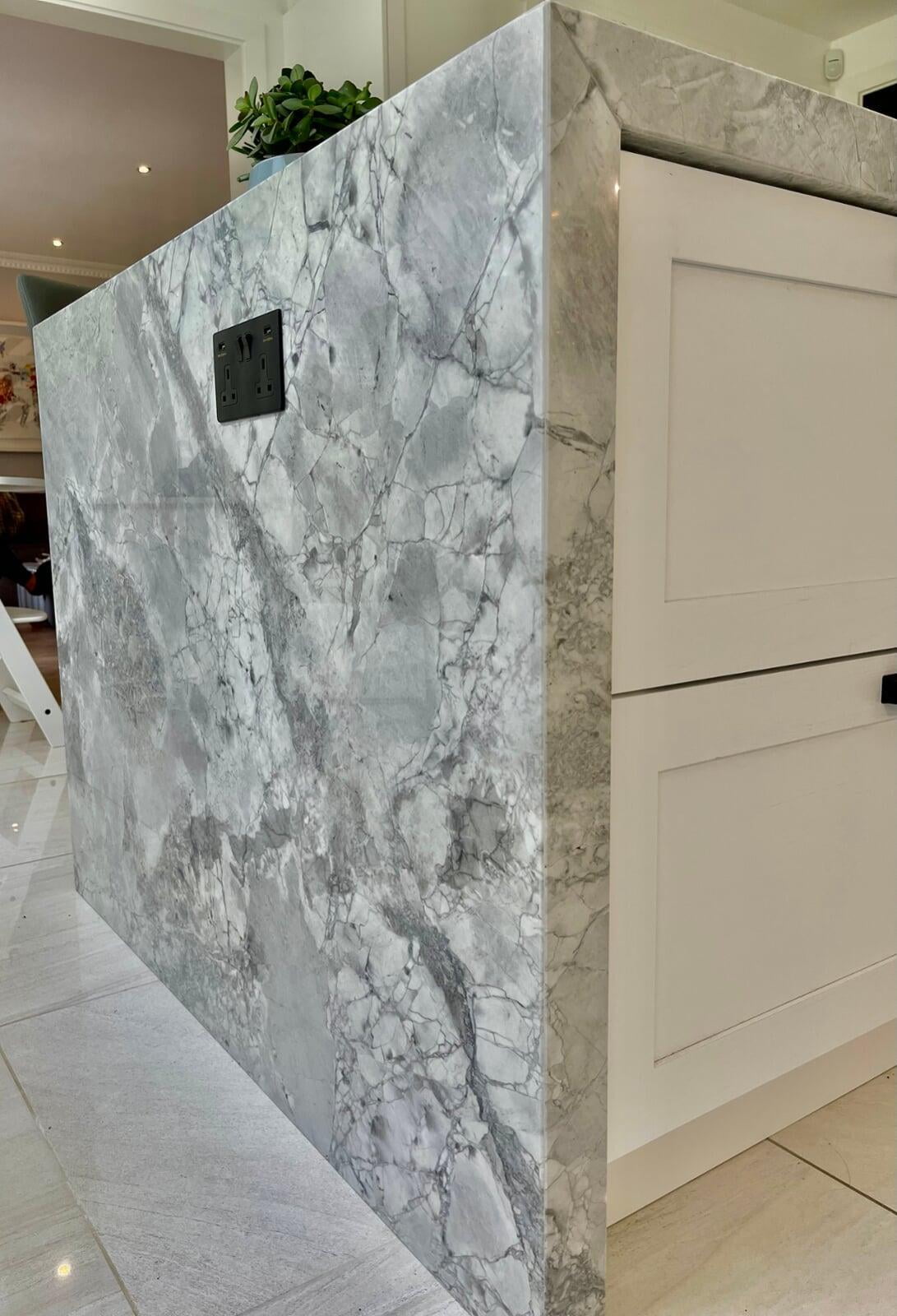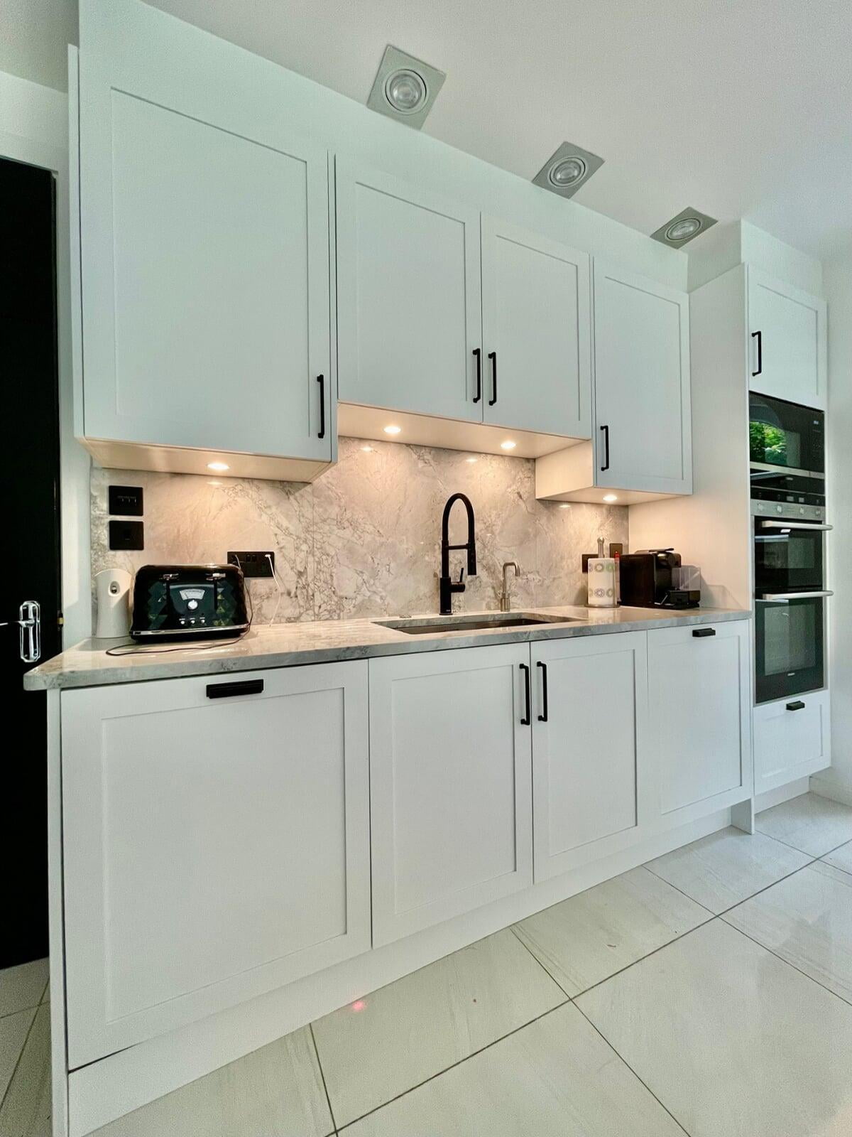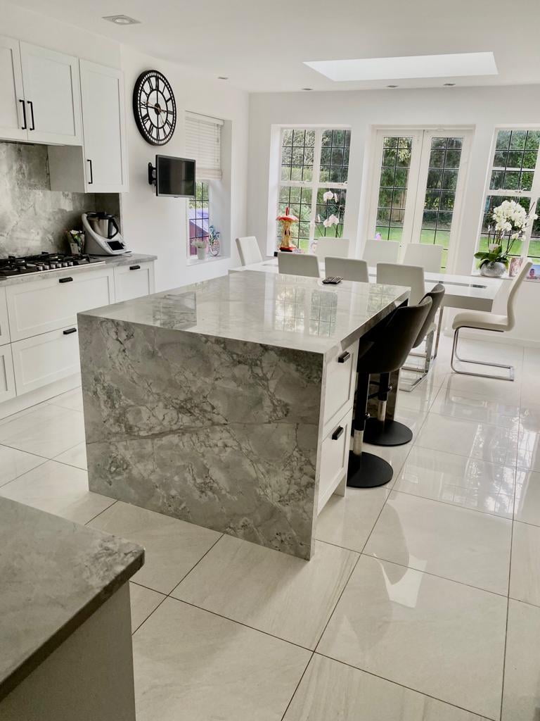 This kitchen renovation wasn’t massively different to what was originally there. However, we did tweak a lot of the cabinetry to improve storage and the kitchen overall is lighter, brighter and much more efficient. We utilised Bianca Eclipsia natural granite on the worktop and backsplash which is the most equisite stone. The island is not big, but by building up the thickness of the stone here to 80mm, the island looks far bigger and grander than it actually is. The stone is definitely and quite rightly the star of the show and the first thing you notice as you enter the room. My client has indicated they would like to work with me on future projects and it would be great to work with them again.