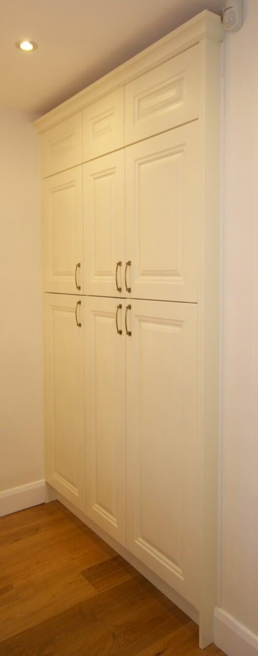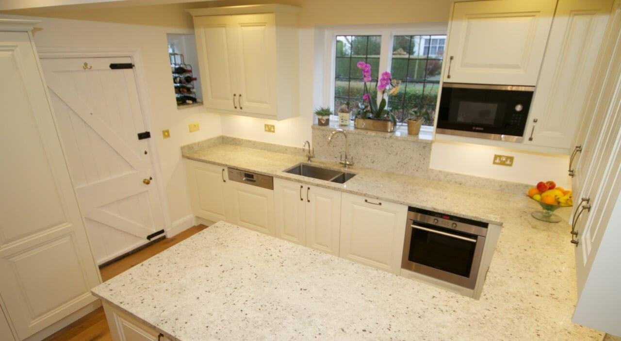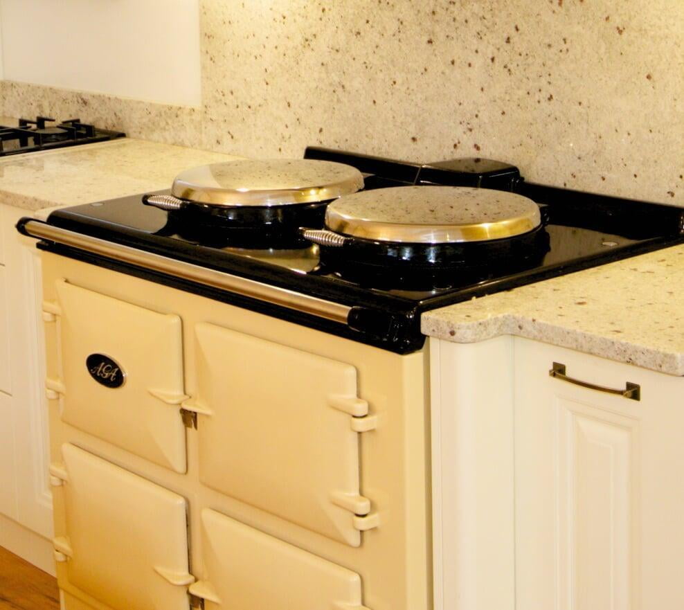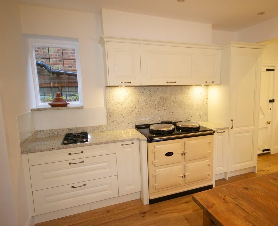 My client chose a classic ivory shaker kitchen with a door style that has some lovely ornate grooving. I wish I had taken some ‘before’ photos as this was quite the transformation! My client had very little counter space and the kitchen was dark and dreary and felt very small. Even though there was no extension work involved, by lightening the colour scheme and creating the right layout, the room just seems so much bigger now. We put in so much cabinetry into this scheme and incorporated many integrated appliances at base level. The client chose a beautiful granite worktop which compliments the cabinetry beautifully. In order to make a feature of her new AGA, we also put in some lovely curved end panels either side of it.