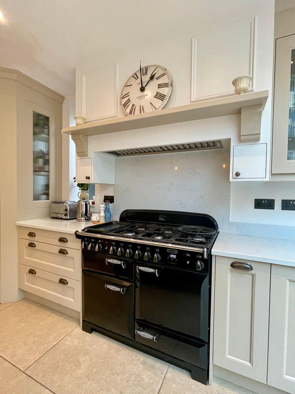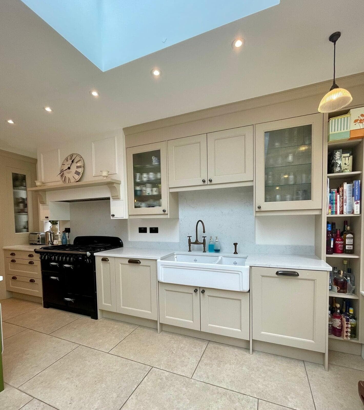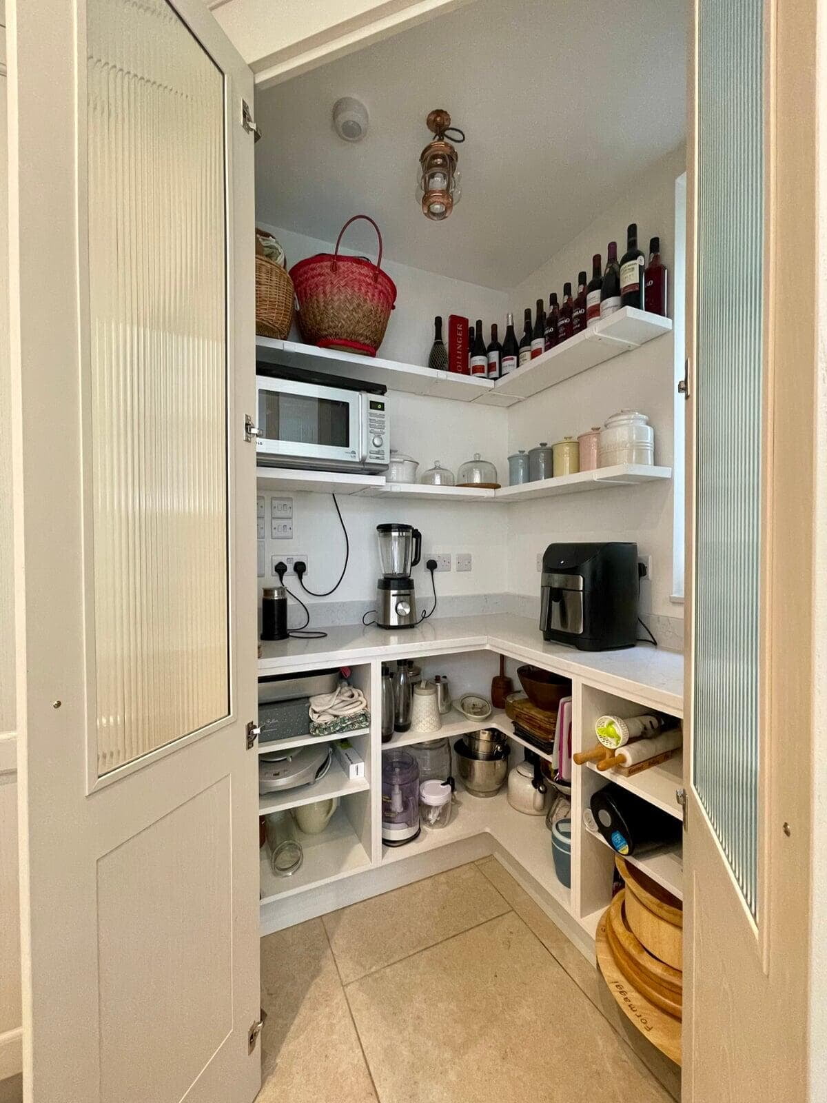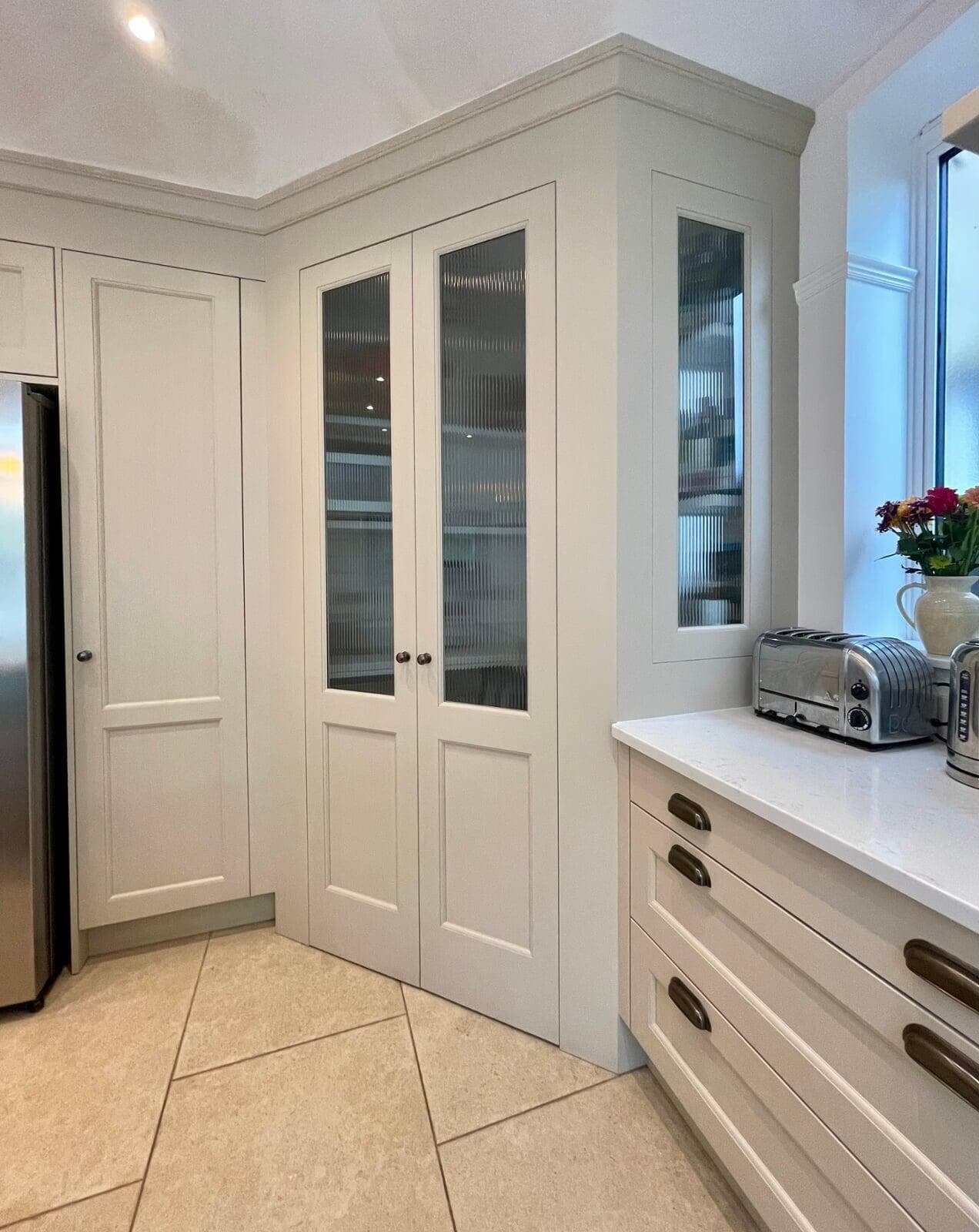 My client’s first question when enquiring about a new kitchen was whether I would be able to create a corner walk in pantry with a glass window and glazed doors. My client had seen an image of this online and was keen to recreate it. He had tried several other kitchen companies to see if they could help him. While they had answered in the negative, my answer was an immediate yes! I designed the kitchen around this unique corner feature which we created exactly to the client’s specification. The corner walk in pantry with its reeded glass doors and side window is a beautiful feature in this traditional kitchen. The dimensions of it are perfect as it provides some great storage and a very useful extra section of worktop space. While the walk in pantry is a large corner feature, it isn’t at all bulky and the rest of the kitchen flows beautifully around it. The style of the kitchen is traditional with some lovely period features in keeping with their aesthetic. The range cooker and its surrounding mantel, the Belfast sink, bronze tap, bronze handles and the detailed shaker doors define a classically elegant scheme. It’s a beautiful room and one my clients are enjoying hugely. It was a pleasure to help them, and I’m proud that we were able to give them exactly what they wanted compared to other kitchen companies they had approached who couldn’t meet their requirements.