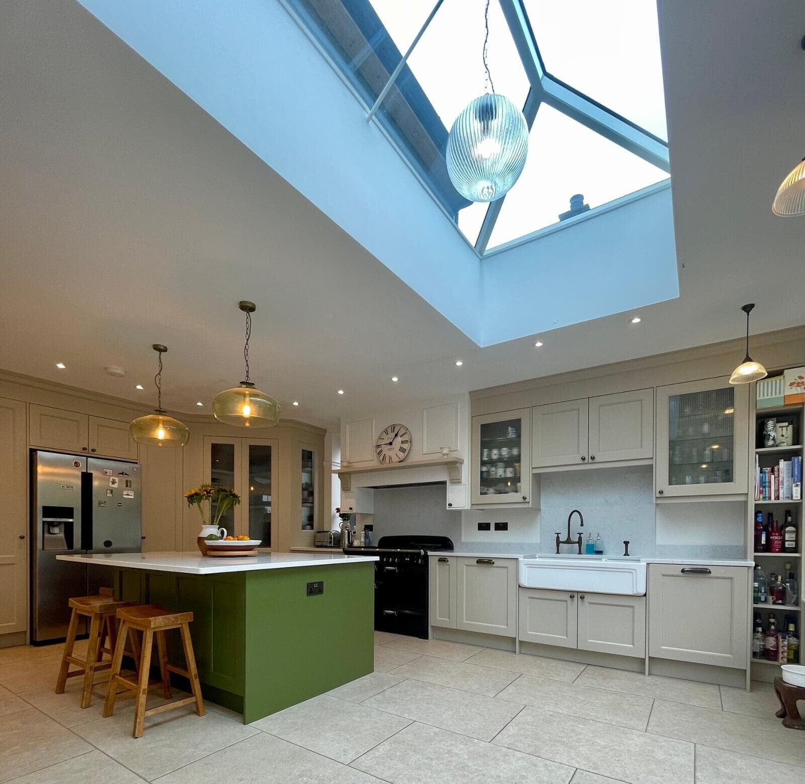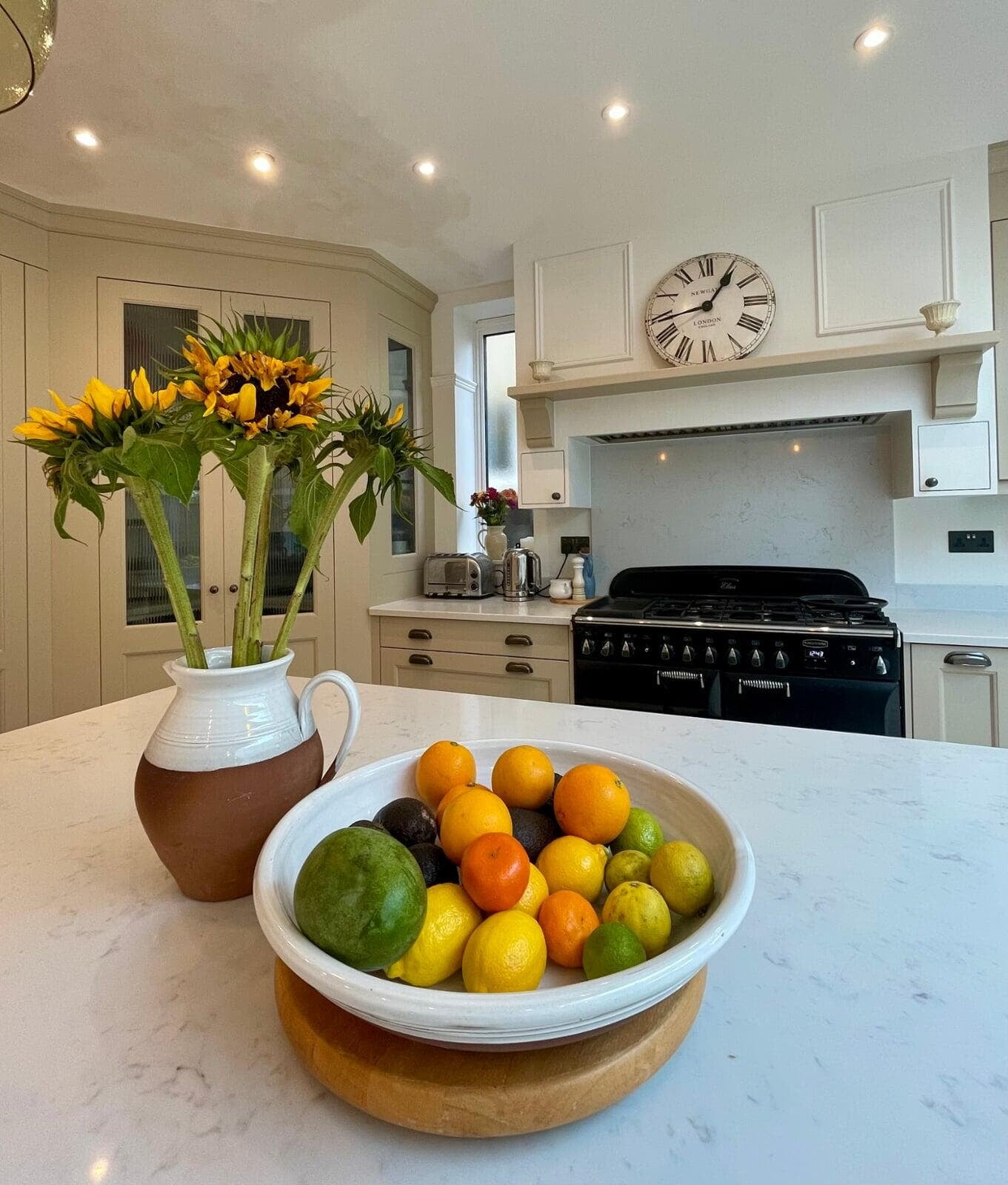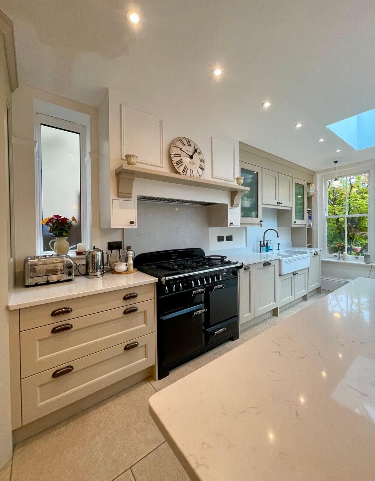 My client’s first question when enquiring about a new kitchen was whether I would be able to create a corner walk in pantry with a glass window and glazed doors. My client had seen an image of this online and was keen to recreate it. He had tried several other kitchen companies to see if they could help him. While they had answered in the negative, my answer was an immediate yes! I designed the kitchen around this unique corner feature which we created exactly to the client’s specification. The corner walk in pantry with its reeded glass doors and side window is a beautiful feature in this traditional kitchen. The dimensions of it are perfect as it provides some great storage and a very useful extra section of worktop space. While the walk in pantry is a large corner feature, it isn’t at all bulky and the rest of the kitchen flows beautifully around it. The style of the kitchen is traditional with some lovely period features in keeping with their aesthetic. The range cooker and its surrounding mantel, the Belfast sink, bronze tap, bronze handles and the detailed shaker doors define a classically elegant scheme. It’s a beautiful room and one my clients are enjoying hugely. It was a pleasure to help them, and I’m proud that we were able to give them exactly what they wanted compared to other kitchen companies they had approached who couldn’t meet their requirements.