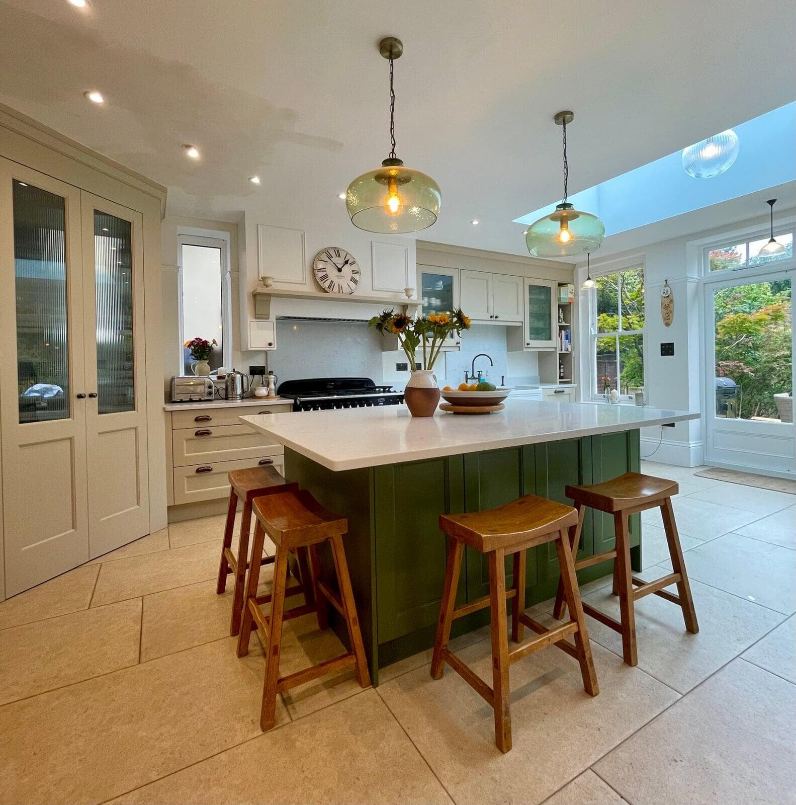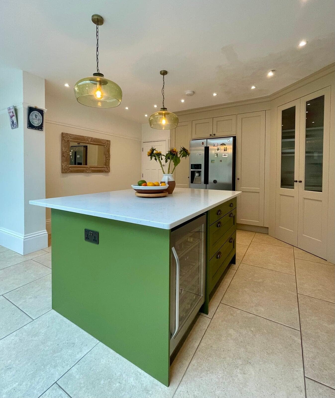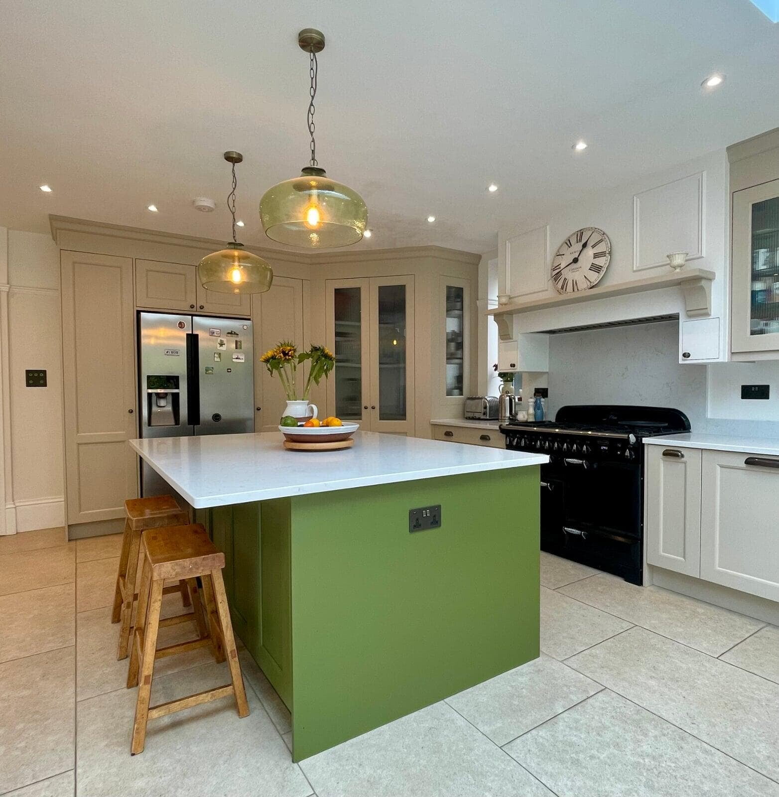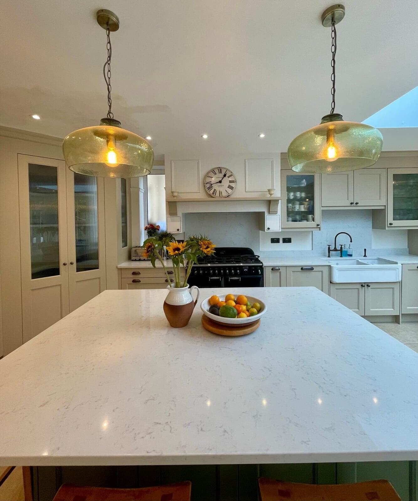 My client’s first question when enquiring about a new kitchen was whether I would be able to create a corner walk in pantry with a glass window and glazed doors. My client had seen an image of this online and was keen to recreate it. He had tried several other kitchen companies to see if they could help him. While they had answered in the negative, my answer was an immediate yes! I designed the kitchen around this unique corner feature which we created exactly to the client’s specification. The corner walk in pantry with its reeded glass doors and side window is a beautiful feature in this traditional kitchen. The dimensions of it are perfect as it provides some great storage and a very useful extra section of worktop space. While the walk in pantry is a large corner feature, it isn’t at all bulky and the rest of the kitchen flows beautifully around it. The style of the kitchen is traditional with some lovely period features in keeping with their aesthetic. The range cooker and its surrounding mantel, the Belfast sink, bronze tap, bronze handles and the detailed shaker doors define a classically elegant scheme. It’s a beautiful room and one my clients are enjoying hugely. It was a pleasure to help them, and I’m proud that we were able to give them exactly what they wanted compared to other kitchen companies they had approached who couldn’t meet their requirements.
