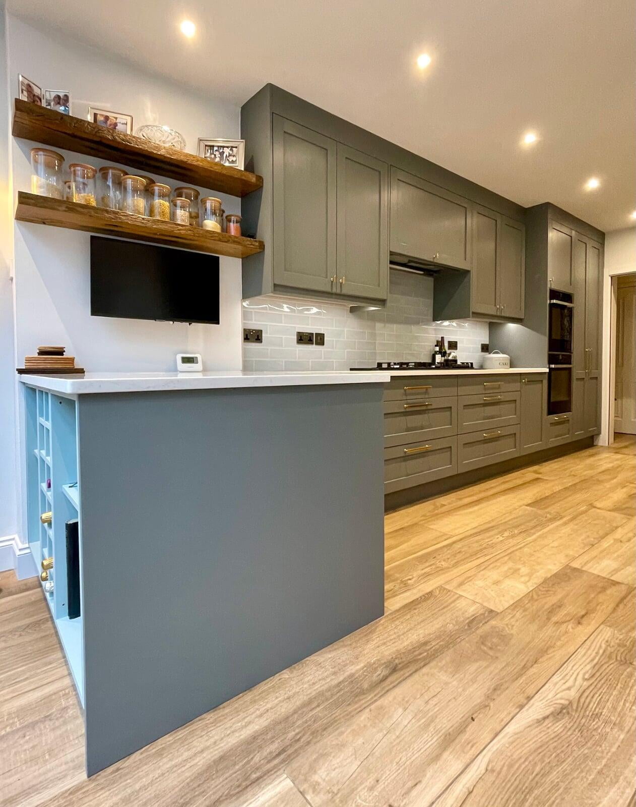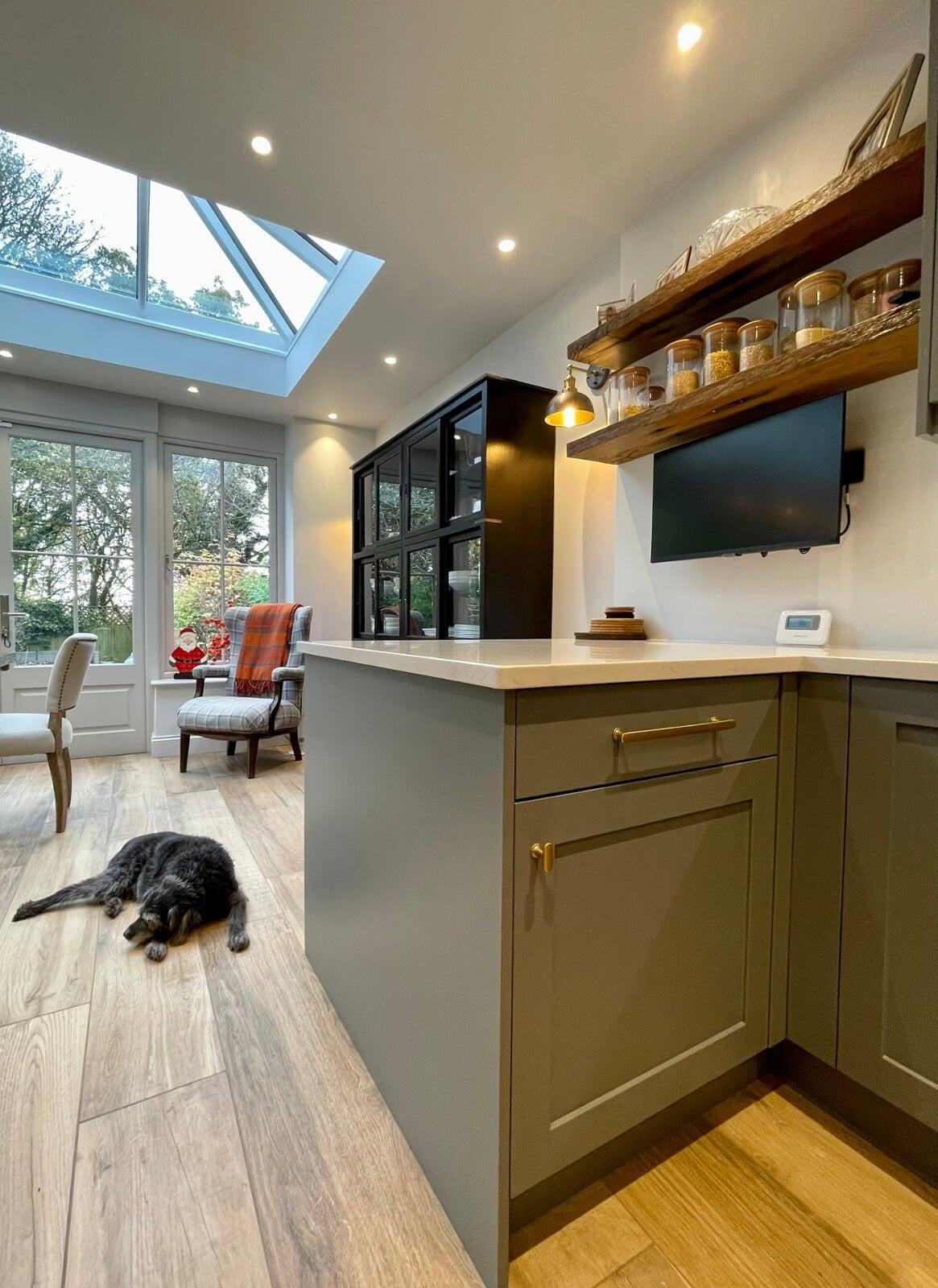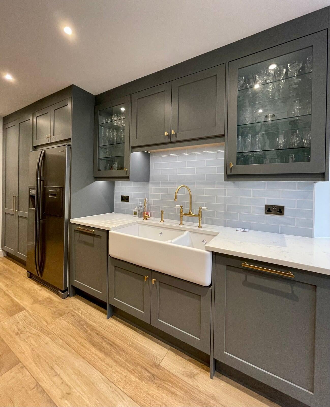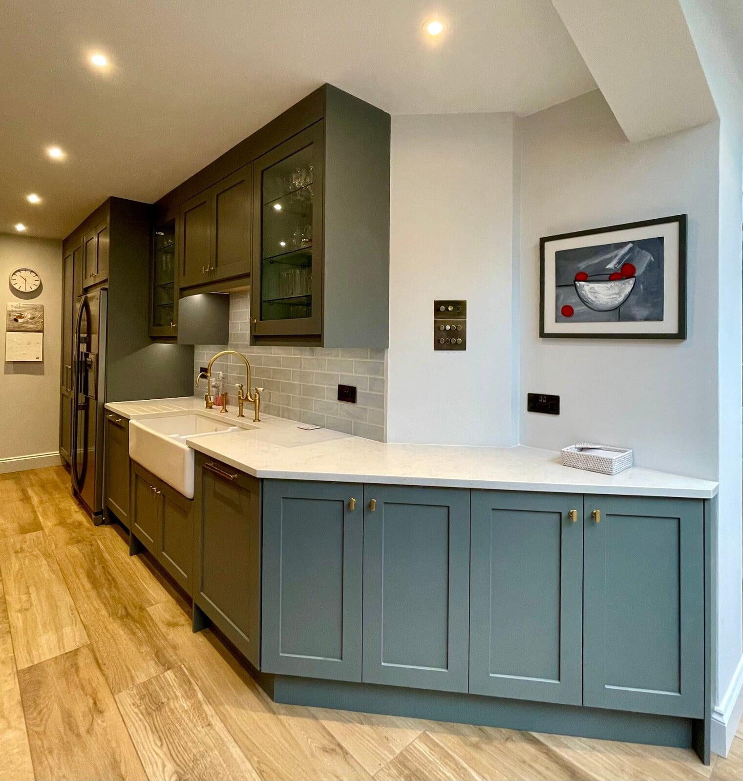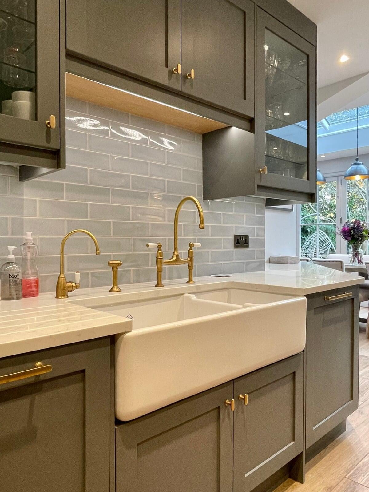 This kitchen forms part of a beautiful orangery extension built by the brilliant team at Malbrook Conservatories. Our first Orangery project, we wanted to make sure that the flow between the kitchen and the magnificent extension would be perfect. We spent a lot of time with the clients reviewing colour schemes and the layout of both spaces as it was essential that they would work as one seamless space. The kitchen has some superb storage with a magnificent double pantry with oak internals and a double larder with 5 large pull-out drawers. The shaker cabinetry is hand painted in Little Greene’s Livid and finished with a polished Nile Carrara quartz worktop. We painted the open units and inside the glazed units a contrasting shade of light blue to make an interesting feature. The most exquisite handmade Shaws of Darwen double sink with beautiful brass Perrin & Rowe taps complete the scheme. The space has been accessorised brilliantly with some rustic and industrial features with the addition of the lighting, railing sleeper beams and sliding door dresser unit.