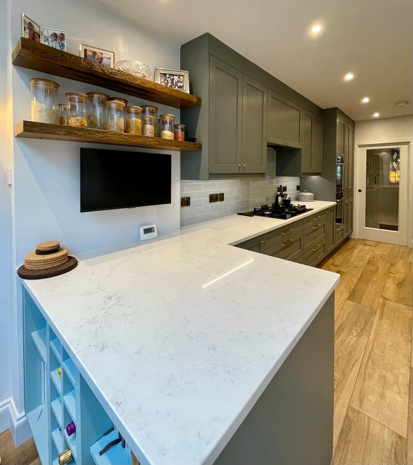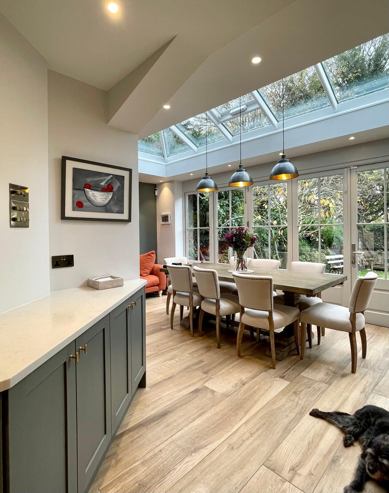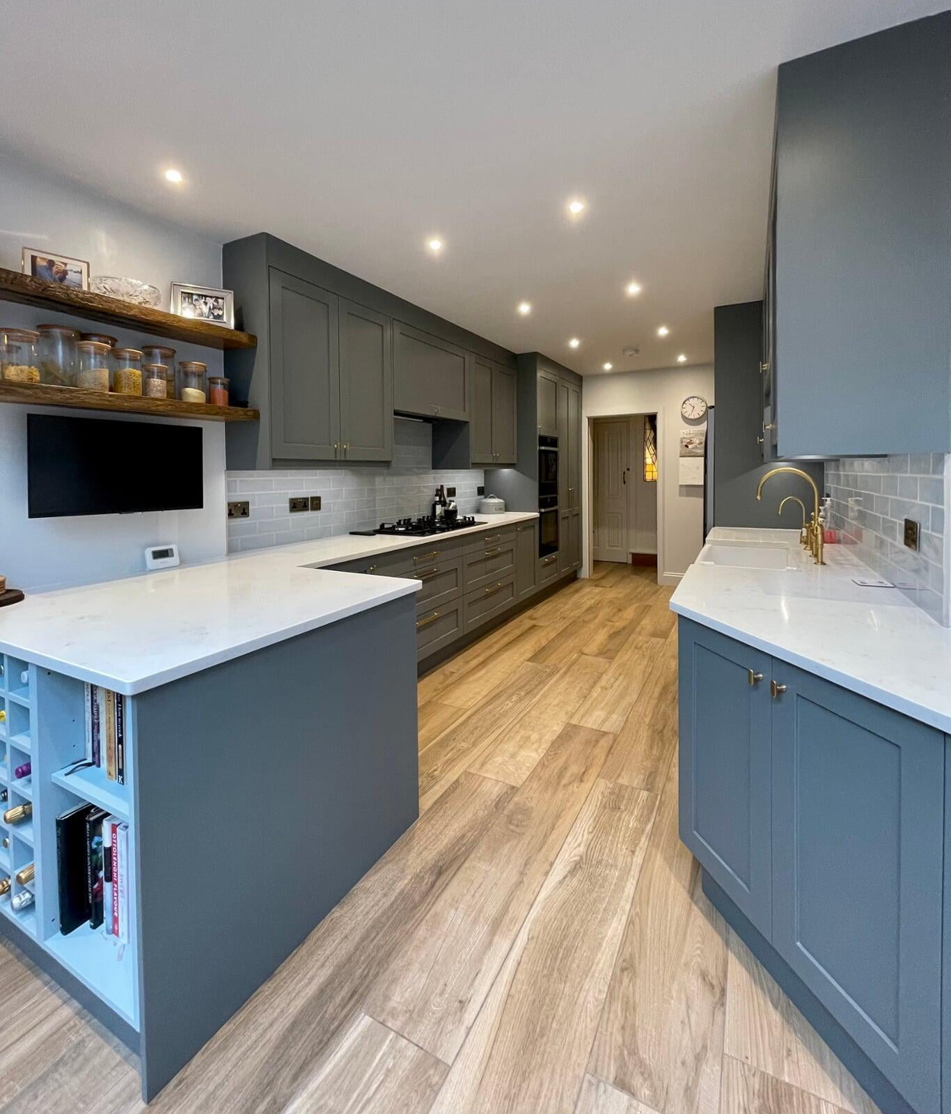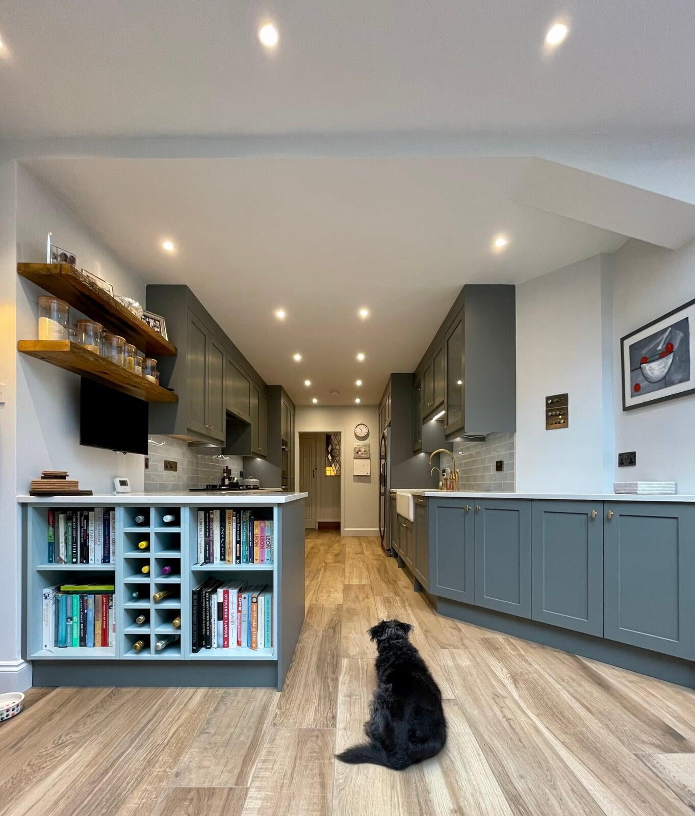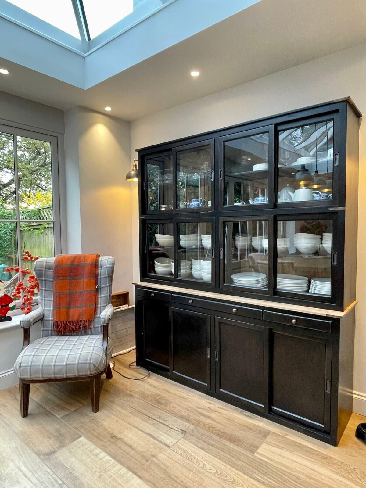 This kitchen forms part of a beautiful orangery extension built by the brilliant team at Malbrook Conservatories. Our first Orangery project, we wanted to make sure that the flow between the kitchen and the magnificent extension would be perfect. We spent a lot of time with the clients reviewing colour schemes and the layout of both spaces as it was essential that they would work as one seamless space. The kitchen has some superb storage with a magnificent double pantry with oak internals and a double larder with 5 large pull-out drawers. The shaker cabinetry is hand painted in Little Greene’s Livid and finished with a polished Nile Carrara quartz worktop. We painted the open units and inside the glazed units a contrasting shade of light blue to make an interesting feature. The most exquisite handmade Shaws of Darwen double sink with beautiful brass Perrin & Rowe taps complete the scheme. The space has been accessorised brilliantly with some rustic and industrial features with the addition of the lighting, railing sleeper beams and sliding door dresser unit.
