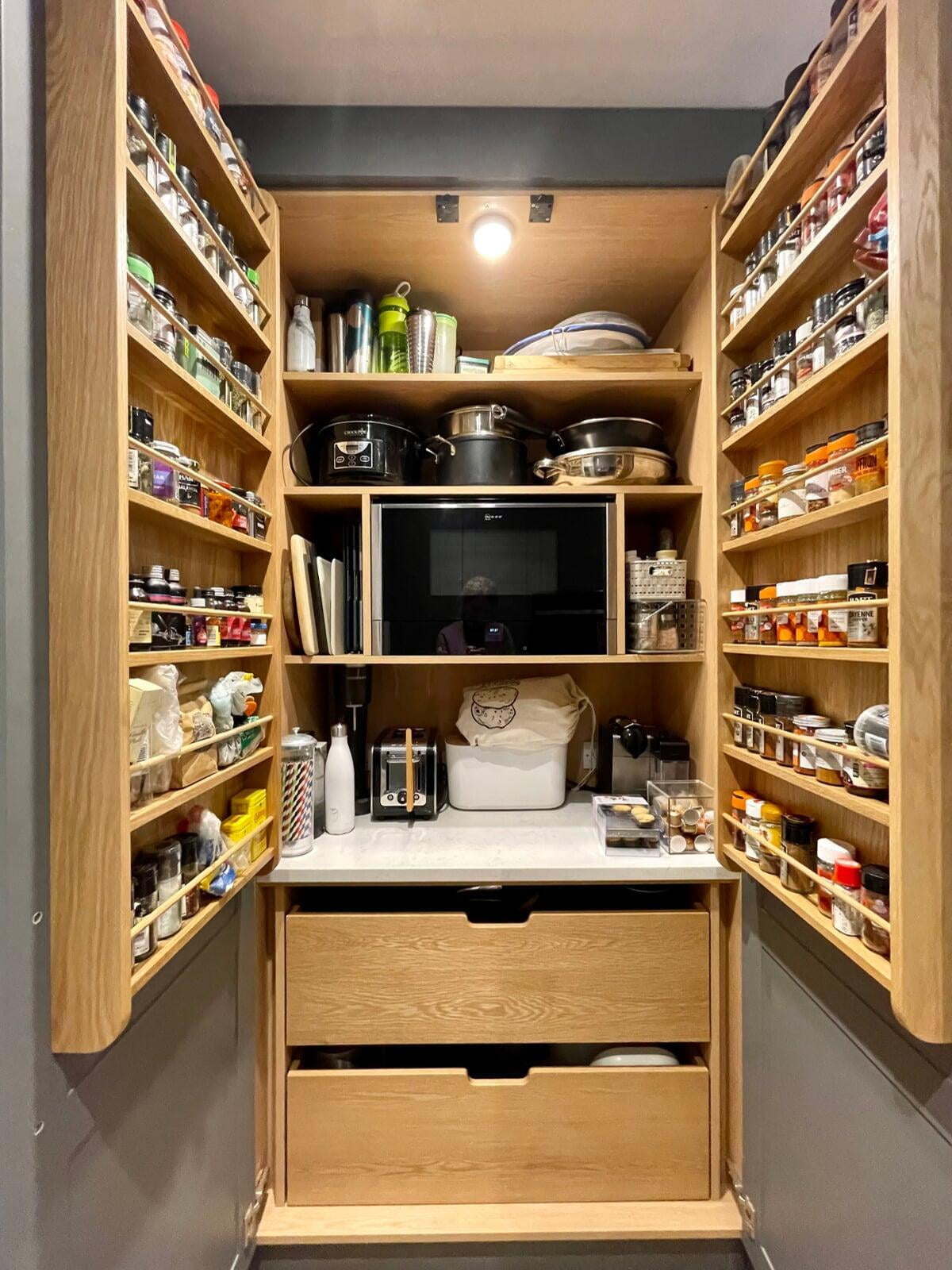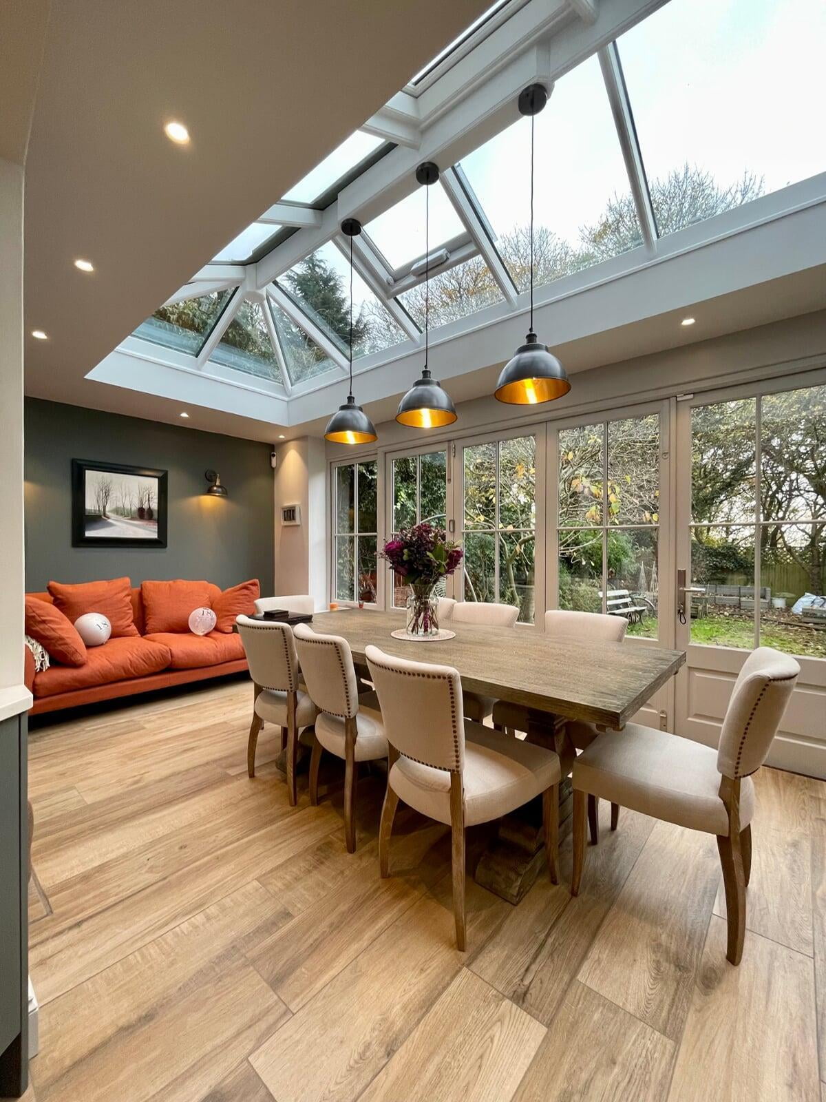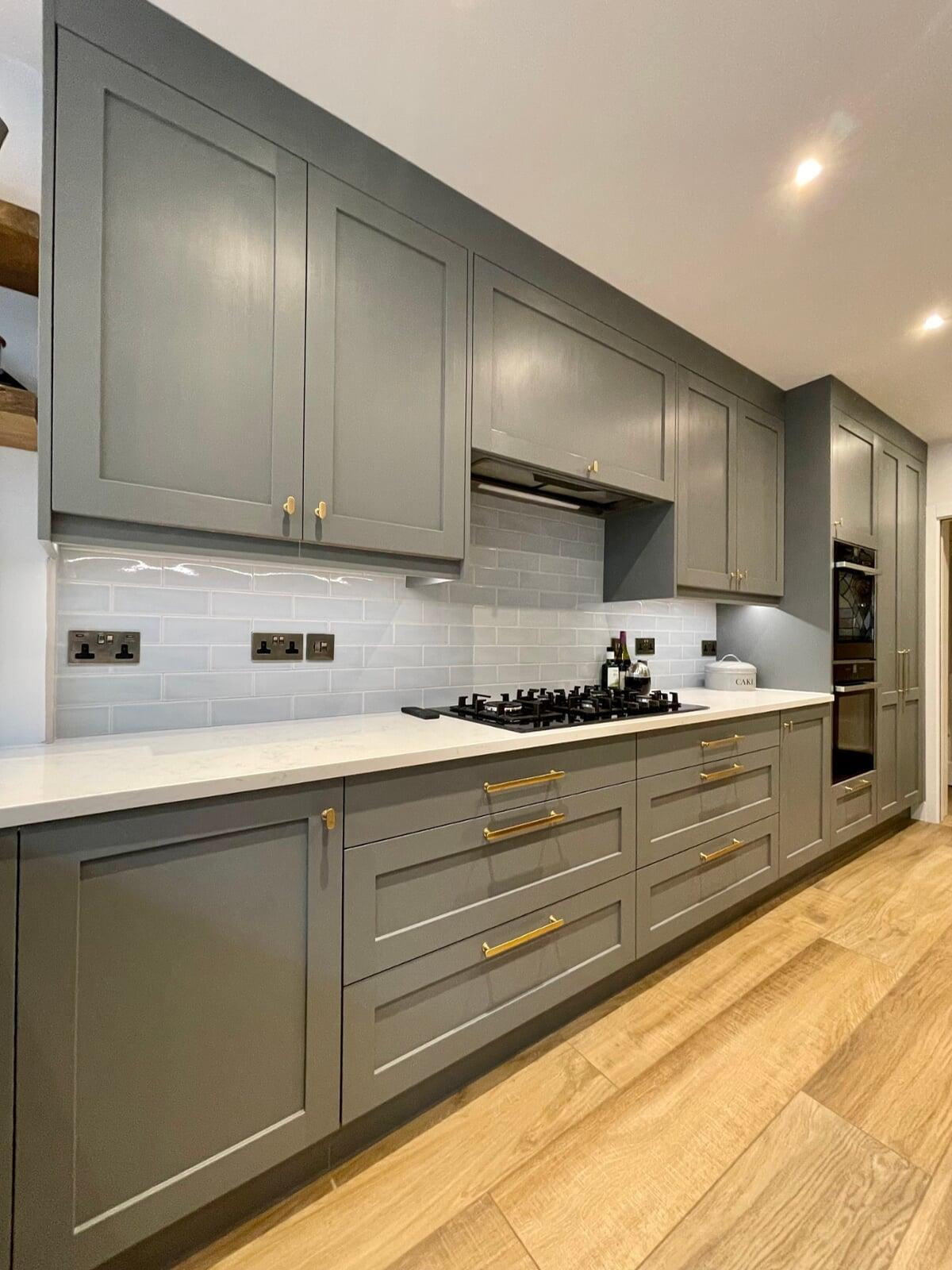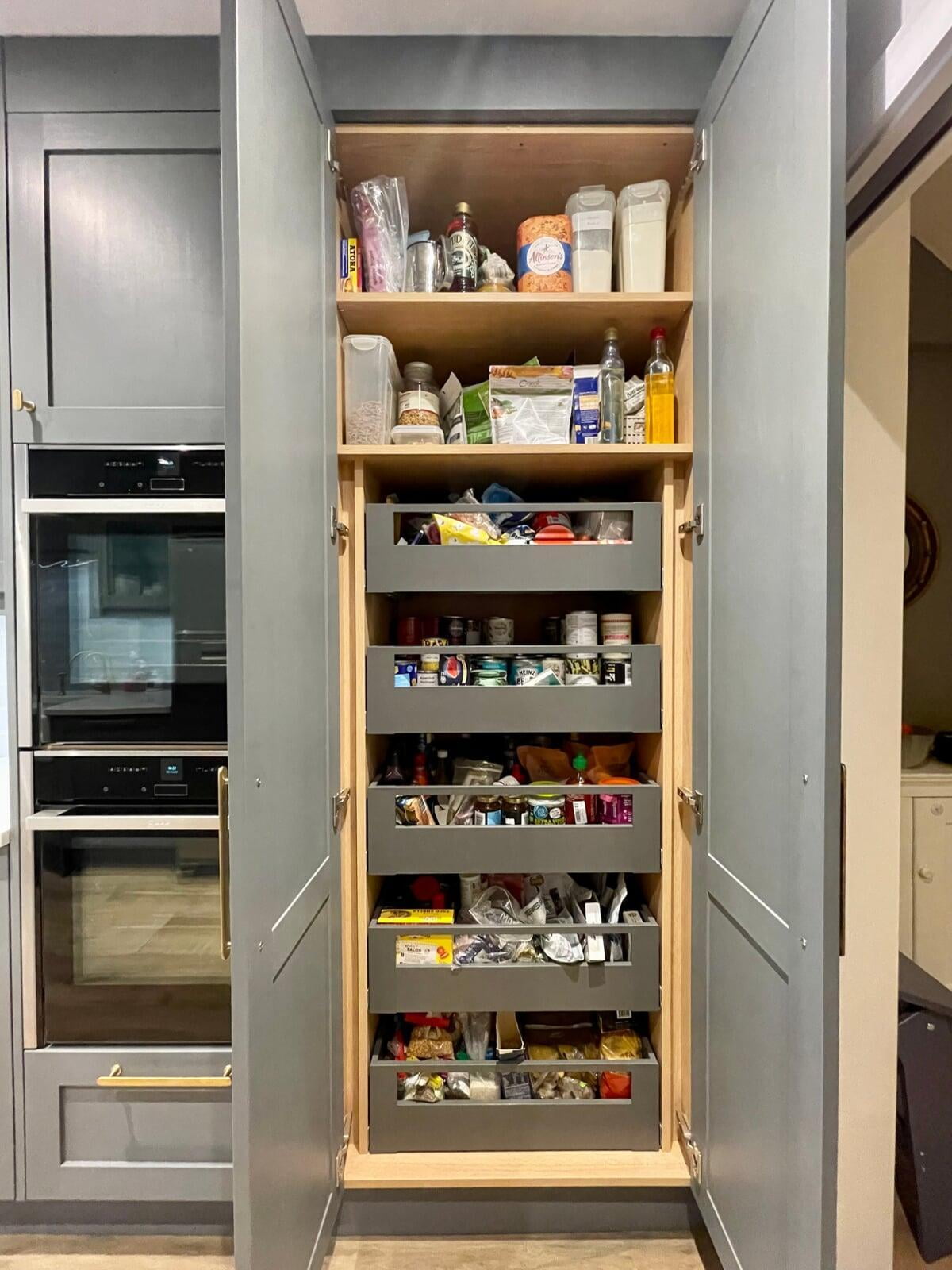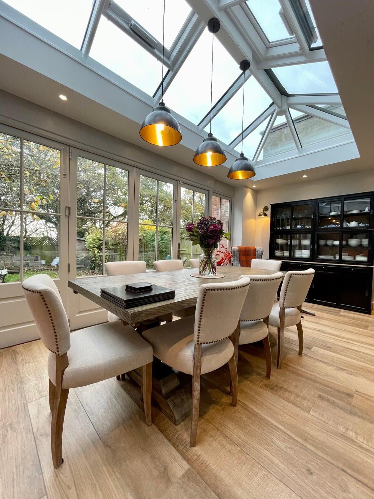 This kitchen forms part of a beautiful orangery extension built by the brilliant team at Malbrook Conservatories. Our first Orangery project, we wanted to make sure that the flow between the kitchen and the magnificent extension would be perfect. We spent a lot of time with the clients reviewing colour schemes and the layout of both spaces as it was essential that they would work as one seamless space. The kitchen has some superb storage with a magnificent double pantry with oak internals and a double larder with 5 large pull-out drawers. The shaker cabinetry is hand painted in Little Greene’s Livid and finished with a polished Nile Carrara quartz worktop. We painted the open units and inside the glazed units a contrasting shade of light blue to make an interesting feature. The most exquisite handmade Shaws of Darwen double sink with beautiful brass Perrin & Rowe taps complete the scheme. The space has been accessorised brilliantly with some rustic and industrial features with the addition of the lighting, railing sleeper beams and sliding door dresser unit.