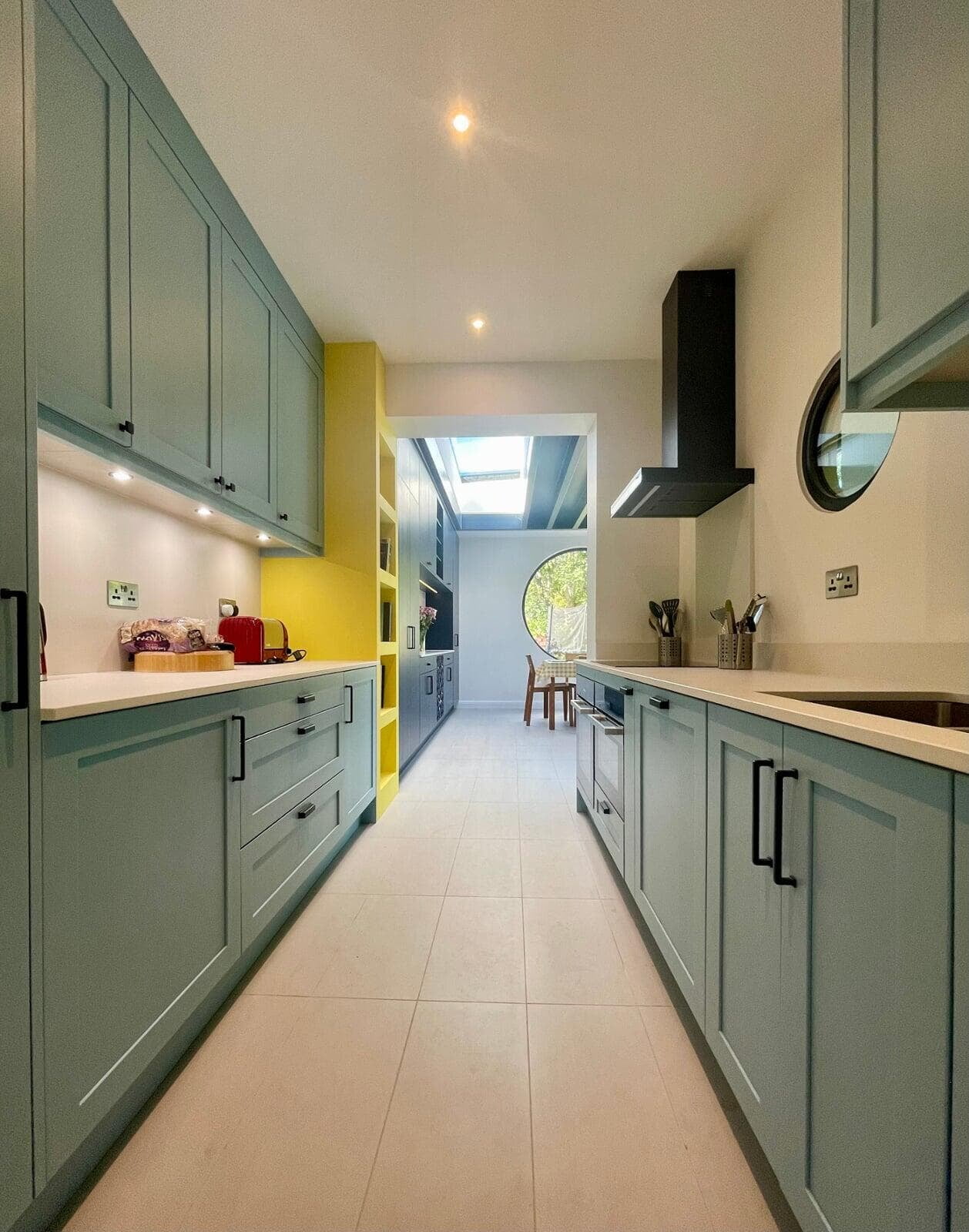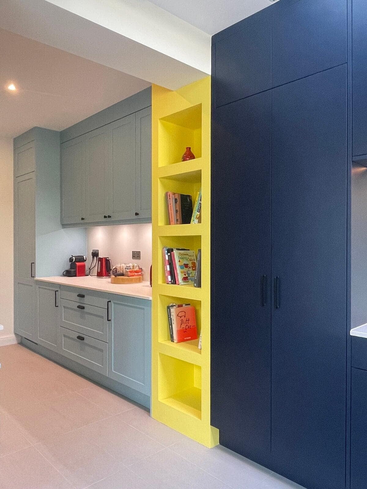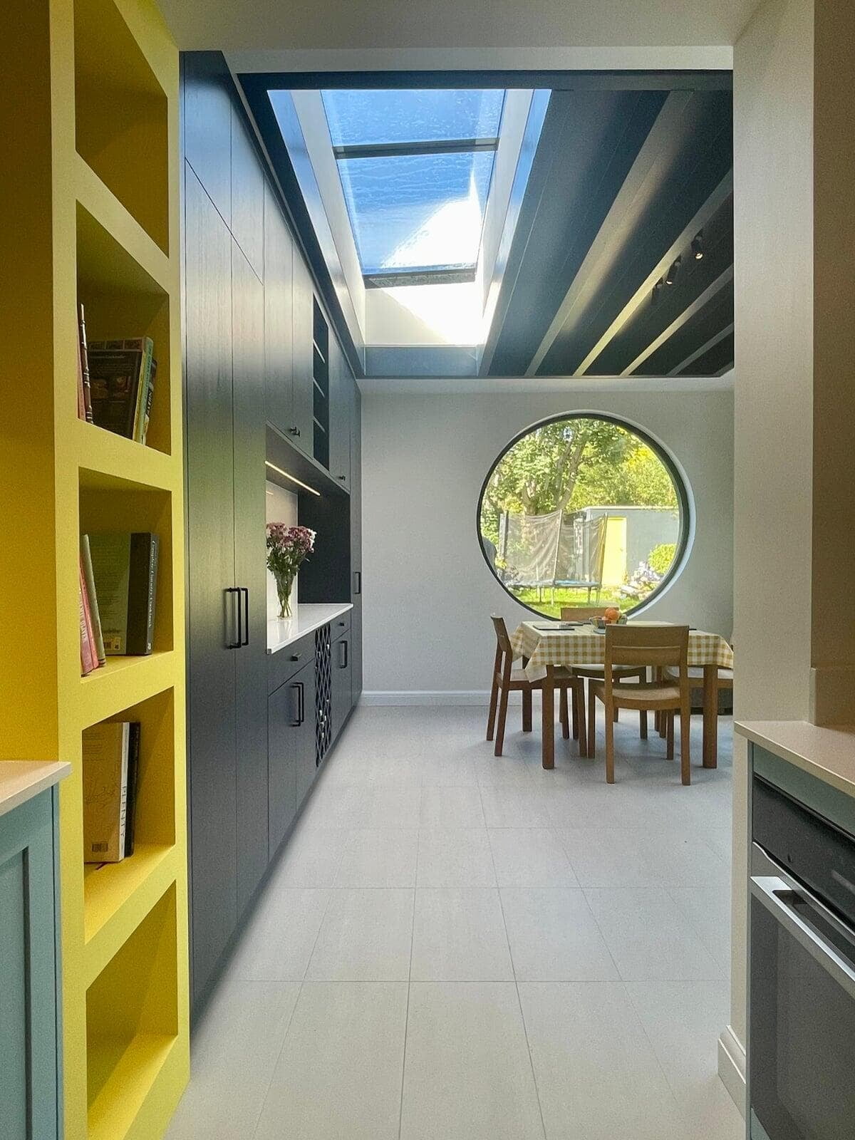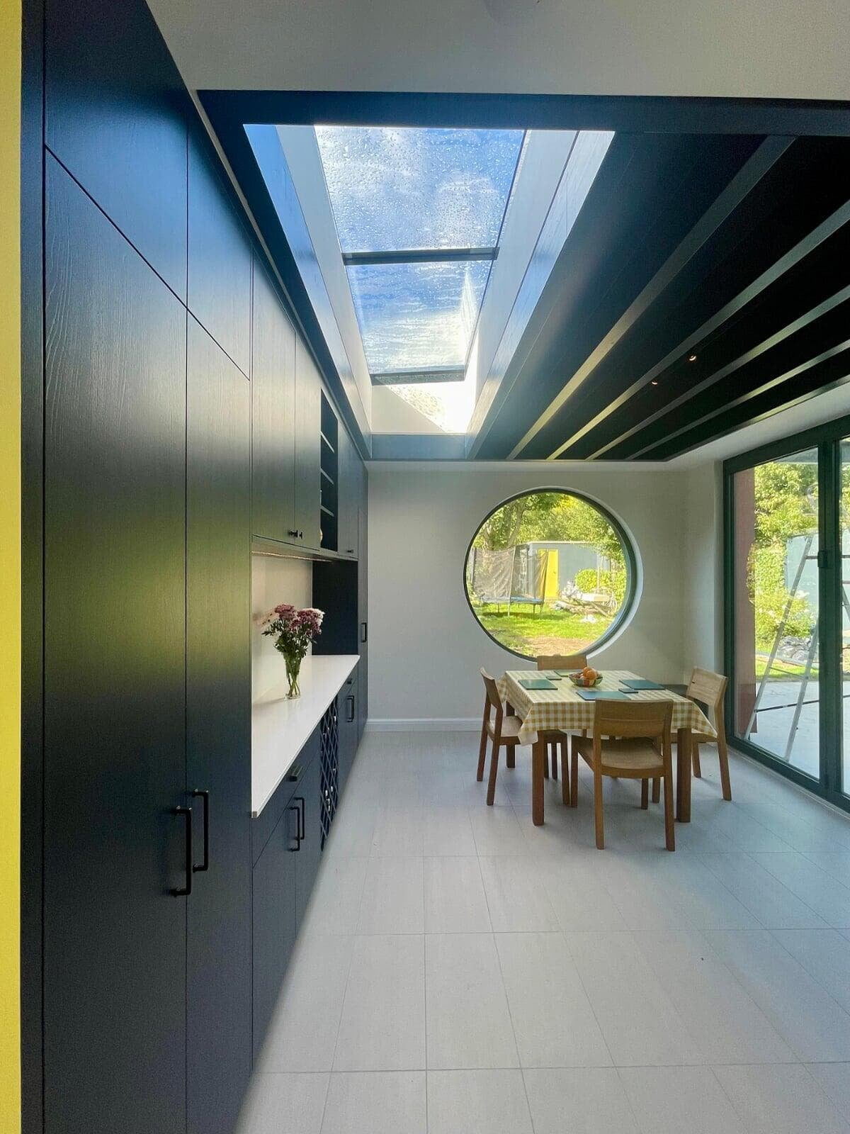 I really enjoyed being part of this project. My clients asked me to create a kitchen and separate dining space with an interesting feature to bridge together the two rooms which we did by making a bookcase with recessed shelves. Their architect had designed a very creative space with round windows and some unusual ceiling fins to mirror an outdoor pagoda. The dining room cabinetry perfectly aligns with the ceiling fins and skylight. The kitchen, while galley in shape and style, has been designed to maximise the efficiency of the storage and work surface and still compliment the unique round windows. I like the use of the different shades of blue in both sections and the dividing bookcase painted in a funky yellow shade. The overall layout, flow and use of colours makes for a fresh, happy and relaxed space.