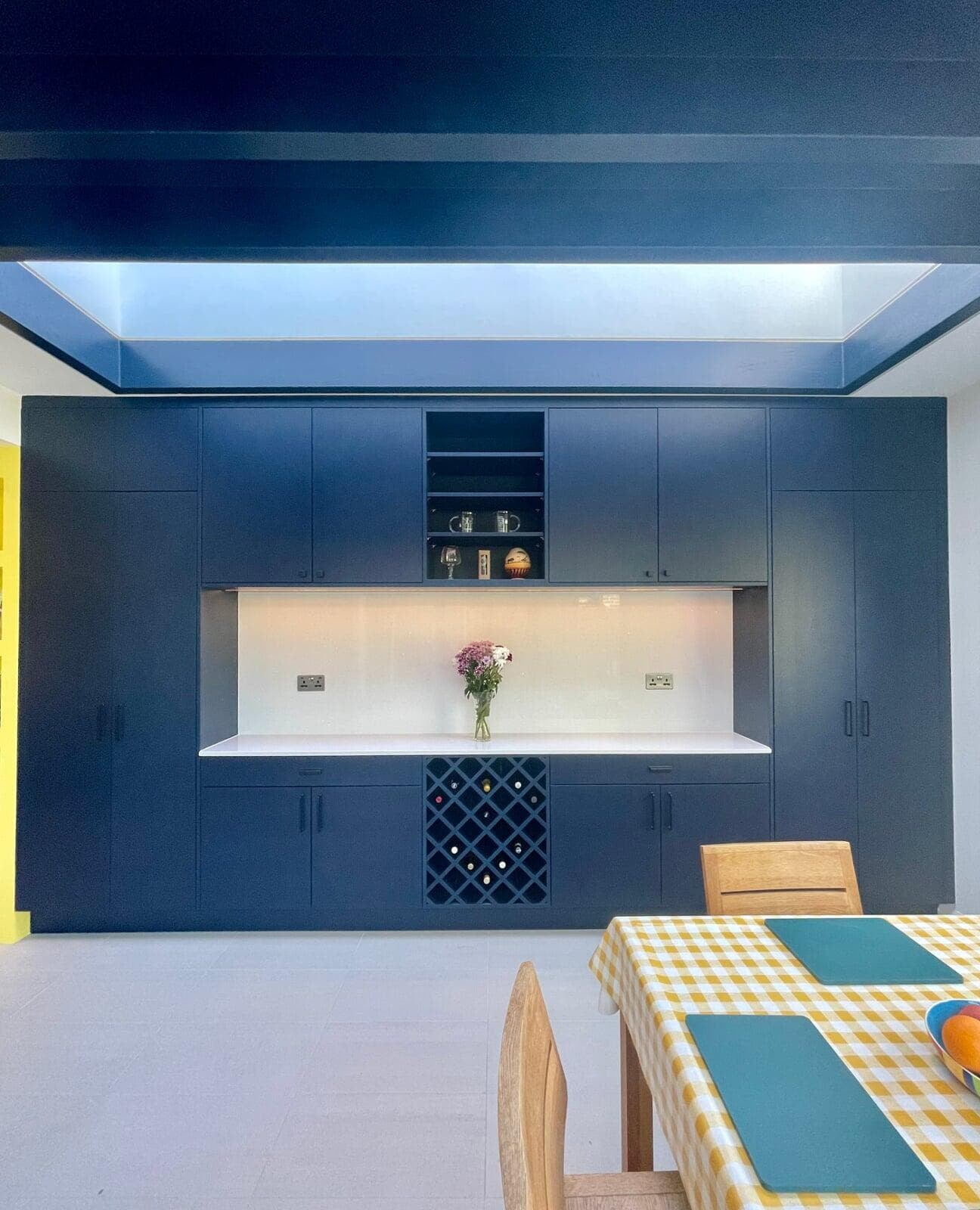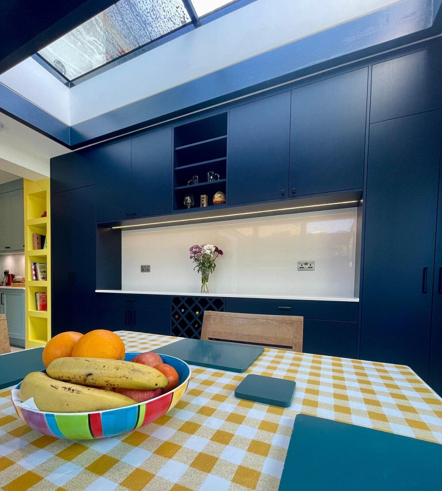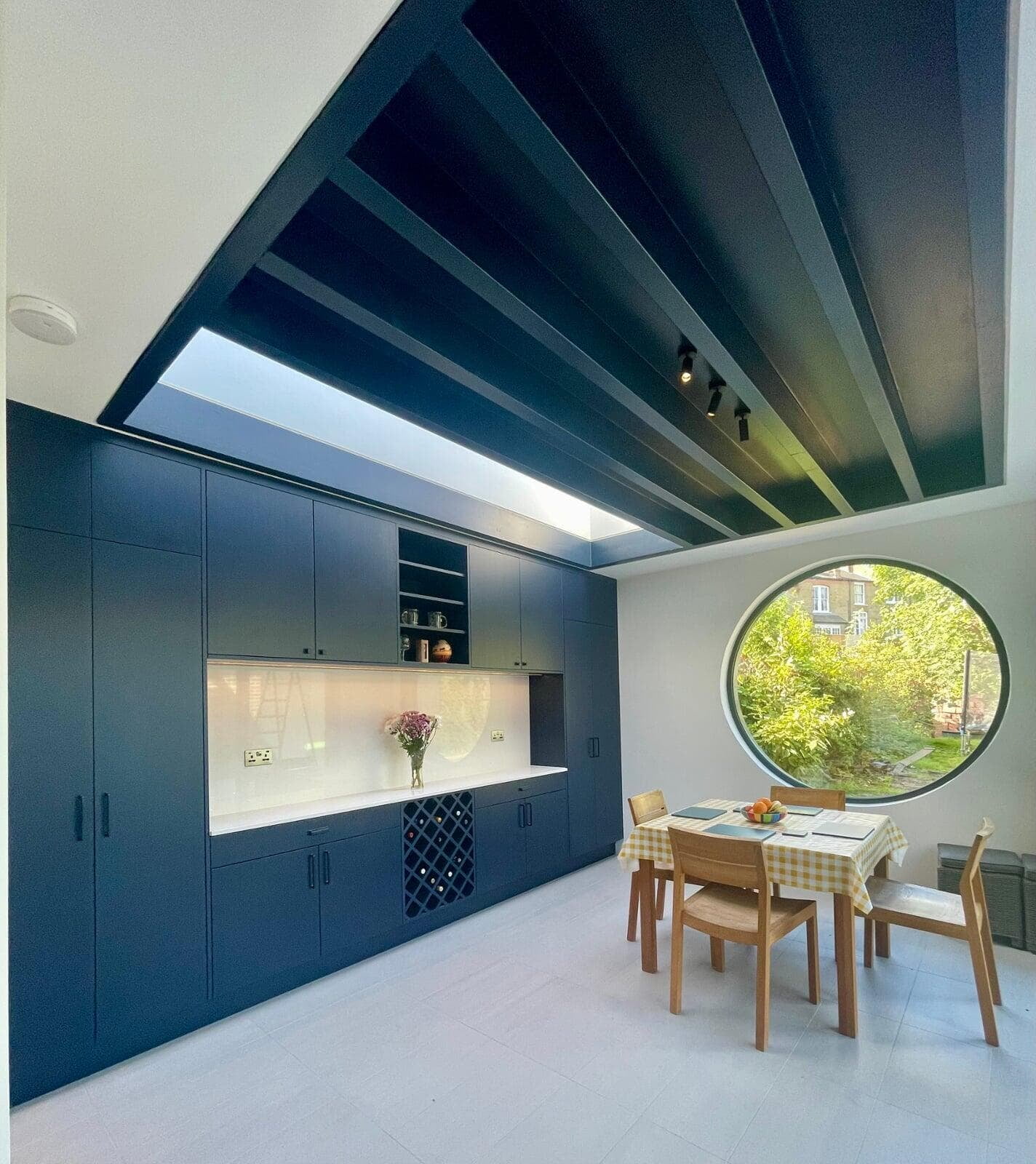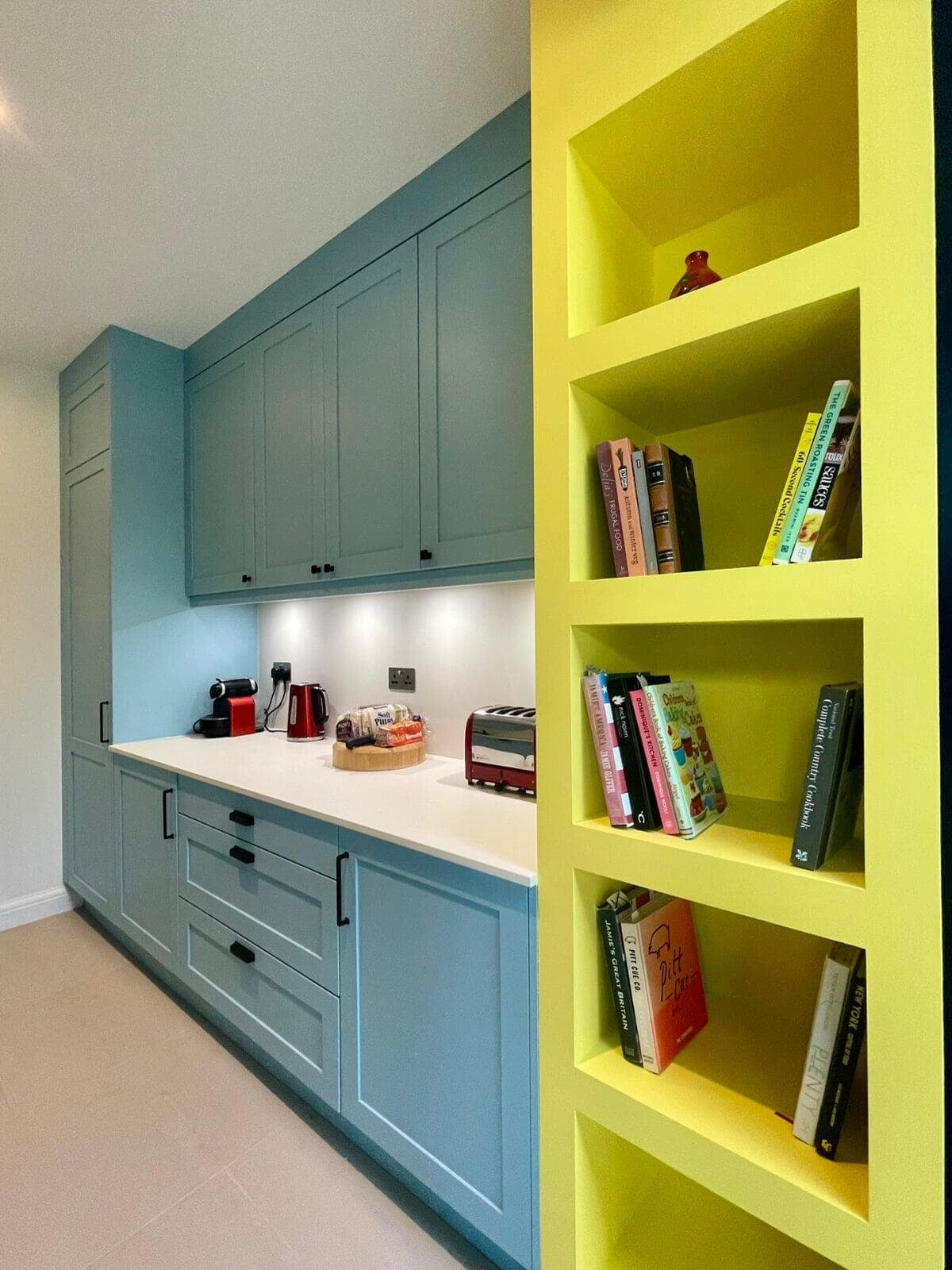 I really enjoyed being part of this project. My clients asked me to create a kitchen and separate dining space with an interesting feature to bridge together the two rooms which we did by making a bookcase with recessed shelves. Their architect had designed a very creative space with round windows and some unusual ceiling fins to mirror an outdoor pagoda. The dining room cabinetry perfectly aligns with the ceiling fins and skylight. The kitchen, while galley in shape and style, has been designed to maximise the efficiency of the storage and work surface and still compliment the unique round windows. I like the use of the different shades of blue in both sections and the dividing bookcase painted in a funky yellow shade. The overall layout, flow and use of colours makes for a fresh, happy and relaxed space.