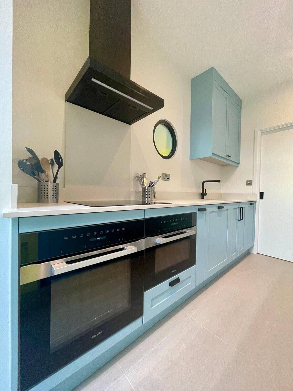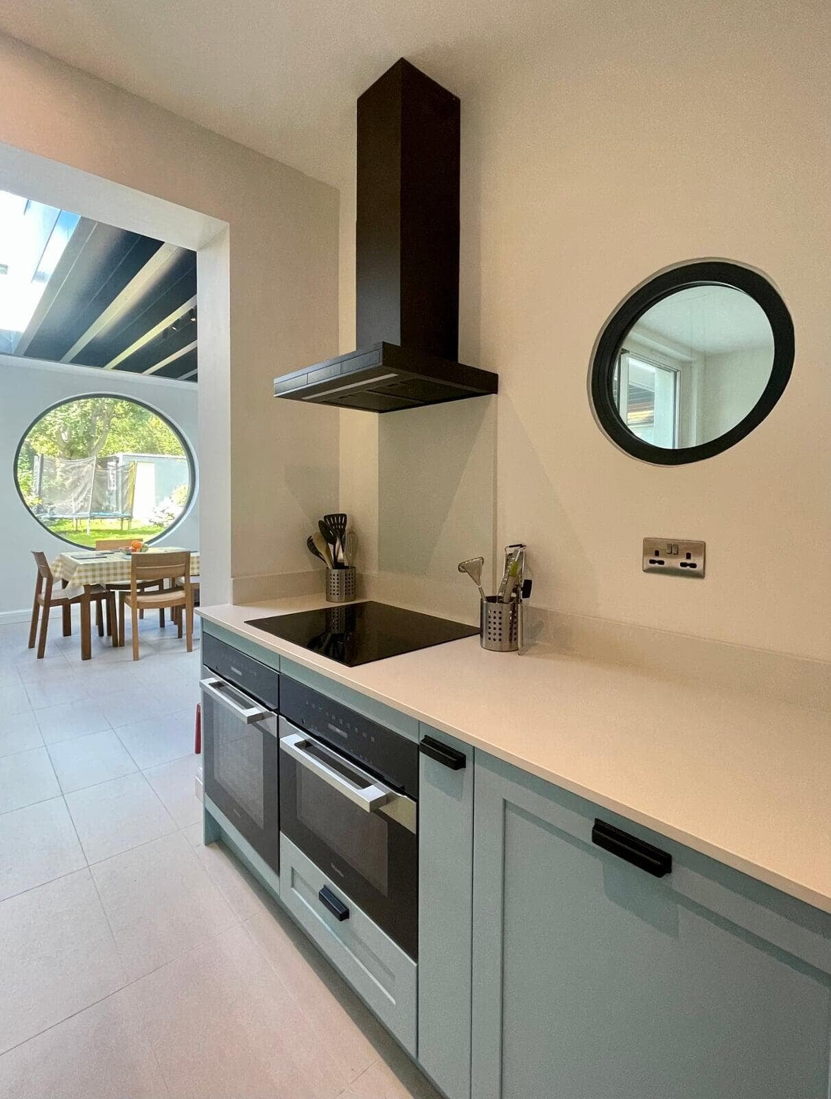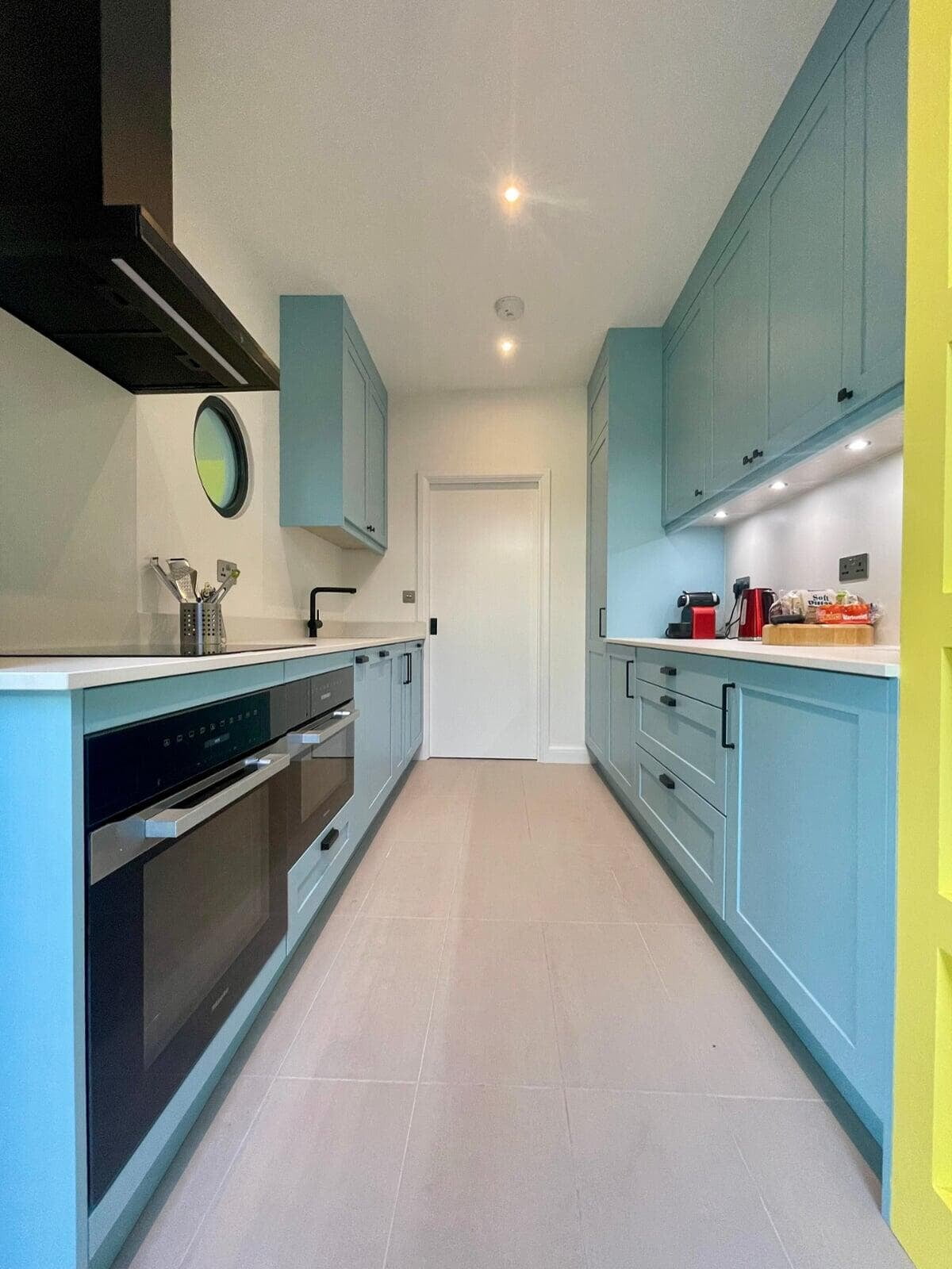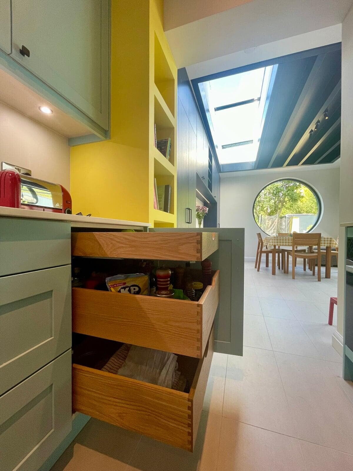 I really enjoyed being part of this project. My clients asked me to create a kitchen and separate dining space with an interesting feature to bridge together the two rooms which we did by making a bookcase with recessed shelves. Their architect had designed a very creative space with round windows and some unusual ceiling fins to mirror an outdoor pagoda. The dining room cabinetry perfectly aligns with the ceiling fins and skylight. The kitchen, while galley in shape and style, has been designed to maximise the efficiency of the storage and work surface and still compliment the unique round windows. I like the use of the different shades of blue in both sections and the dividing bookcase painted in a funky yellow shade. The overall layout, flow and use of colours makes for a fresh, happy and relaxed space.