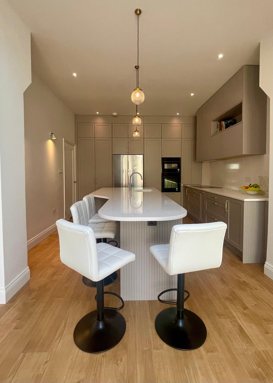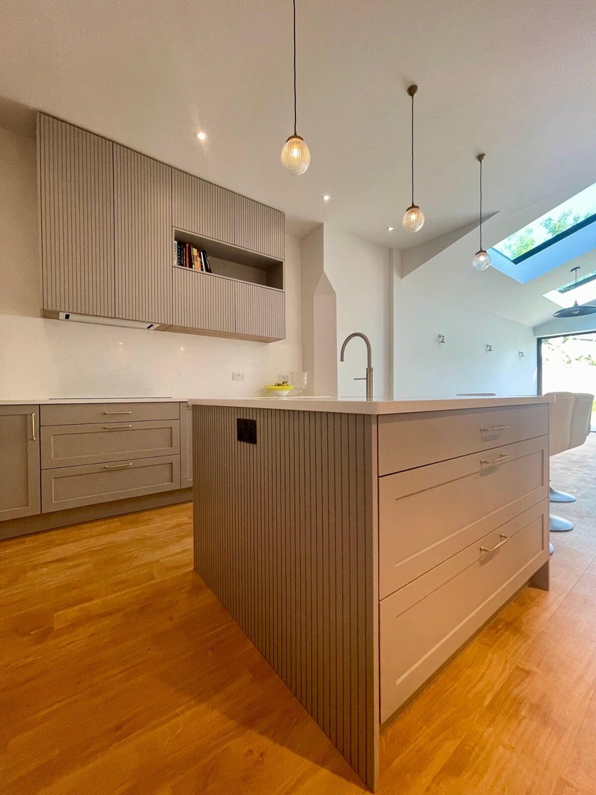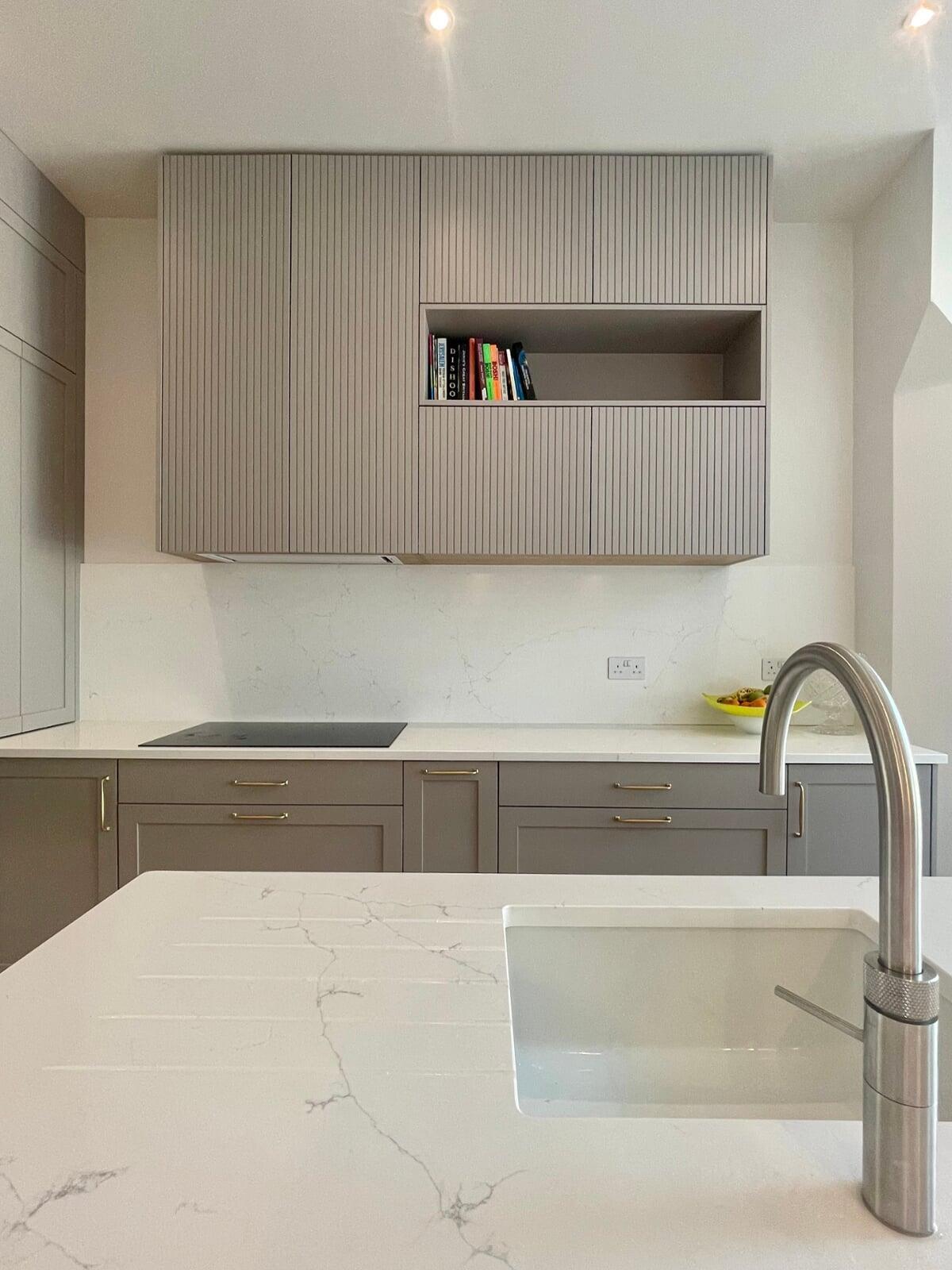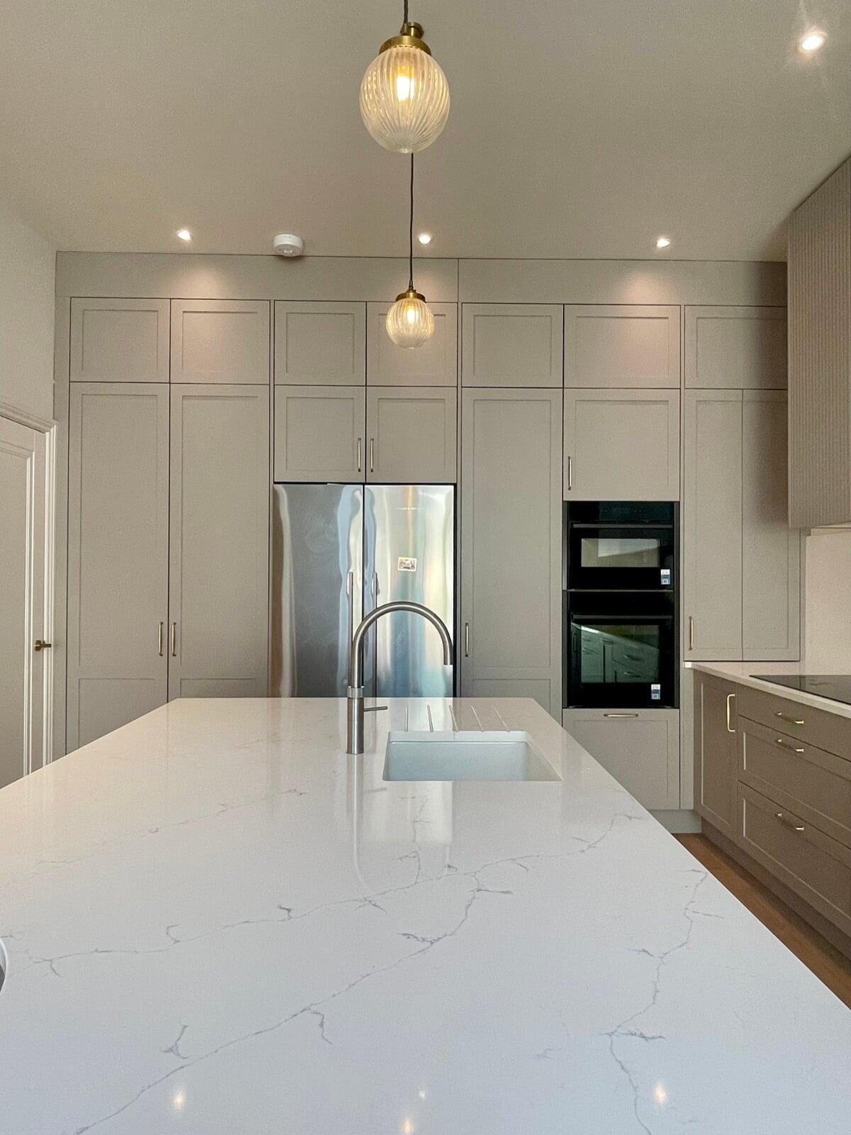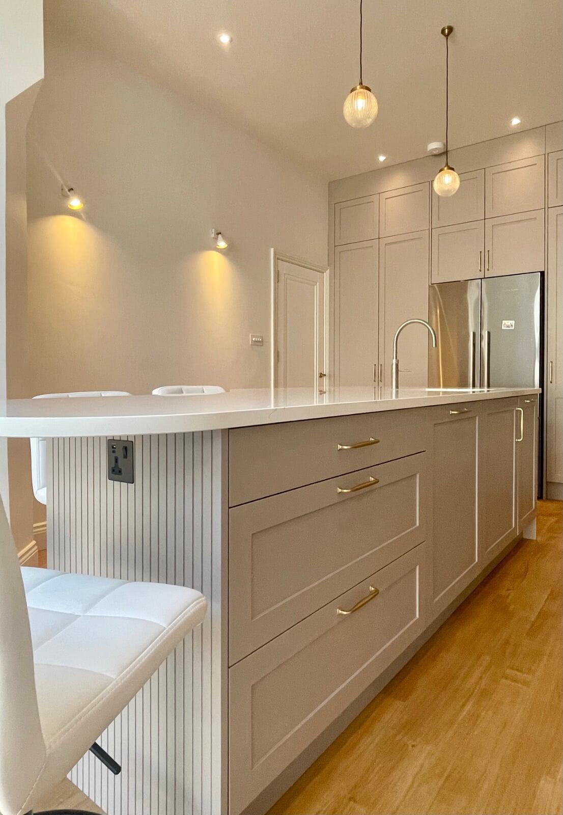 I loved working on this kitchen which formed part of a large-scale renovation project. The layout of this room was a little complicated with some unmoveable pillars being awkwardly positioned in the room. My design ethos is to always let your space dictate the layout and flow and in this case that was particularly important to do. It became clear that a kitchen island with a unique shape would be a fabulous design feature and perfectly suit the shape of the room. What presented itself initially as a challenge has in fact become the best part of the whole kitchen. By incorporating some skinny tongue & groove end panels in the island which we also used on some of the wall units, you have such an interesting and modern take on a shaker kitchen where the grand island looks like a piece of art. We also utilised masses of useful storage in the kitchen and took the cabinetry all the way to the very high ceilings. My clients have told me they are struggling to fill all the cupboards which is the best position to be in! We painted the cabinetry in a soft hue called Perennial Grey by Little Greene and added a very pretty Cimstone quartz with delicate veining. The entire kitchen is beautiful and my clients are delighted with their dream kitchen.