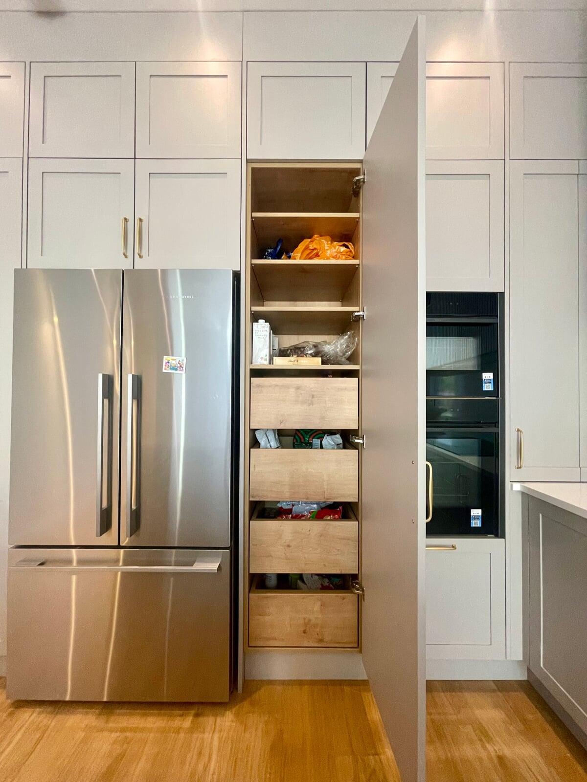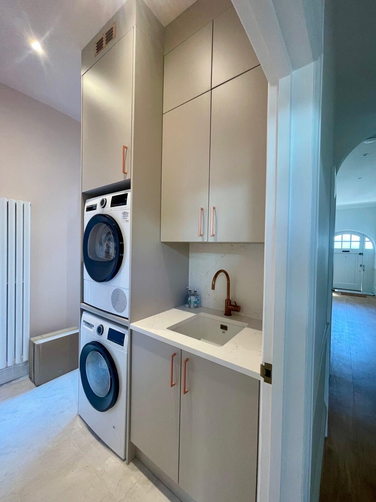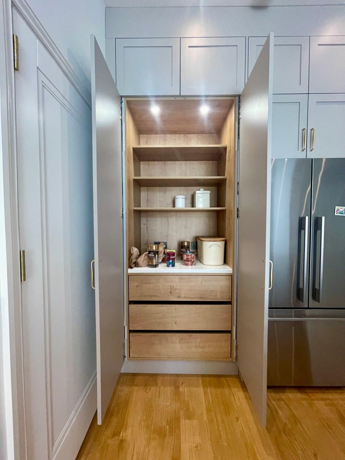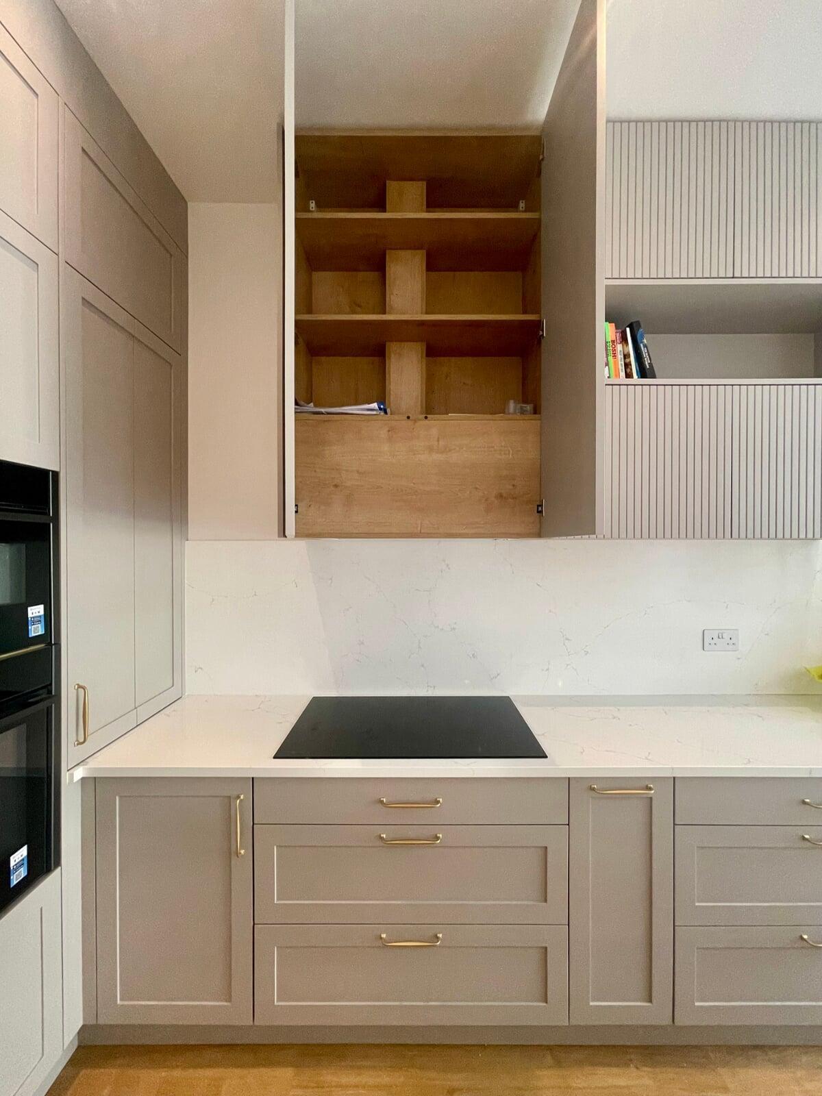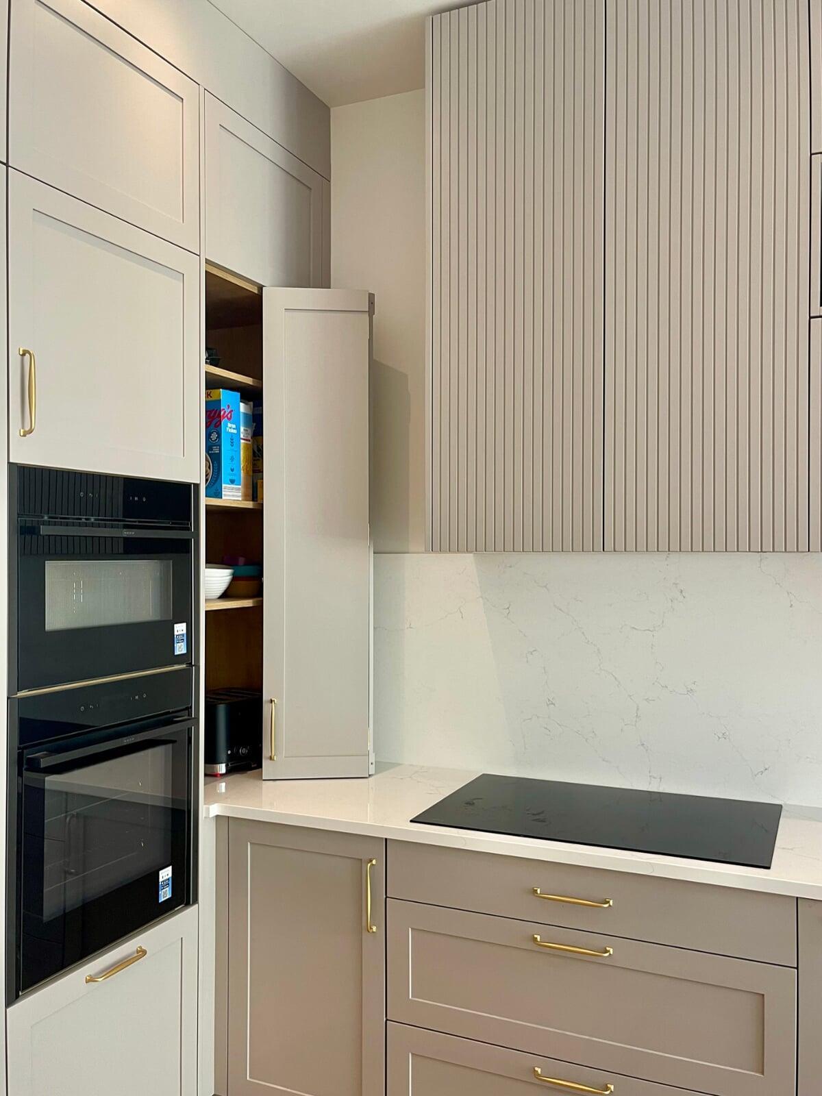 I loved working on this kitchen which formed part of a large-scale renovation project. The layout of this room was a little complicated with some unmoveable pillars being awkwardly positioned in the room. My design ethos is to always let your space dictate the layout and flow and in this case that was particularly important to do. It became clear that a kitchen island with a unique shape would be a fabulous design feature and perfectly suit the shape of the room. What presented itself initially as a challenge has in fact become the best part of the whole kitchen. By incorporating some skinny tongue & groove end panels in the island which we also used on some of the wall units, you have such an interesting and modern take on a shaker kitchen where the grand island looks like a piece of art. We also utilised masses of useful storage in the kitchen and took the cabinetry all the way to the very high ceilings. My clients have told me they are struggling to fill all the cupboards which is the best position to be in! We painted the cabinetry in a soft hue called Perennial Grey by Little Greene and added a very pretty Cimstone quartz with delicate veining. The entire kitchen is beautiful and my clients are delighted with their dream kitchen.